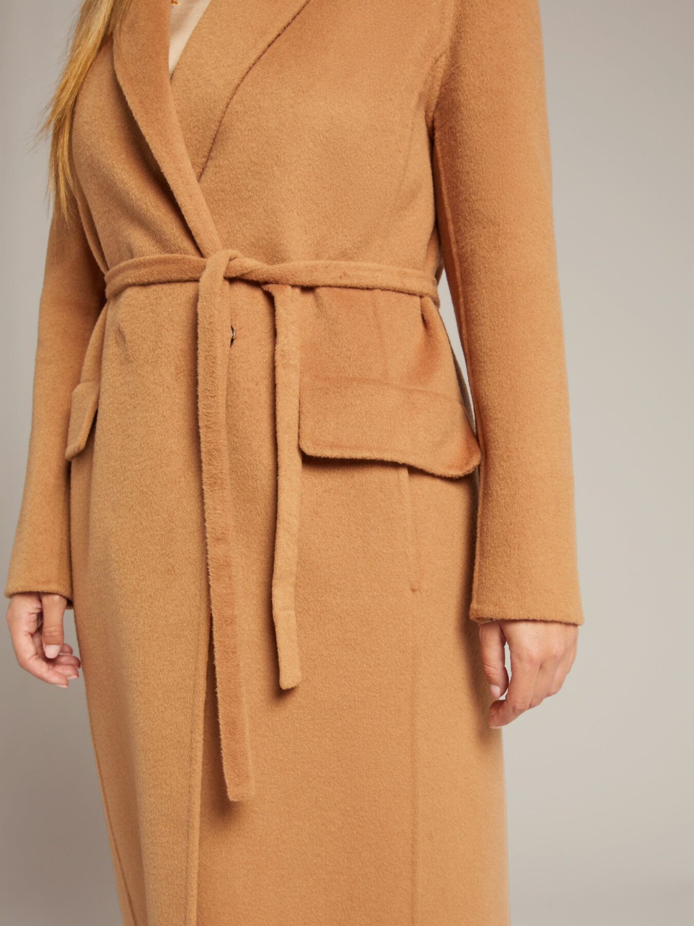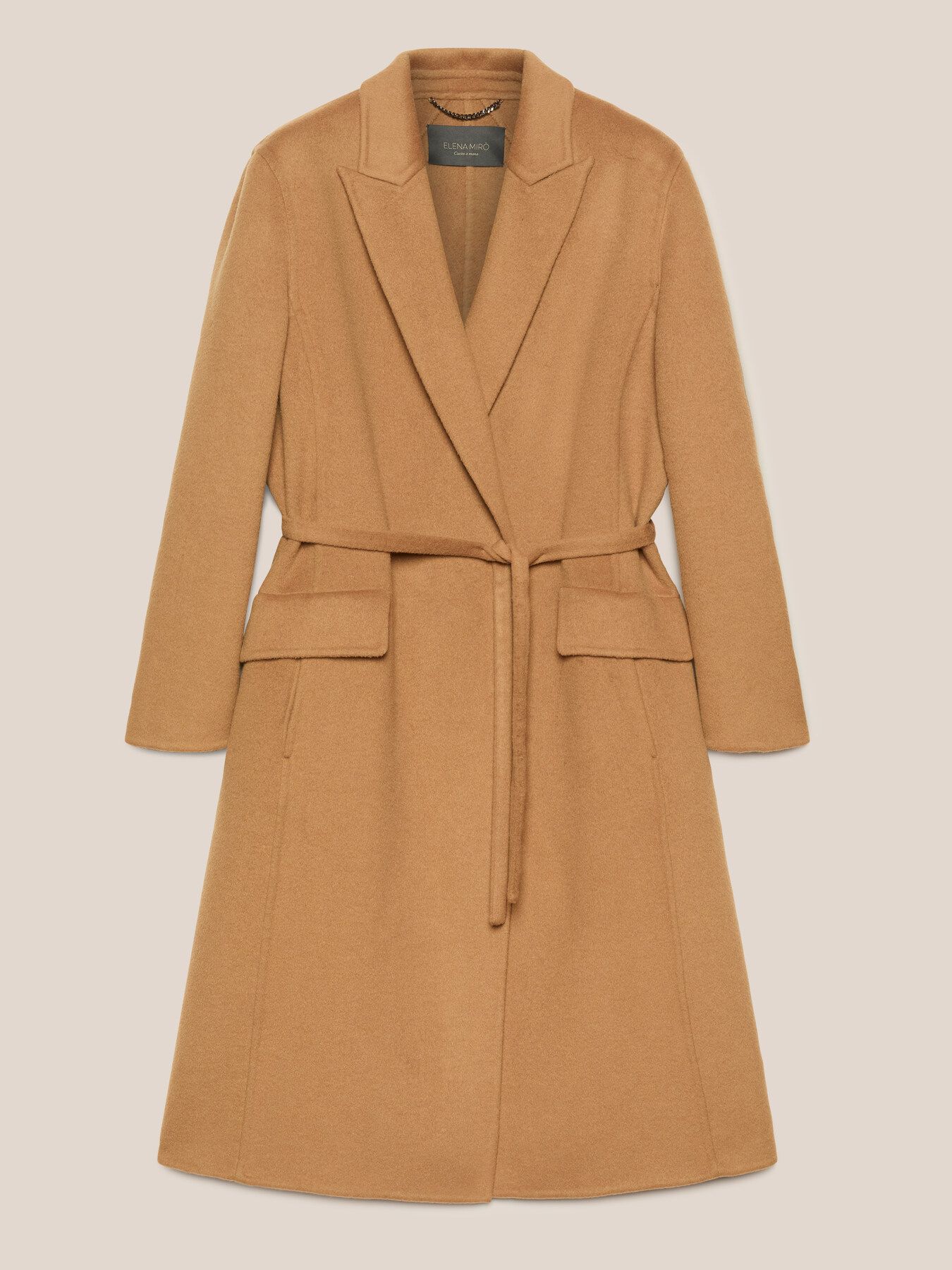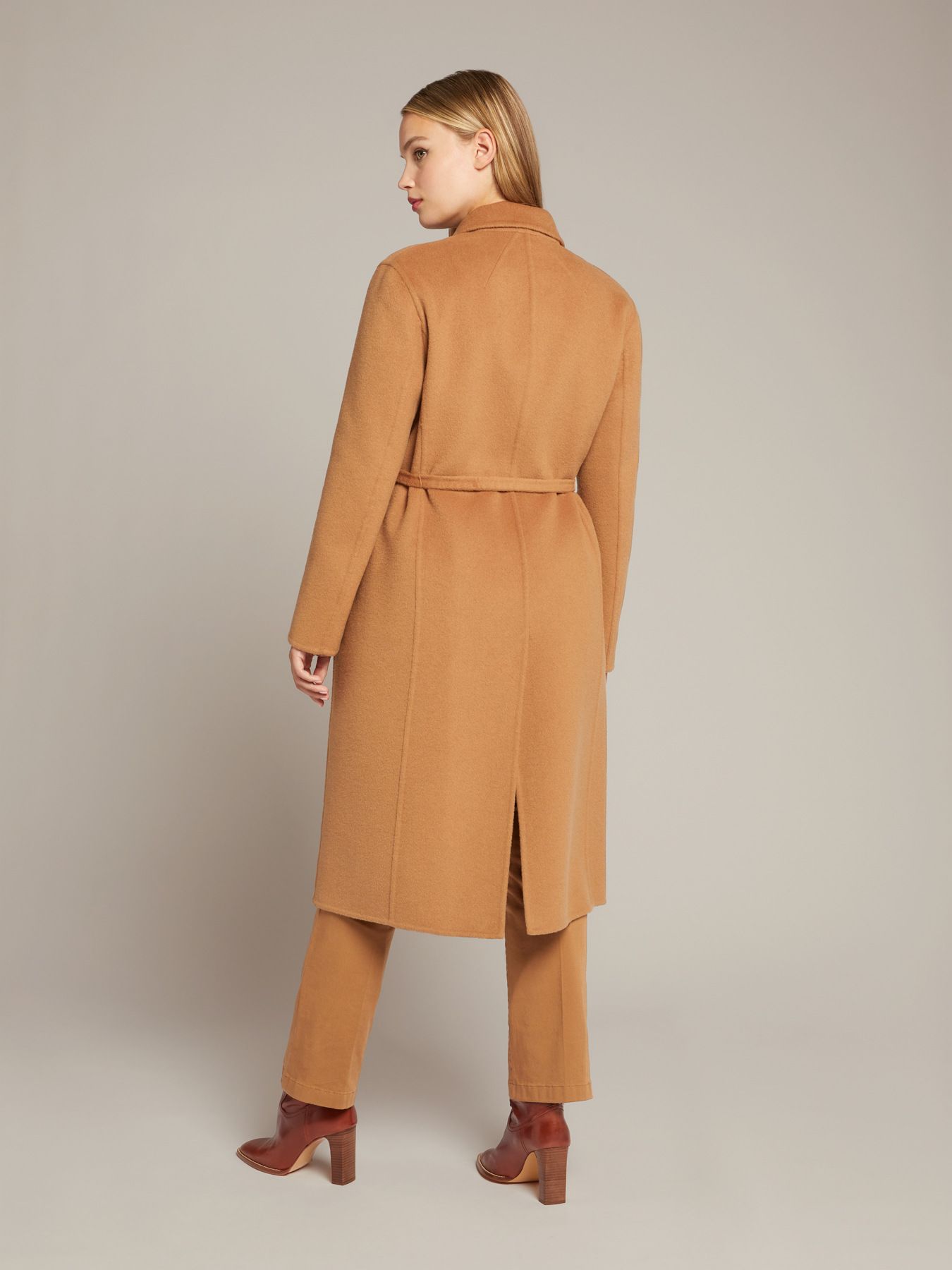 Элегантное однобортное пальто из ткани-дубле ручной работы. Прямой силуэт, английский воротник с лацканами, вшивные карманы с клапанами. Застегивается на кнопки, при желании может быть затянуто на талии съемным поясом. Без подкладки.