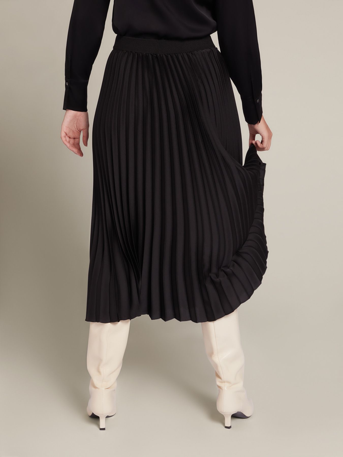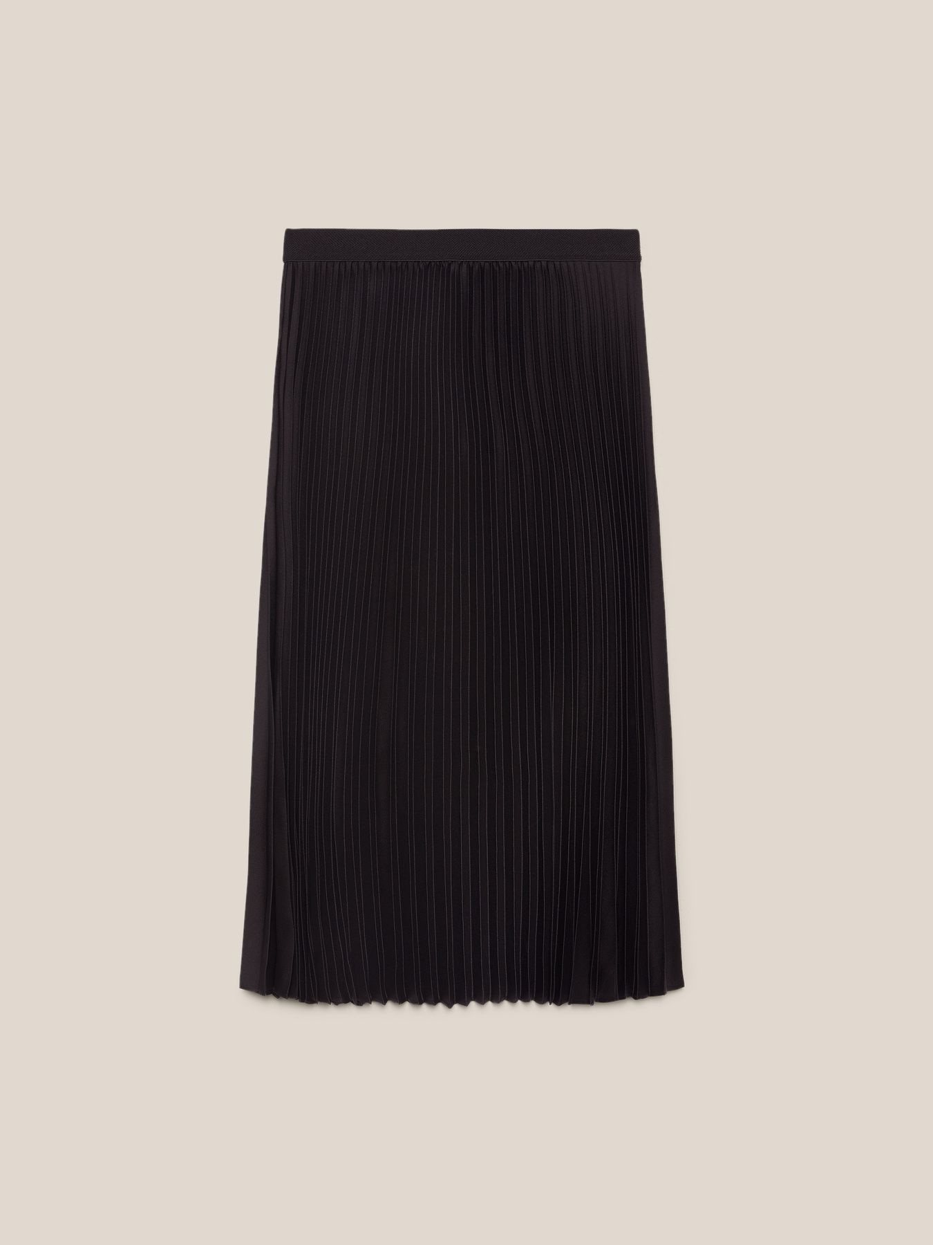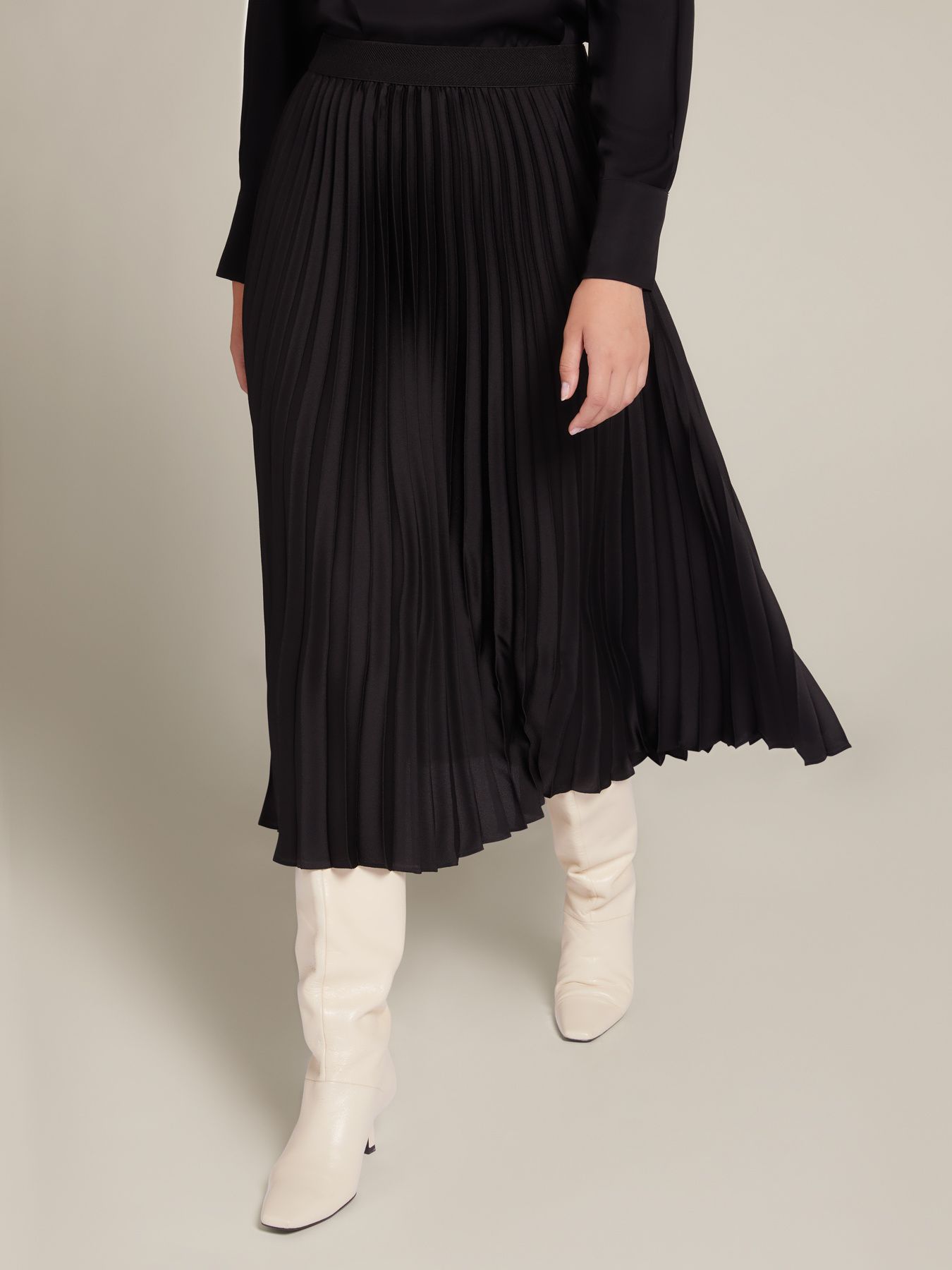 Элегантная юбка-плиссе из струящегося атласа. Длина миди, стандартная линия талии, пояс на резинке. Идеально подходит как на каждый день, так и для особых случаев. Без подкладки.