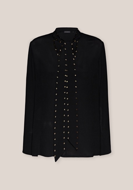 Блузка из крепдешина с шарфом, изысканная и элегантная. Изделие украшено заклёпками с ромбовидной огранкой. V-образный вырез и длинные рукава с разрезами на манжетах