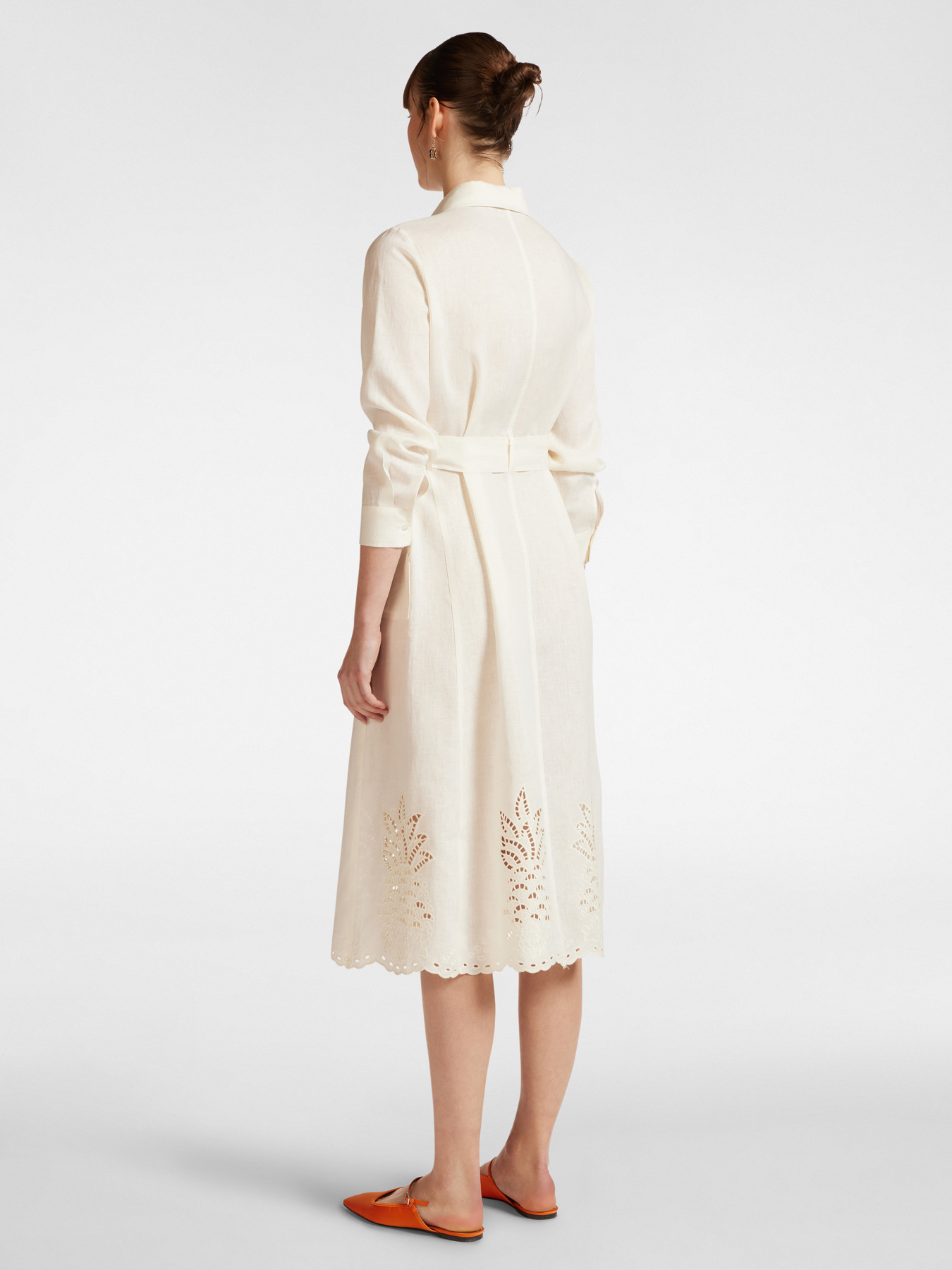 Платье-рубашка из 100% льна. Расклешенный крой, рукава длиной три четверти, английская вышивка. Идеально подходит для создания повседневных и комфортных летних образов.