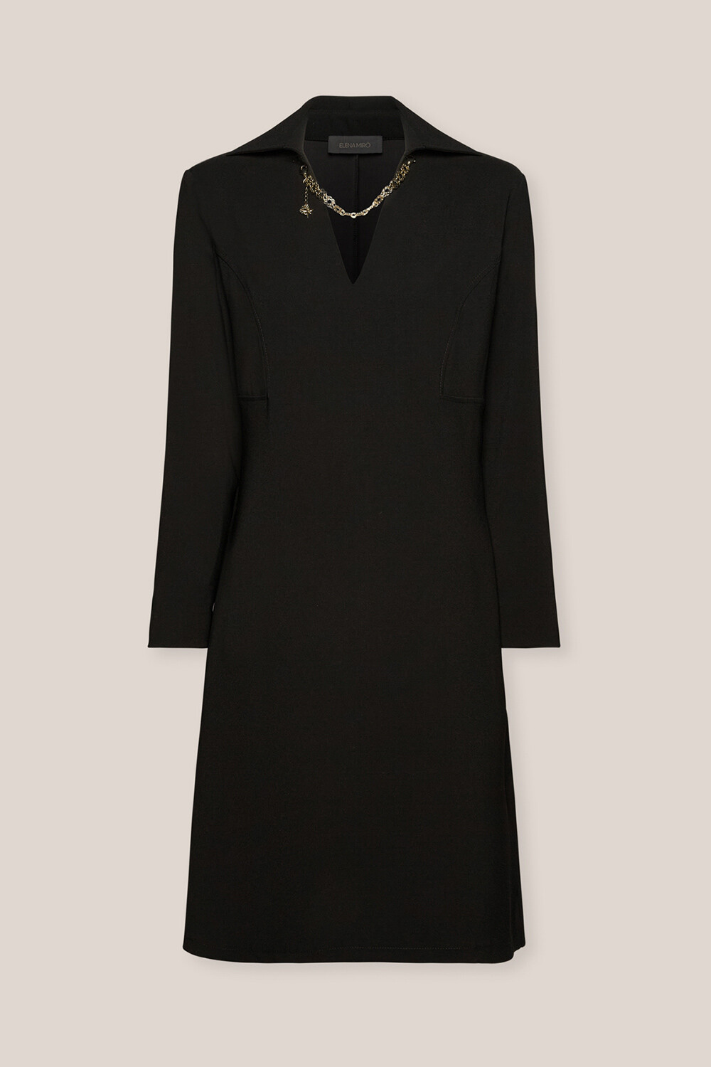 Платье А-силуэта из прочного эластичного крепа с V-образным вырезом, украшенное ожерельем с монограммой. Женственное и современное изделие на каждый день.