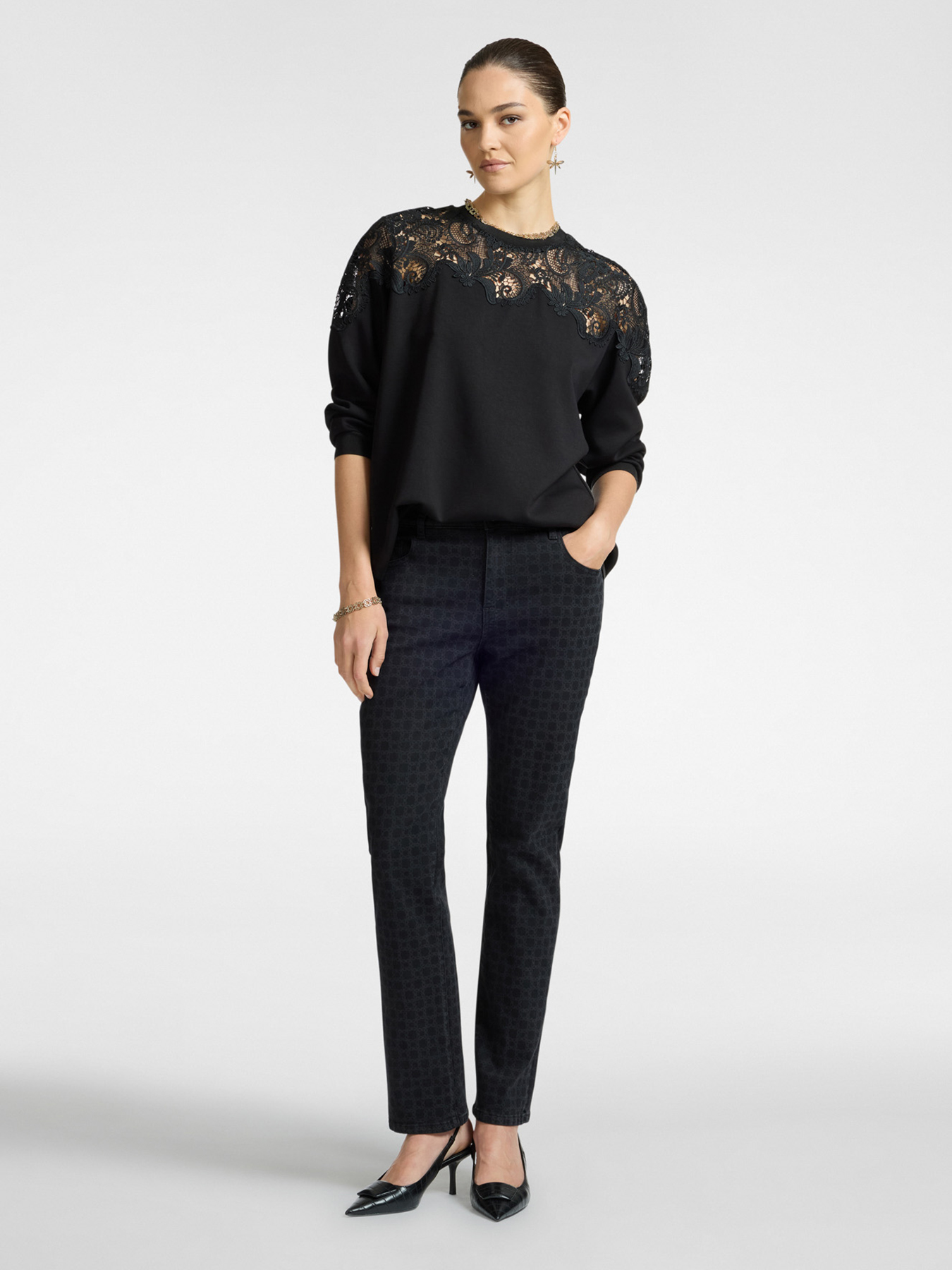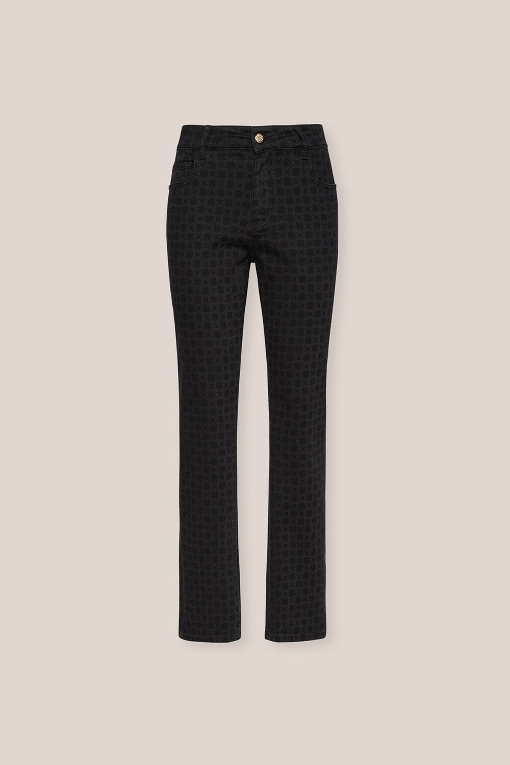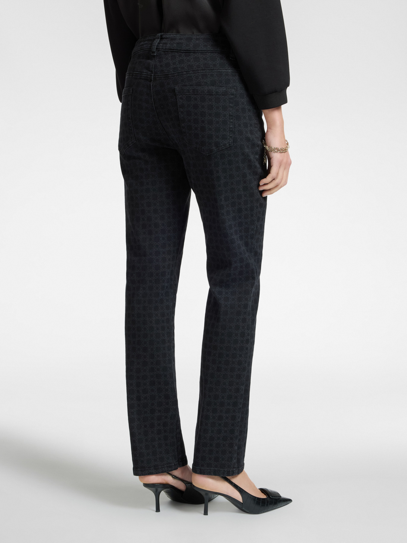 Джинсы с 5 карманами из черного эластичного денима. Украшены оригинальным узором в виде монограммы бренда, выполненным лазерной резкой. Яркое, узнаваемое изделие, воплощающее подход Miro. Идеальный вариант для повседневных образов.