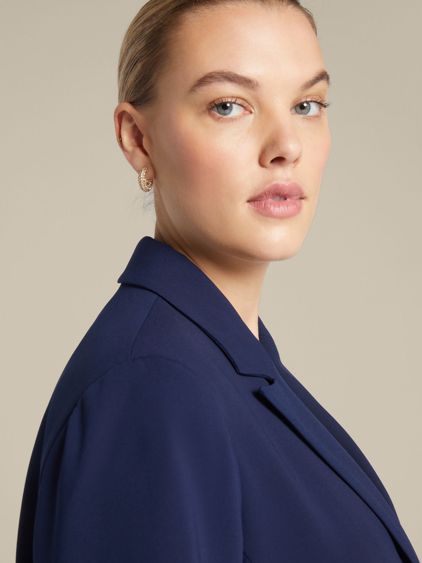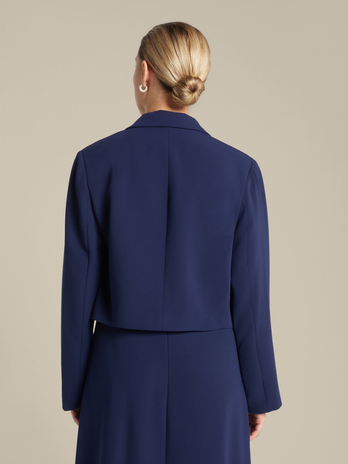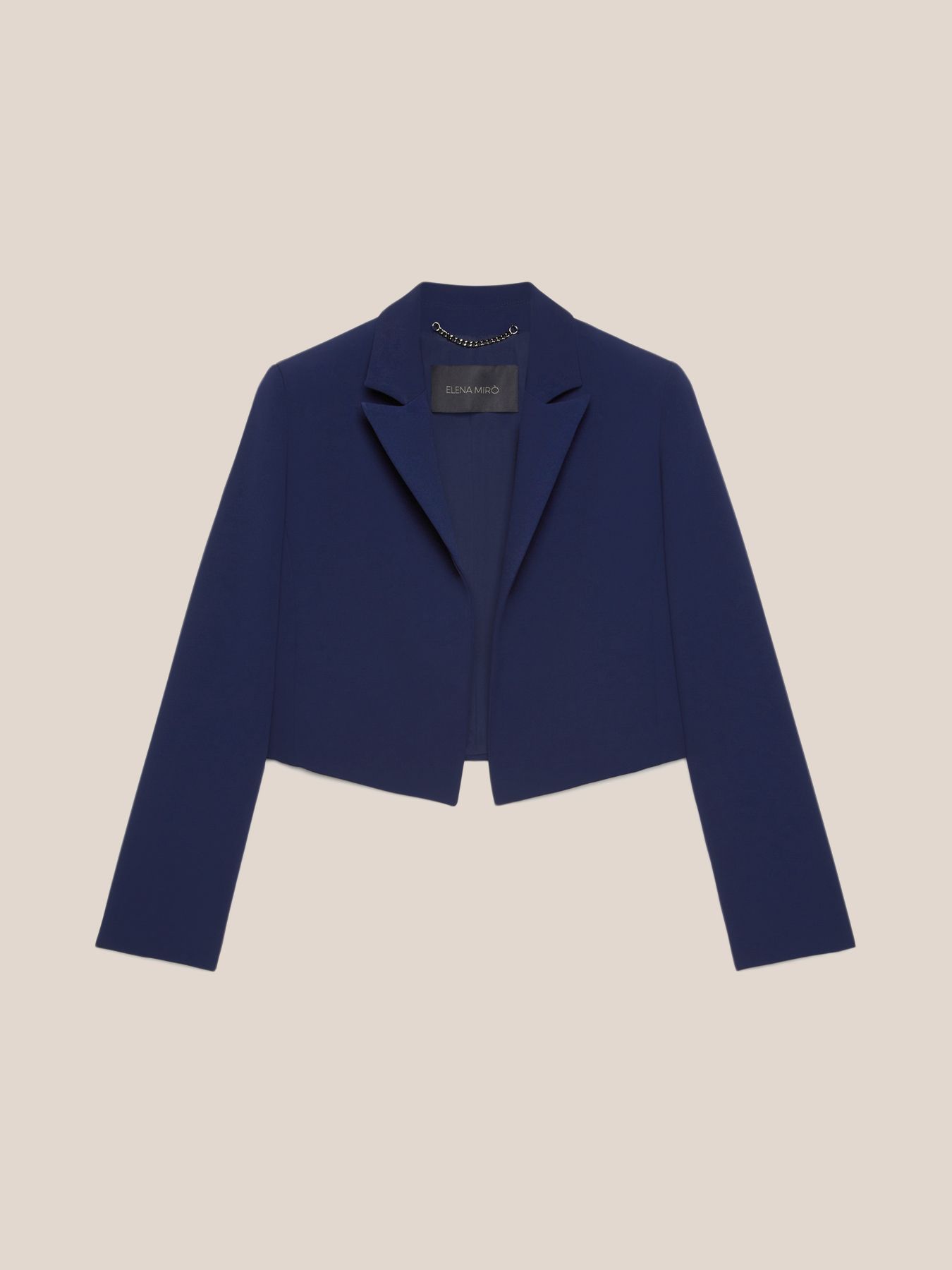 Элегантный укороченный жакет из эластичной кади. Женственный и приталенный крой, эластичная подкладка, воротник с лацканами. Универсальный элемент одежды, который идеально сочетается с платьями и брючными костюмами.