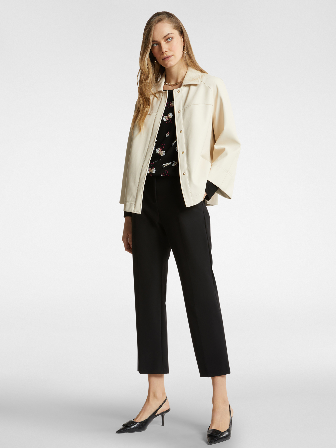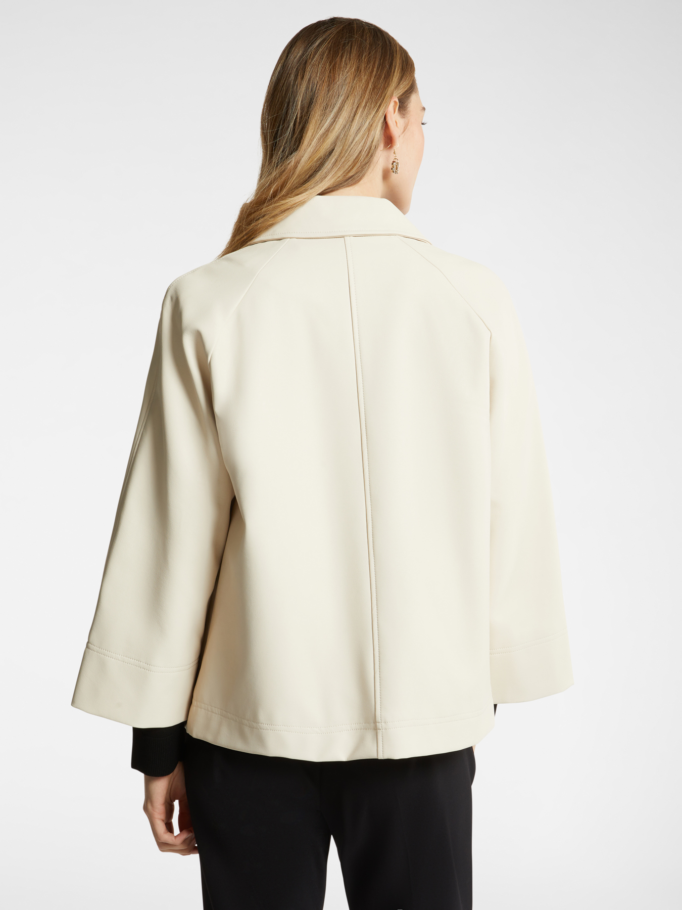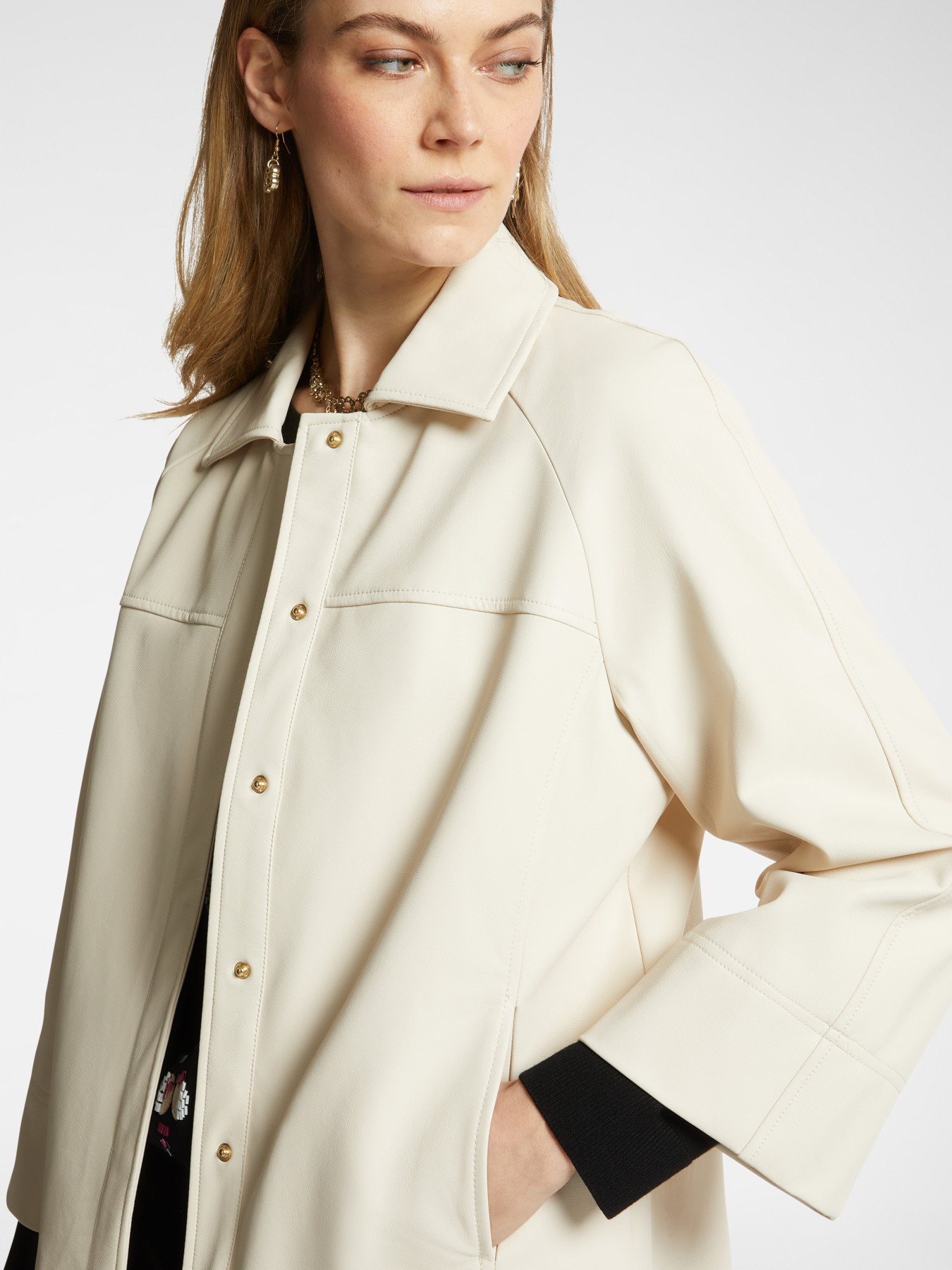 Куртка из приятной экокожи выполненной из вискозы. Рубашечный воротник / женственные расклешенные рукава длиной 7/8. Настоящий must-have для повседневных и формальных образов