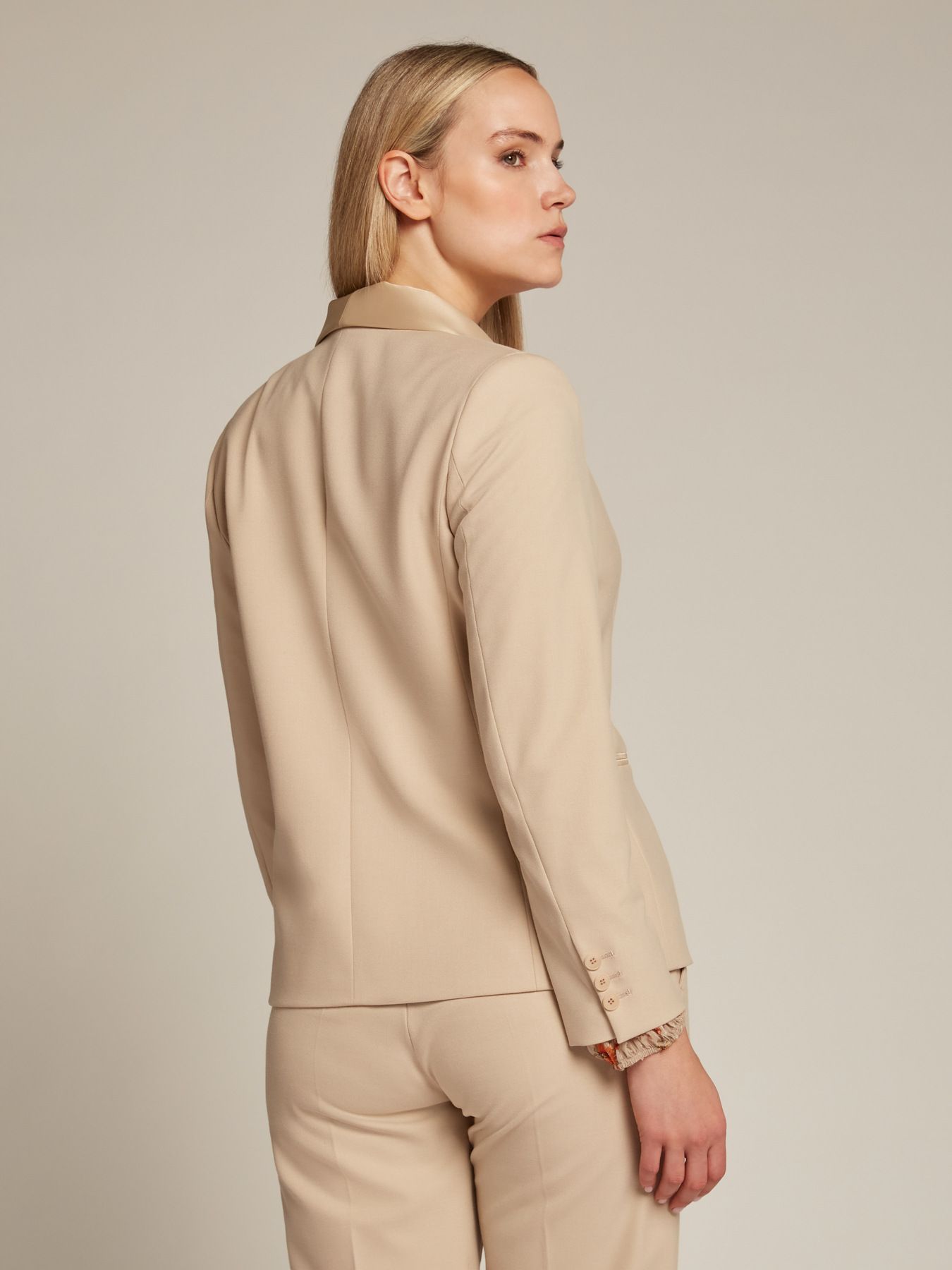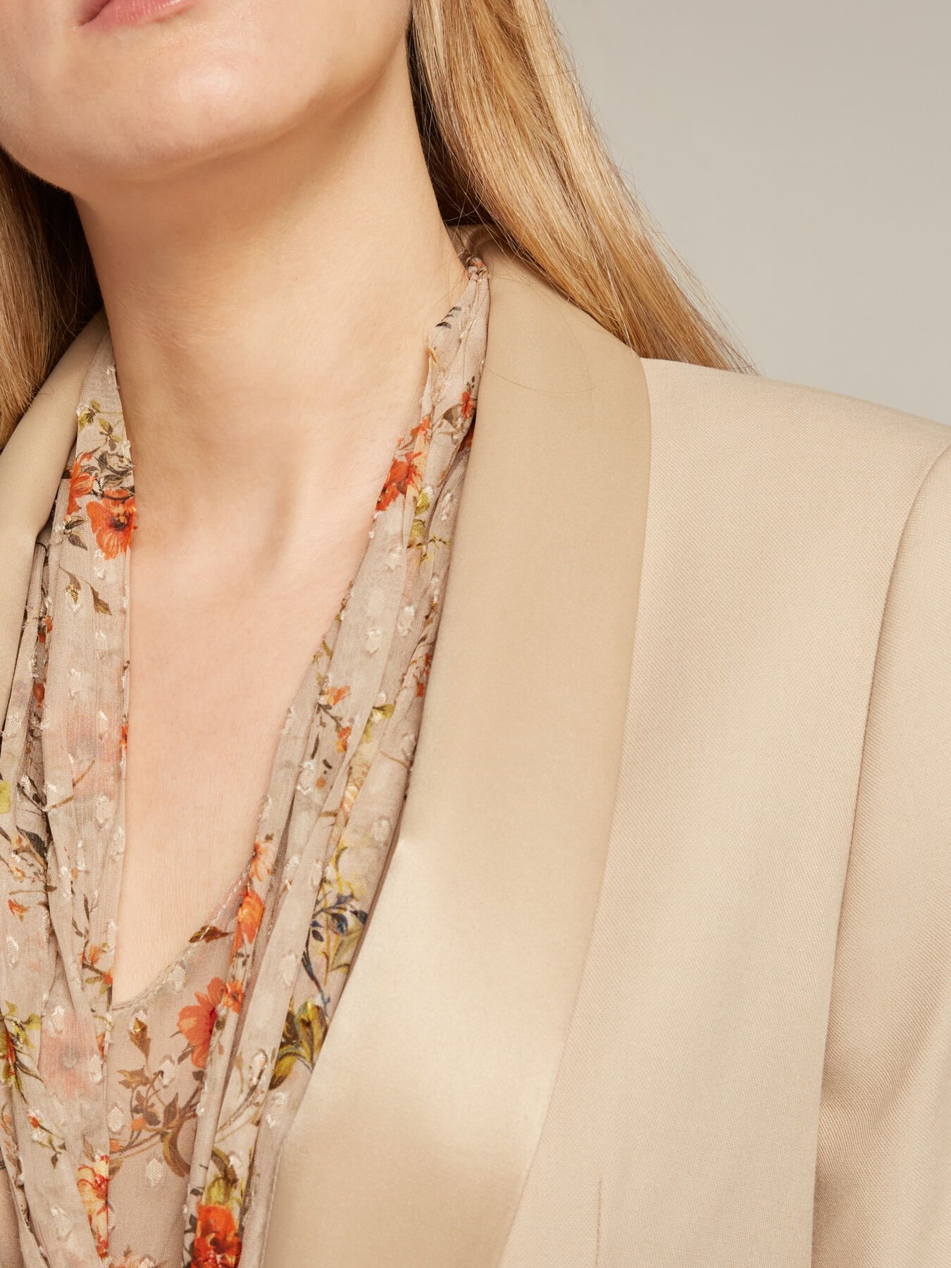 Изысканный и шикарный однобортный жакет-смокинг из мягкой струящейся ткани. Воротник-шаль из атласа, манжеты с разрезами на пуговицах, прорезные карманы, отделанные атласом.