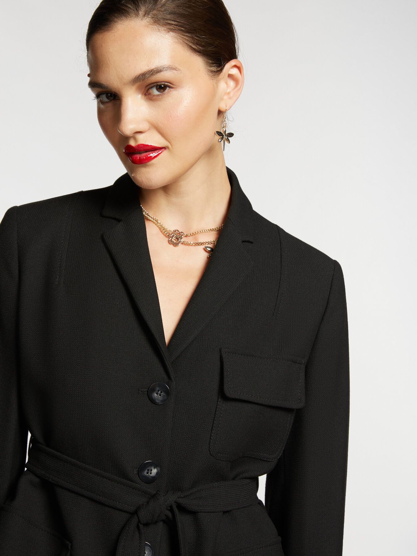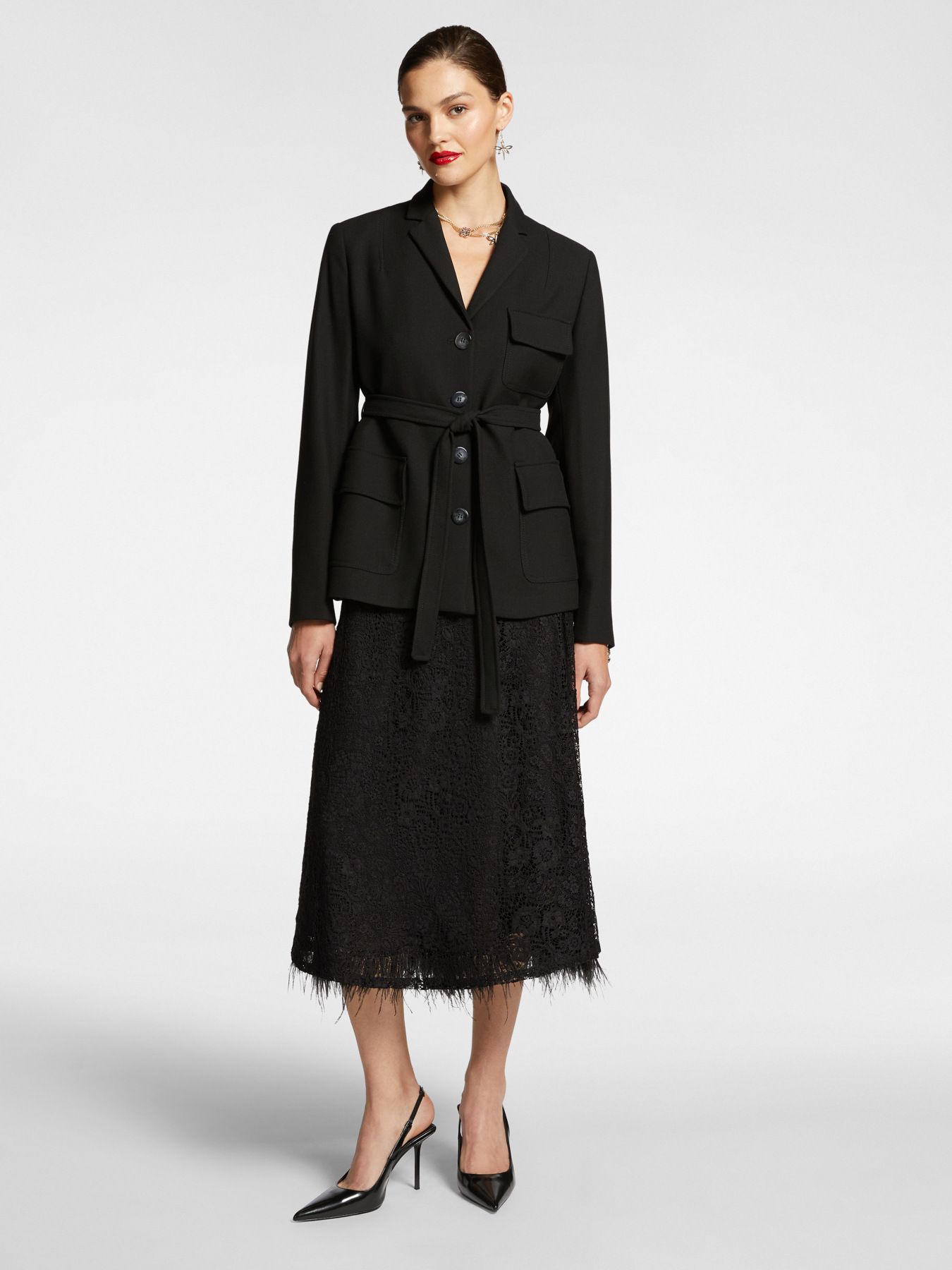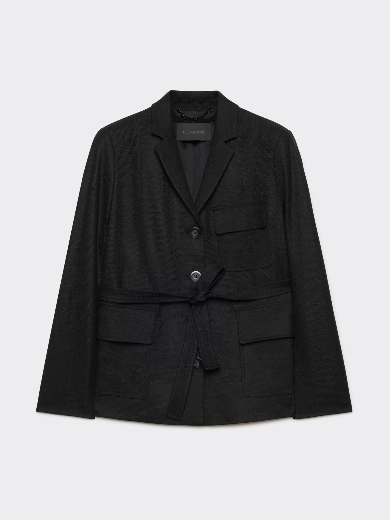 Жакет с лацканами выполнен из эластичной шерстяной ткани. Накладные карманы и пояс завершают стильный образ.
