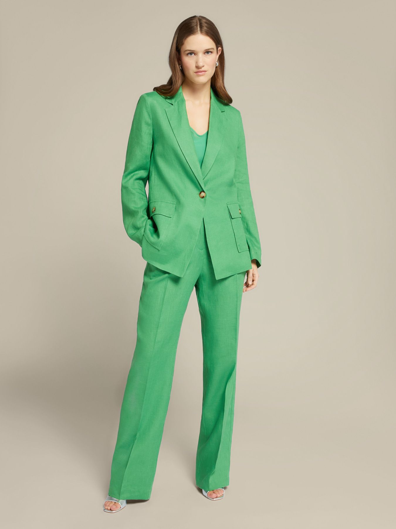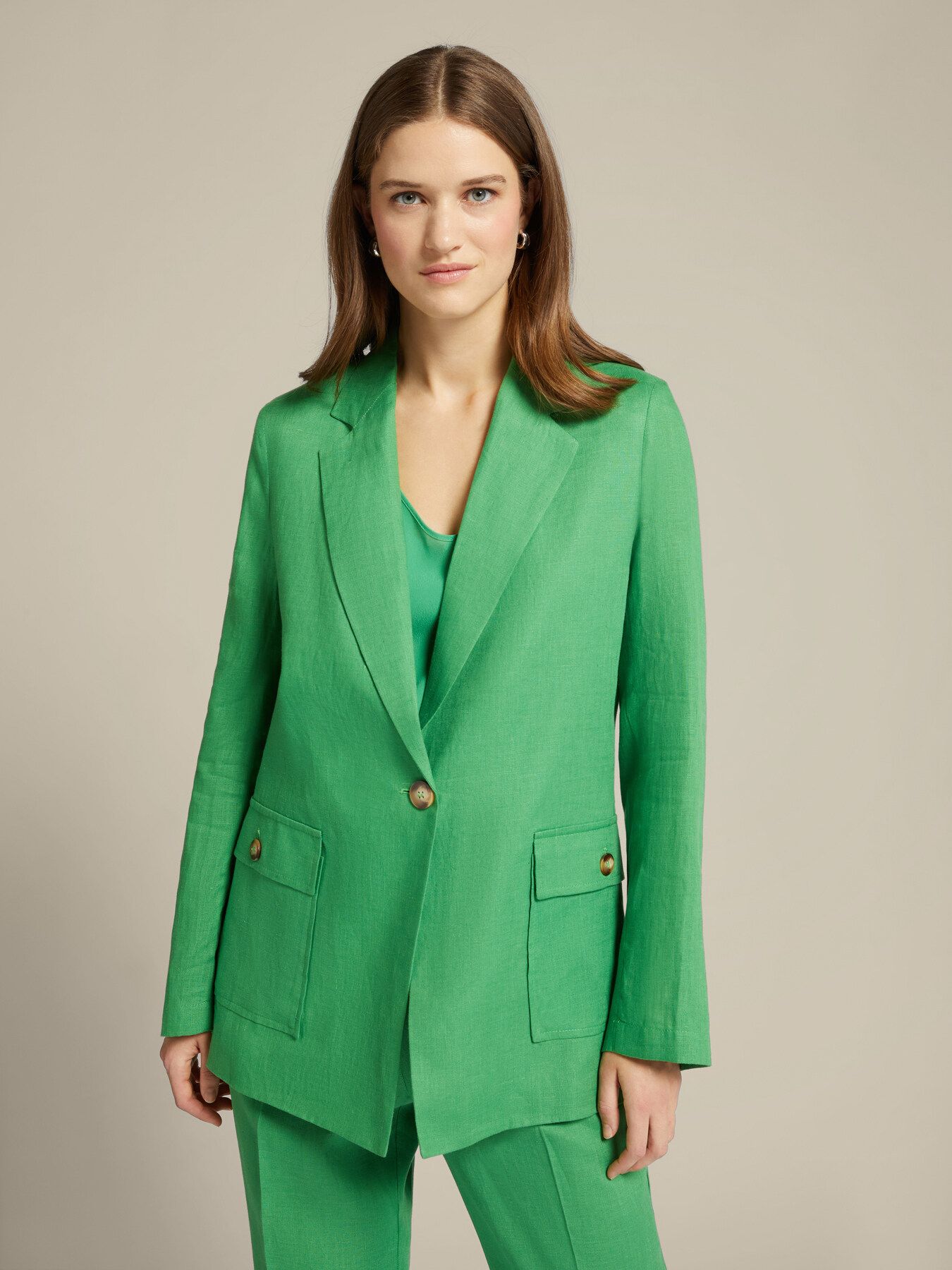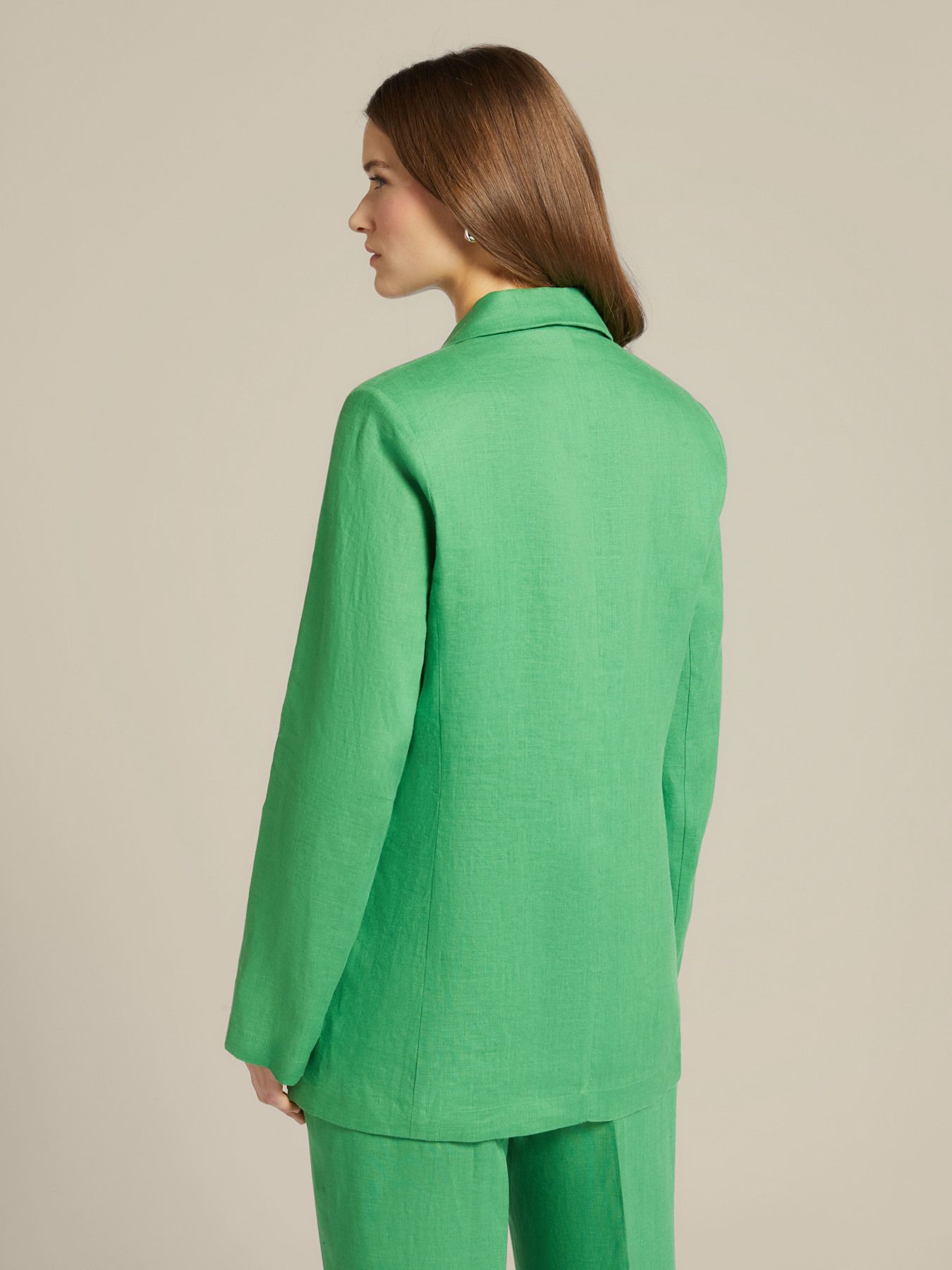 Женственный однобортный жакет из 100% льна с воротником с лацканами и накладными карманами - идеальный выбор для формального, но немножко расслабленного образа. Слегка приталенный крой, без подкладки, застегивается на одну пуговицу. Идеально сочетается как с брюками песочного оттенка, так и с платьем в тон.