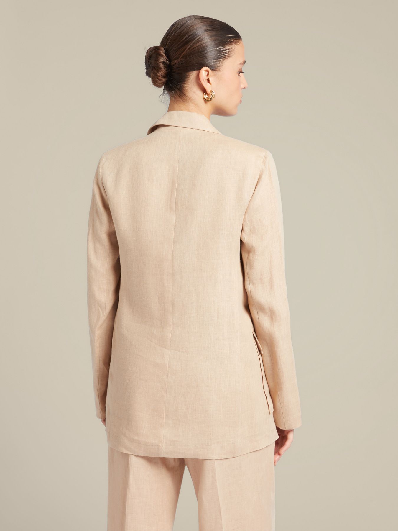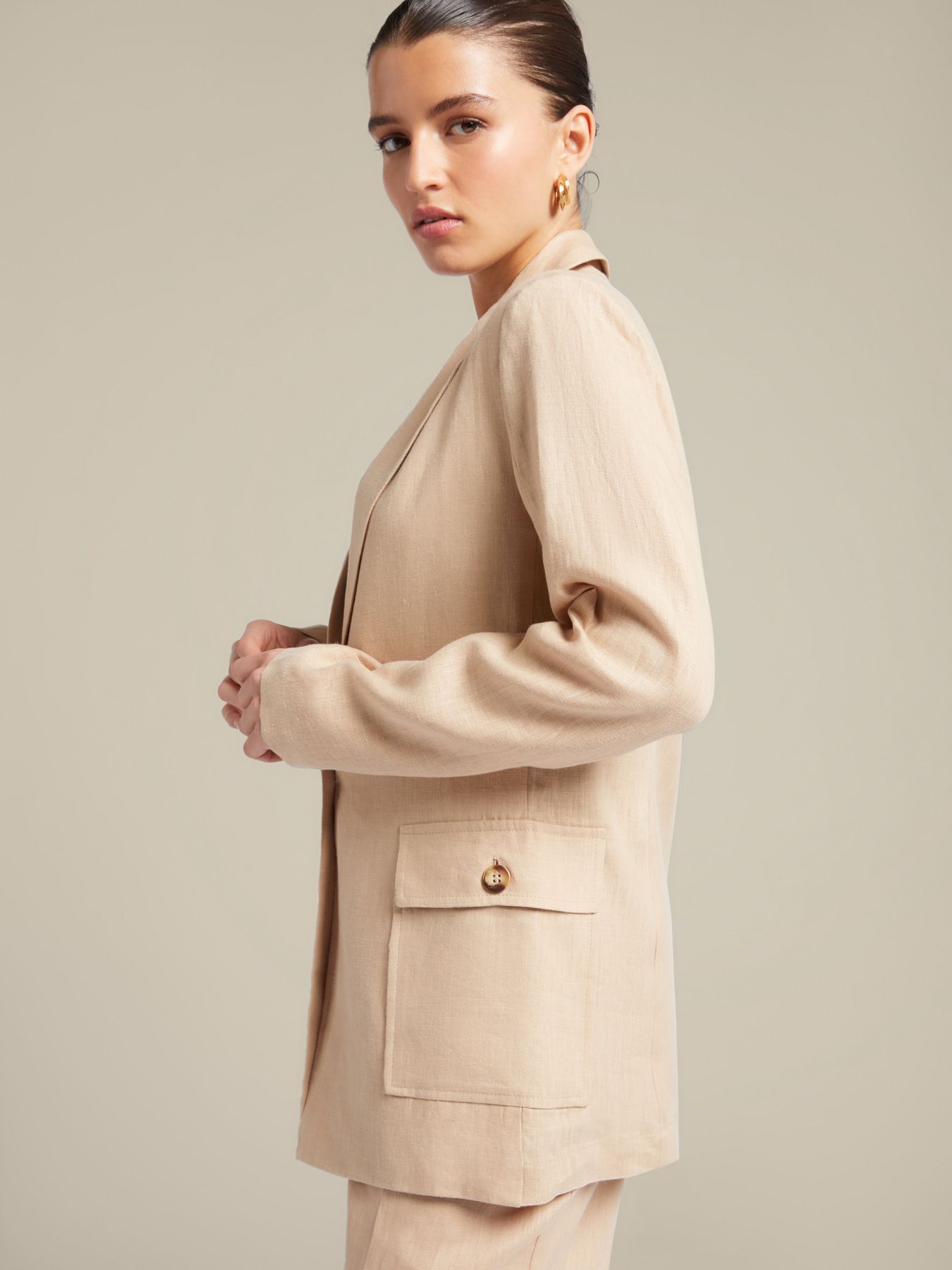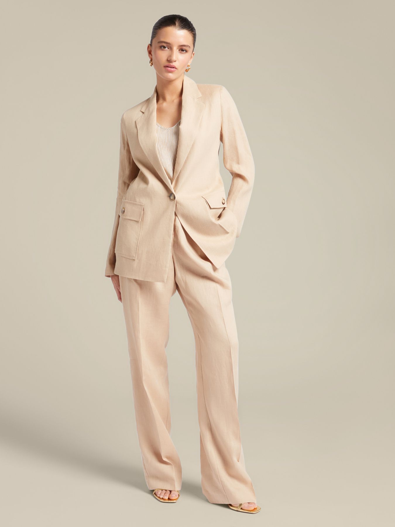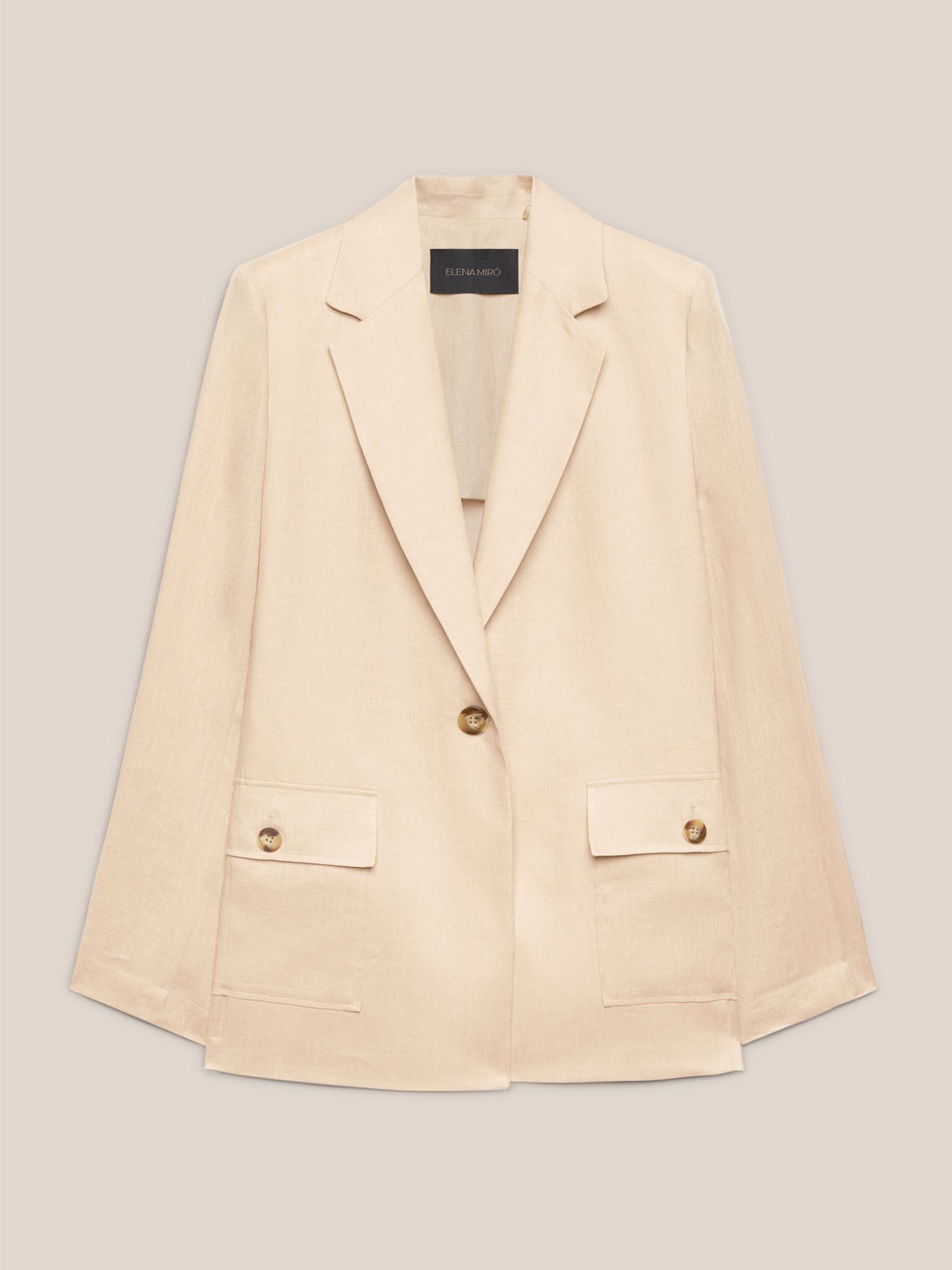 Женственный однобортный жакет из 100% льна с воротником с лацканами и накладными карманами - идеальный выбор для формального, но немножко расслабленного образа. Слегка приталенный крой, без подкладки, застегивается на одну пуговицу. Идеально сочетается как с брюками песочного оттенка, так и с платьем в тон.