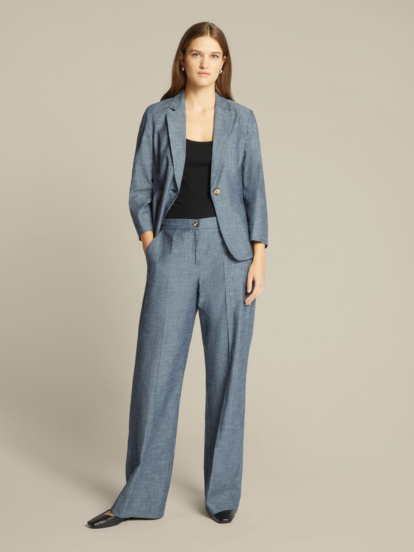 Элегантный приталенный жакет из хлопка и льна с эффектом денима. Женственный силуэт, рукав три четверти, структурированная линия плеч, накладные карманы прекрасно подчеркивают фигуру. Модель без подкладки, застегивается на одну пуговицу. Отличный выбор как на работу, так и на встречу с друзьями.