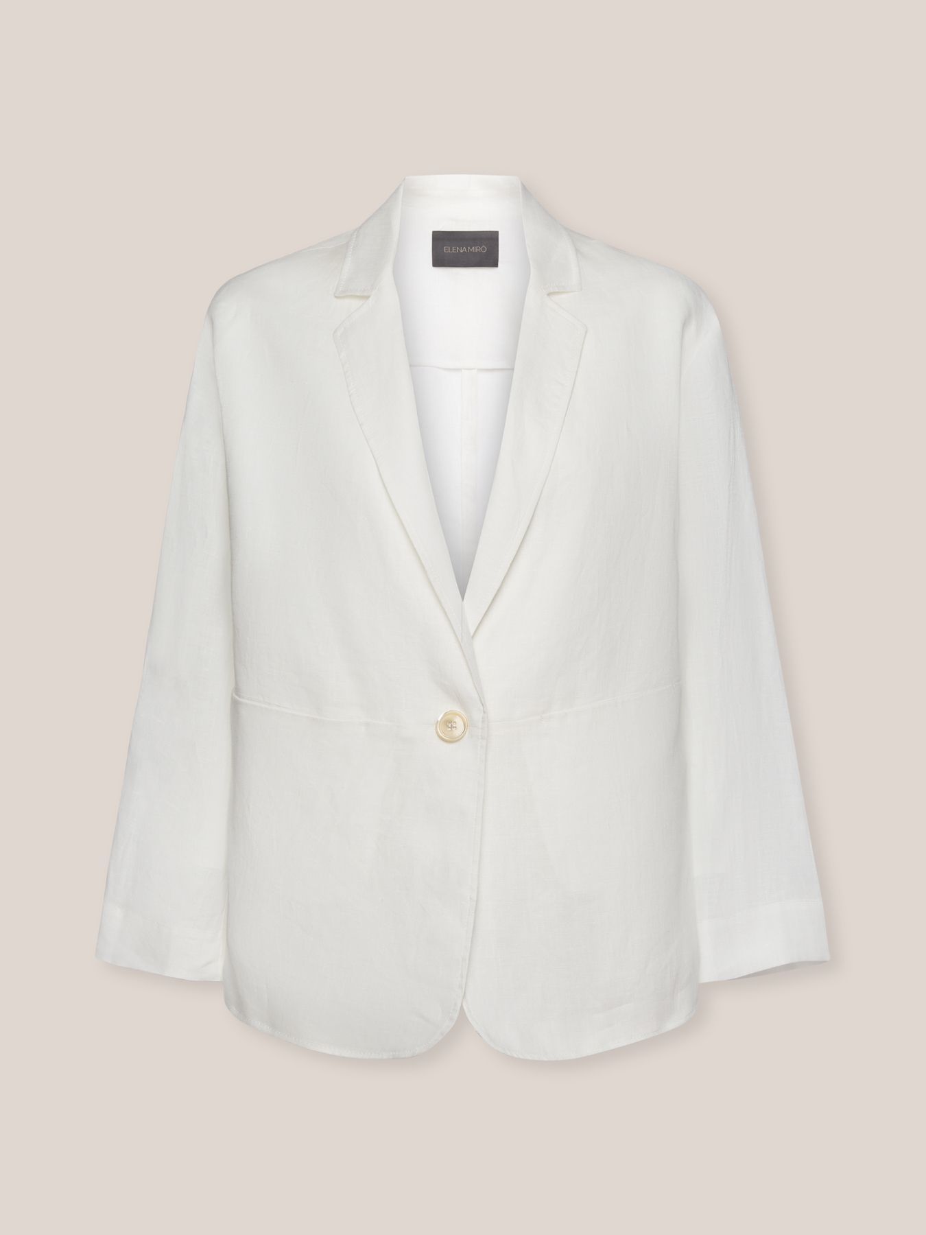 Жакет из 100% льна. Спущенное плечо, лацканы, горизонтальная полоса, определяющая пройму карманов и дополнительно украшающая изделие. Идеально сочетается с брюками из аналогичной ткани. Классическое изделие для ярких весенних образов.