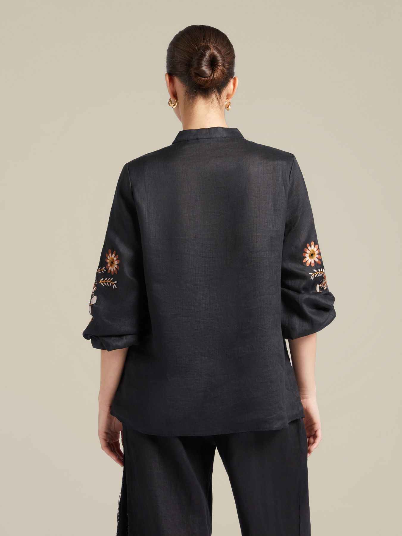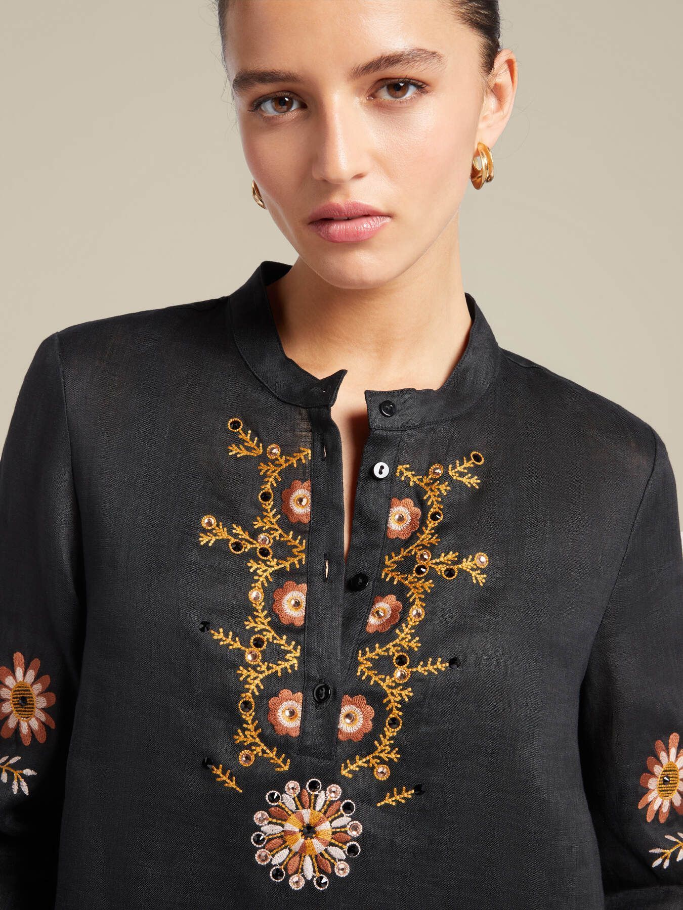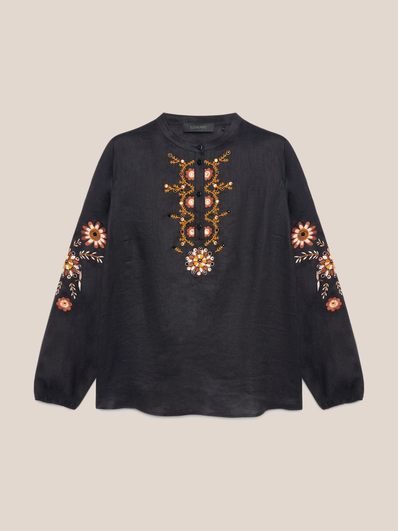 Оригинальная блузка из 100% льна с акцентной этнической вышивкой теплых тонов. Длинные рукава, воротник-стойка и застежка спереди. Придаст изюминки любому образу.