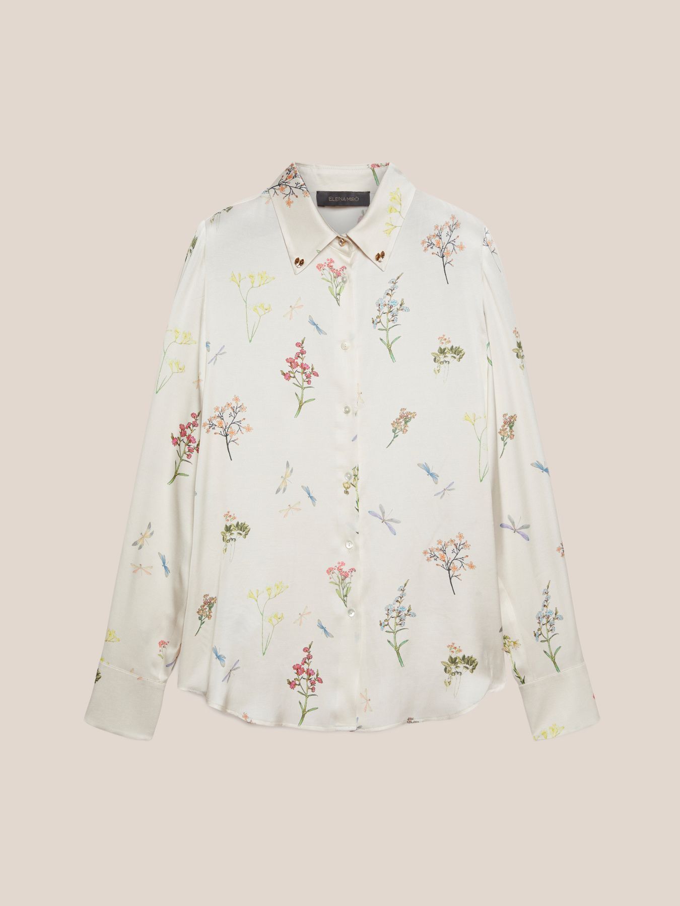 Блузка из атласной струящейся эко-вискозы, слегка удлиненная, с романтичным цветочно-травяным принтом, является олицетворением женственности. Деликатный декор в виде небольших, расшитых вручную камней на воротнике, придает образу нотку гламура. Размер на модели: 46 RUS (44 IT) Параметры модели: рост 178 см, грудь 92 см, талия 66 см, бедра 101 см.