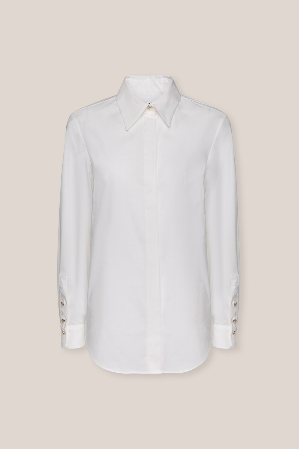 Рубашка свободного кроя из эластичного хлопкового поплина с разрезами по бокам, украшенная пуговицами с монограммой. Идеально сочетается с джинсами для современного образа.