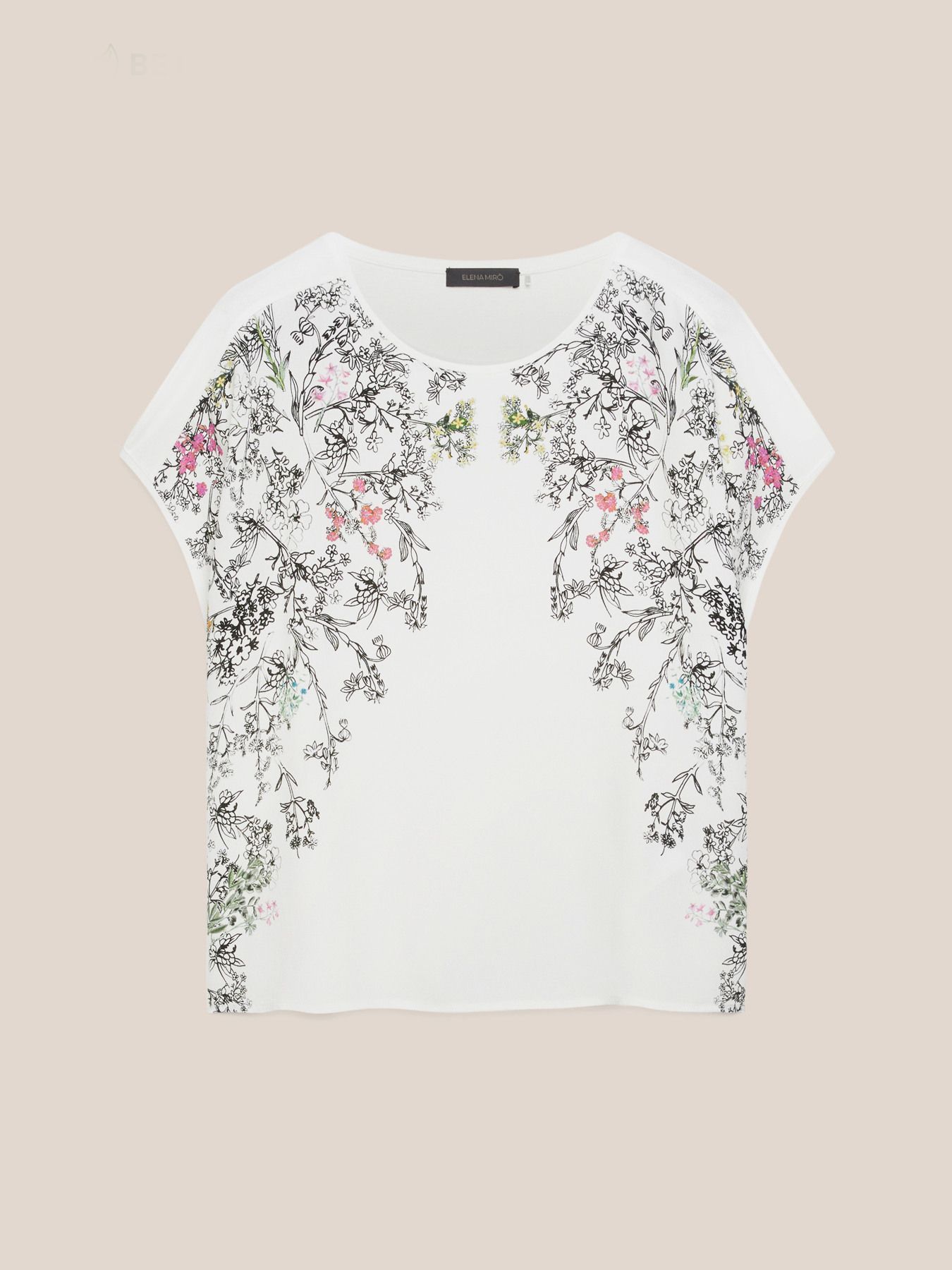 Бесшовная блузка с коротким рукавом из джерси и вискозного атласа с принтом. Вырез-лодочка, свободный крой.