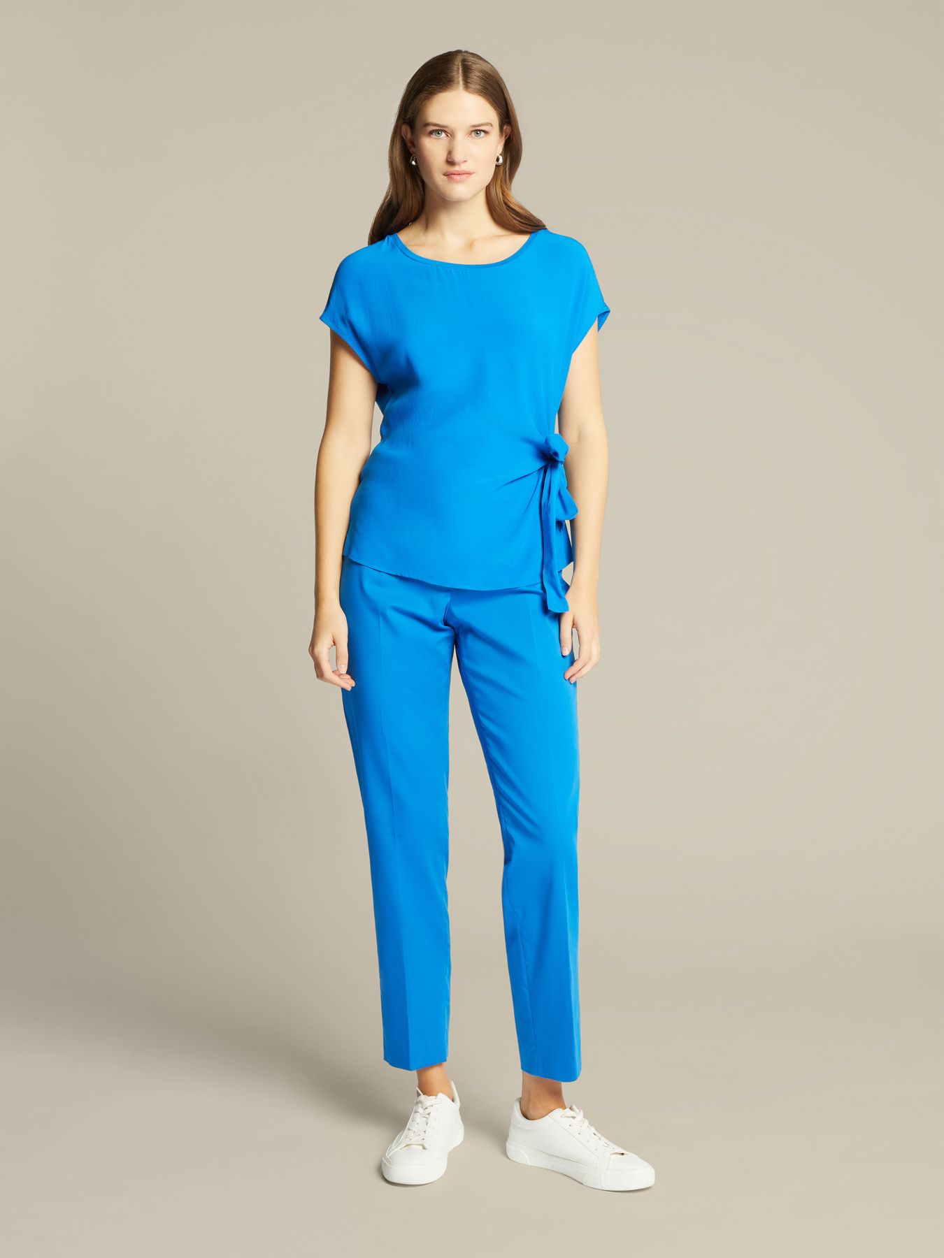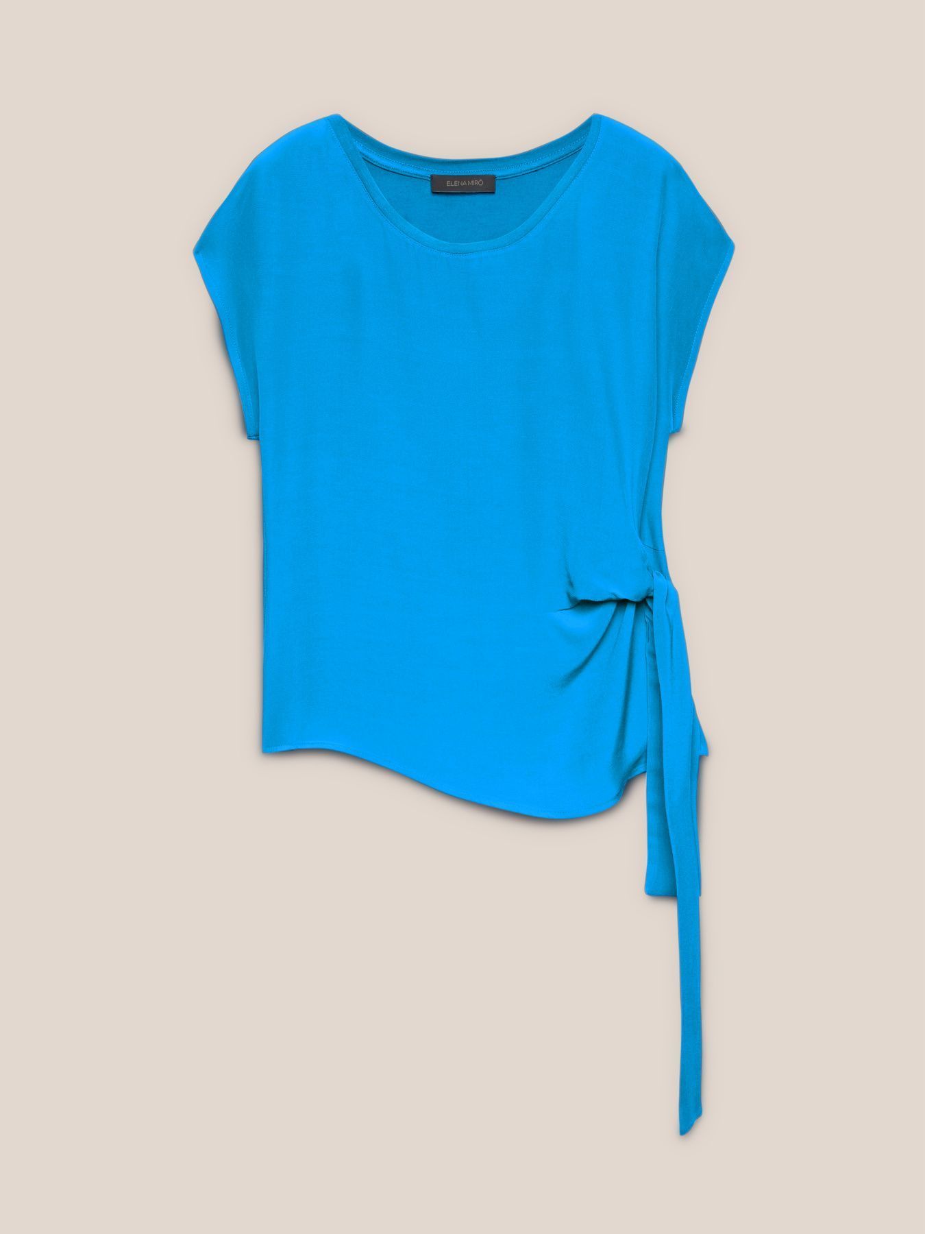 Элегантная бесшовная блузка без рукавов из двойной вискозы с драпировкой бантом сбоку. Универсальная модель, станет хорошей базой на каждый день и оригинальным решением на особый случай.