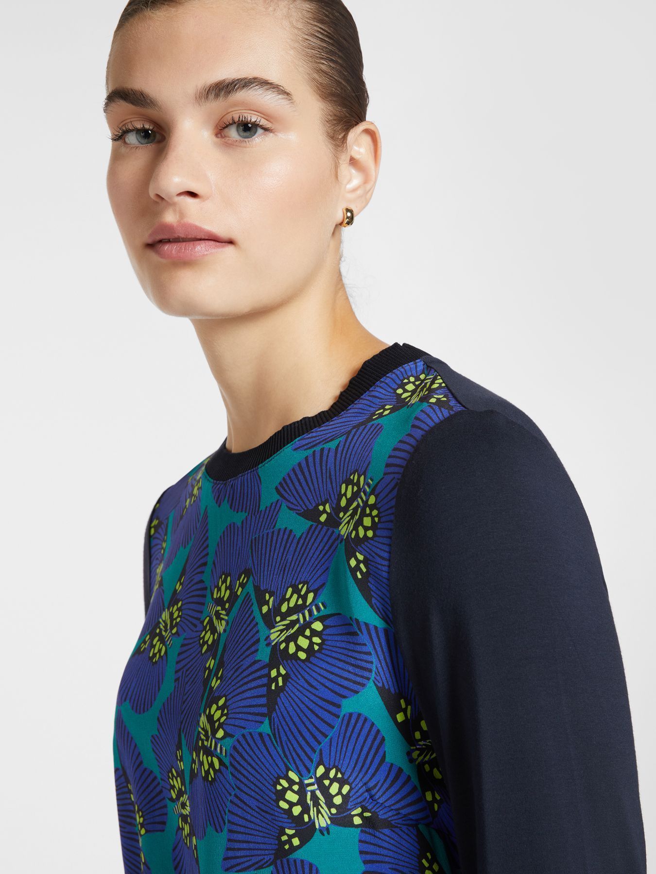 Блузка смесового состава из натурального шелка и вискозы – приятных к телу материалов. Круглый вырез подчеркивает изящную линию шеи и делает образ более женственным, а ребристый ворот добавляет текстурный элемент. Блузка добавит изящности и легкости в любой образ, подчеркнув вашу индивидуальность.