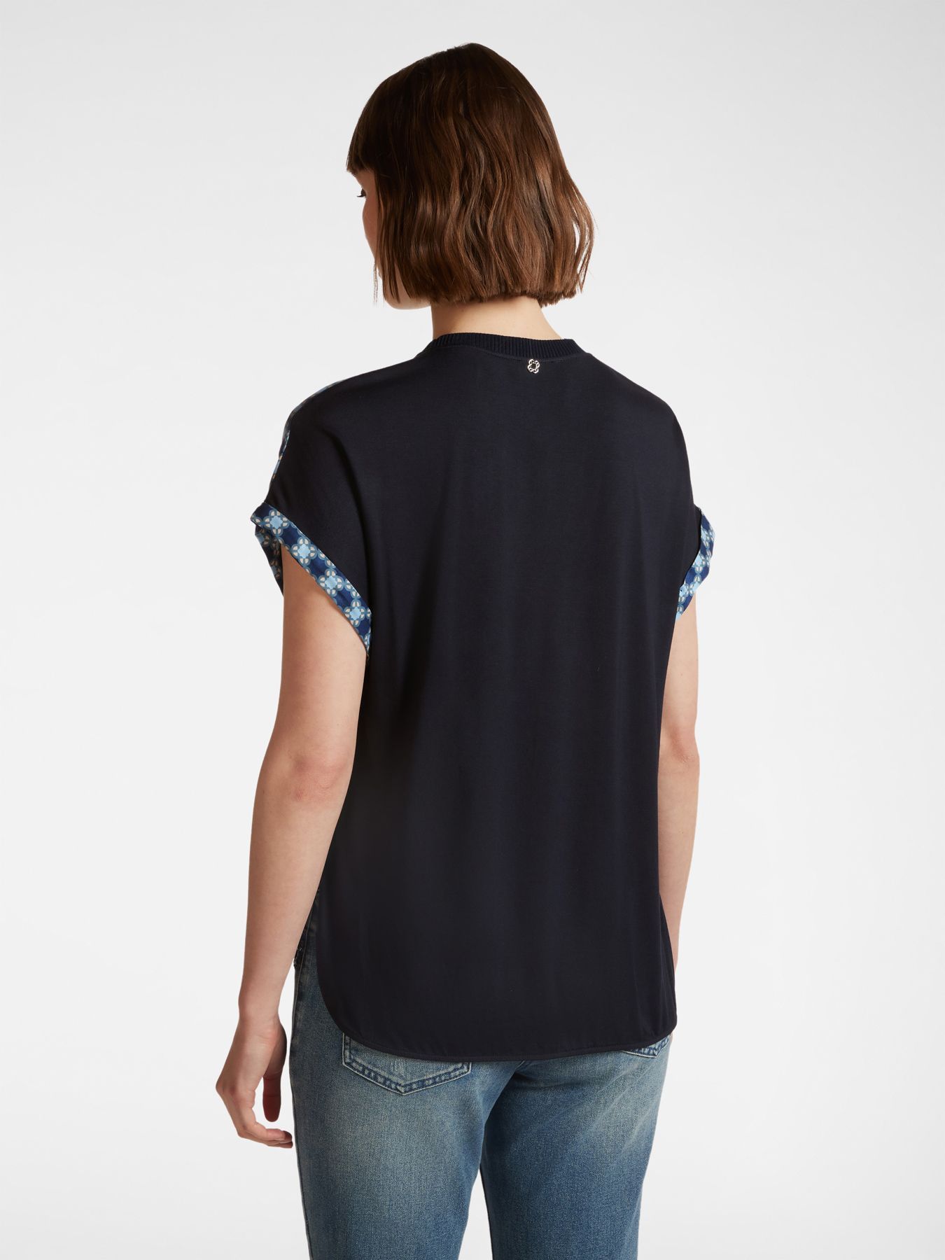 Приятная блузка из двух тканей — вискозного твила и синего джерси. Интересный уникальный дизайн, удобный крой и качественное исполнение. Прекрасно подходит для повседневных образов.