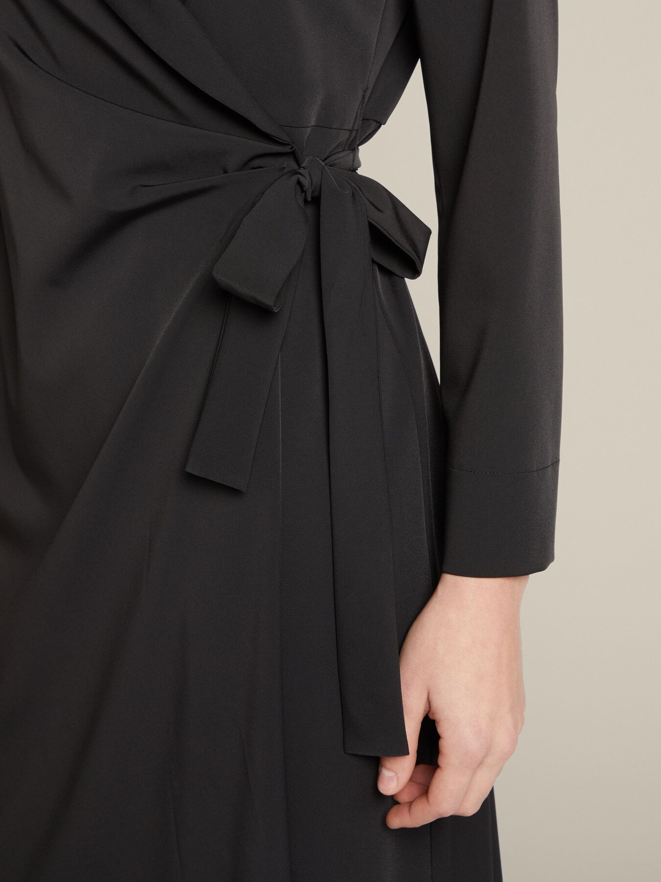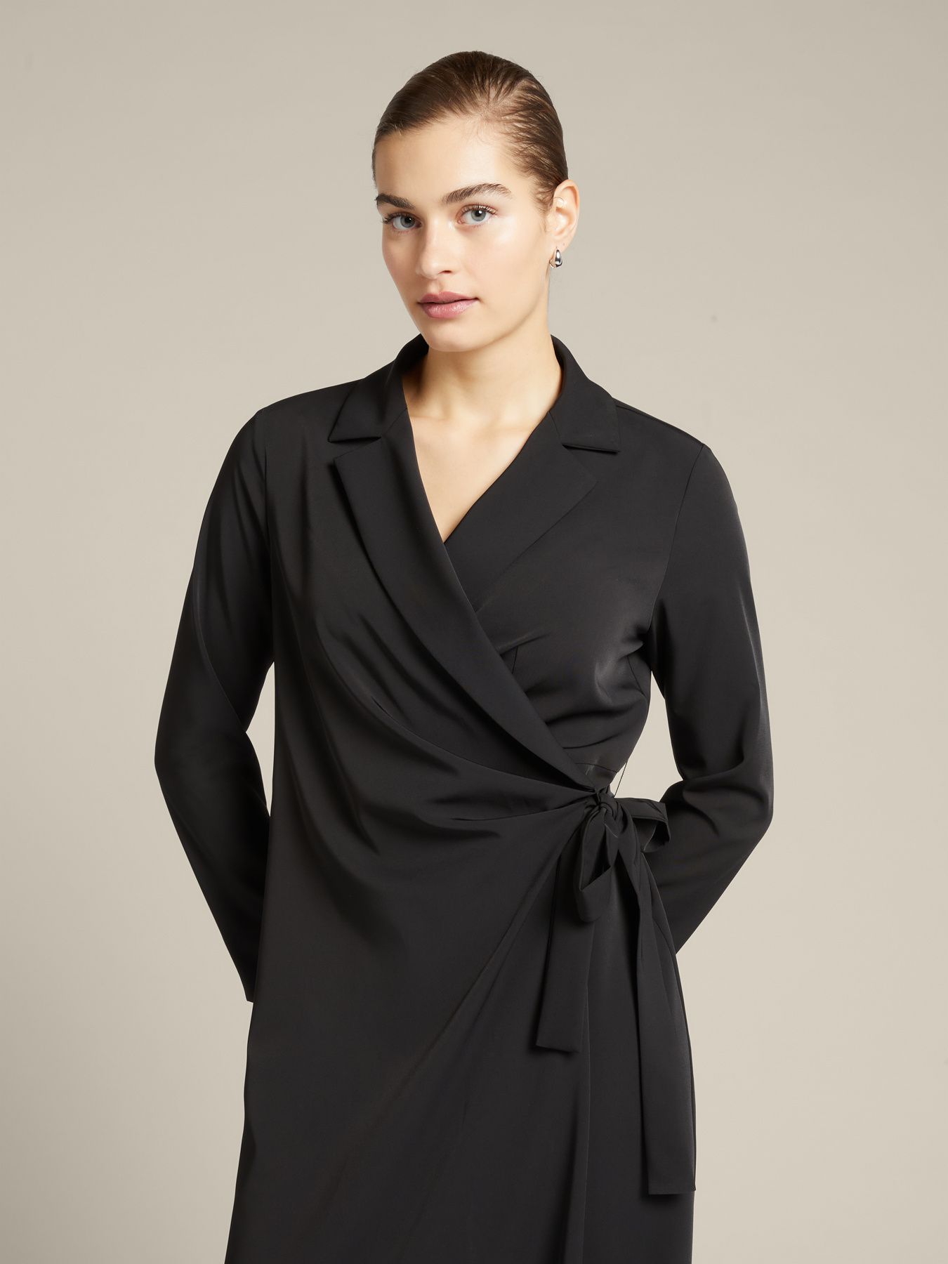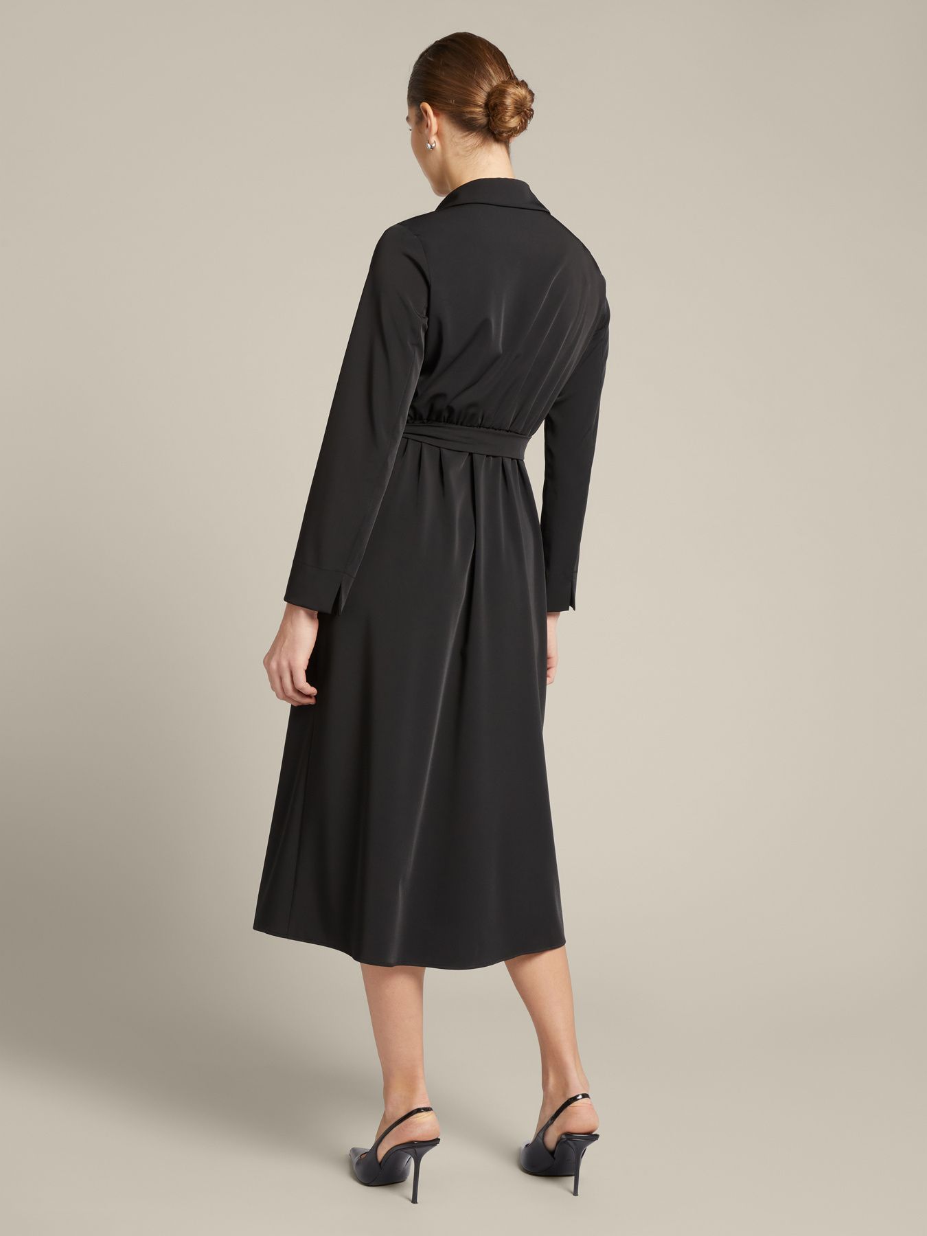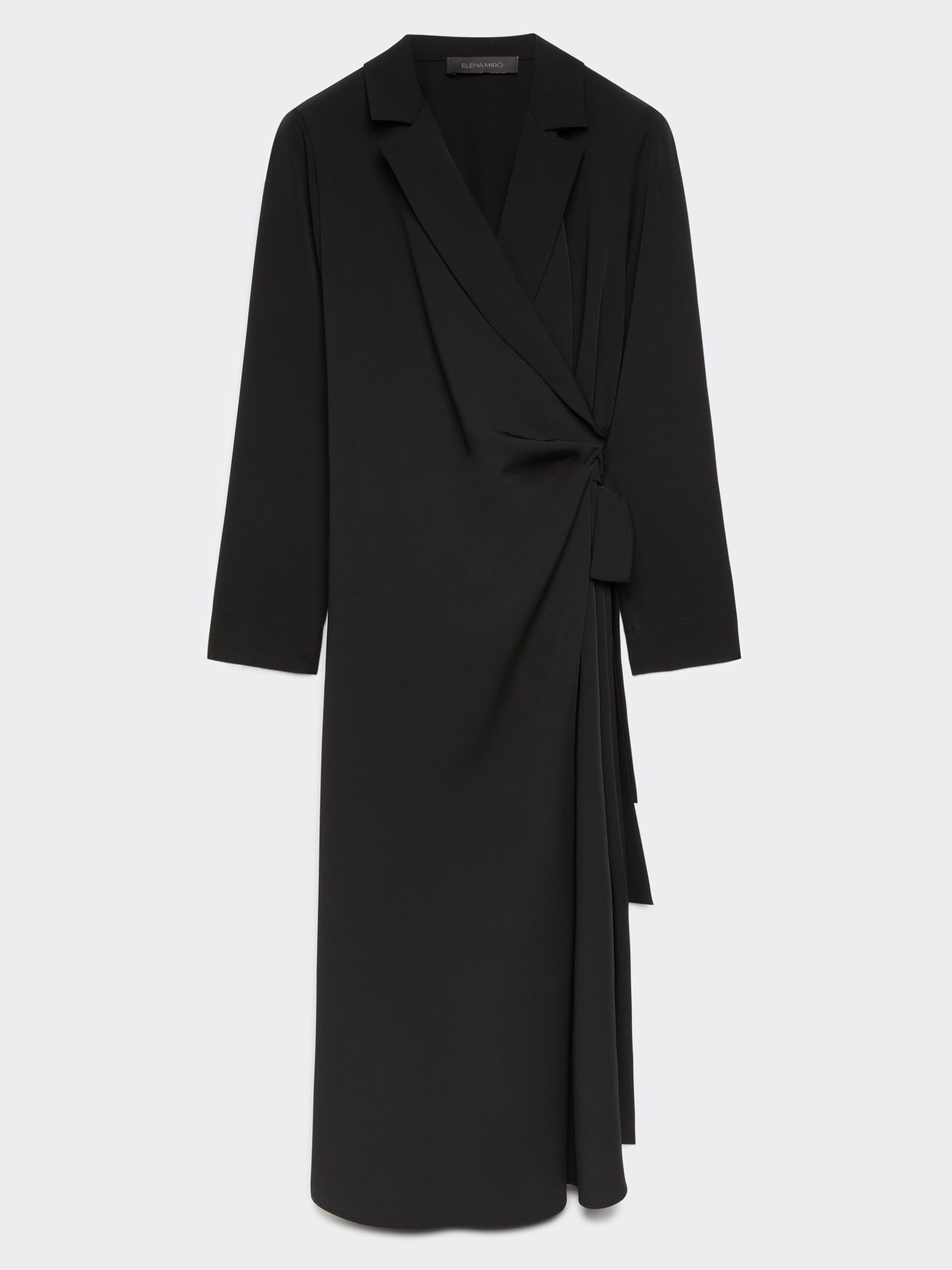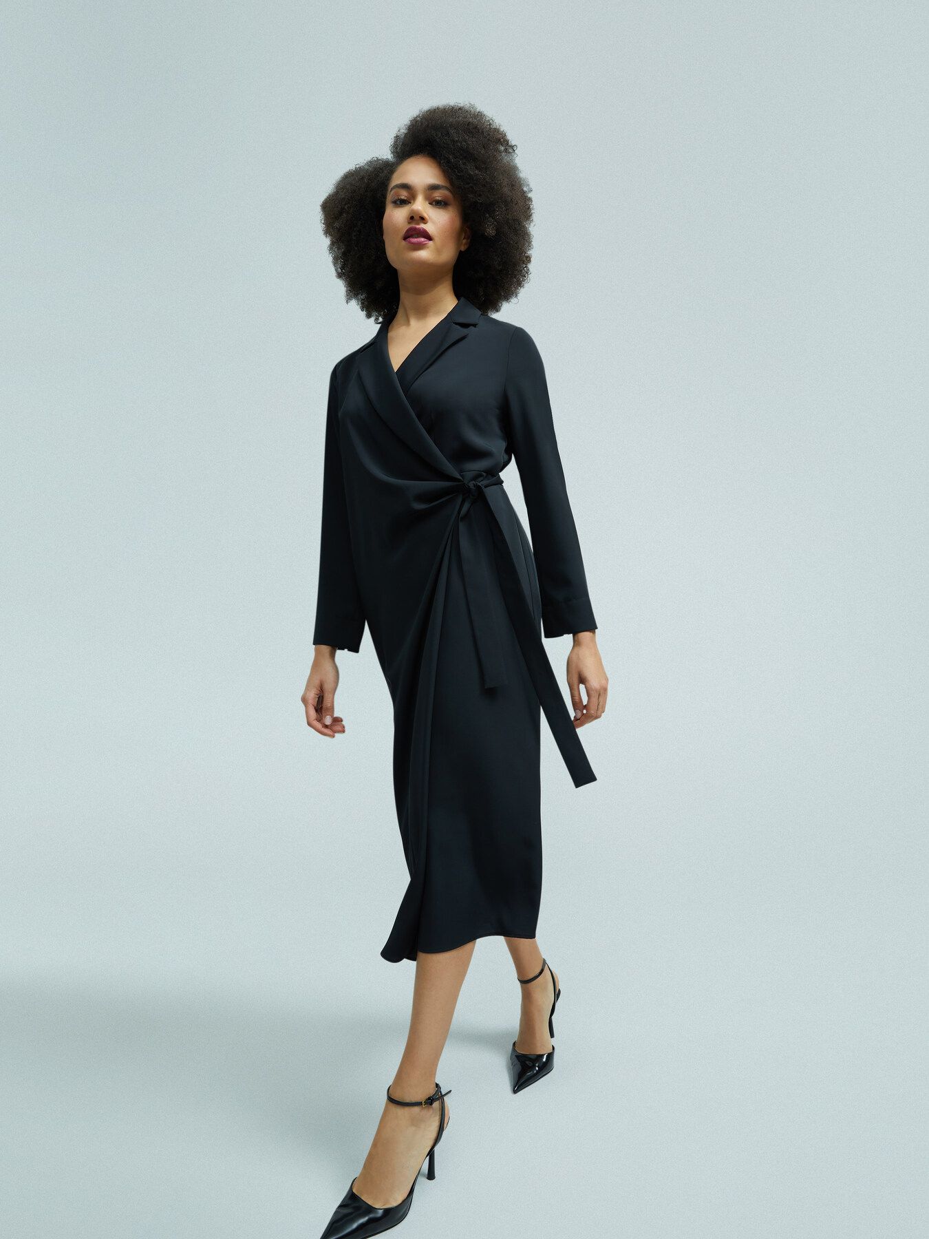 Изысканное платье на запах из струящейся эластичной кади. Модель средней длины с воротником и лацканами, длинный рукав, резинка на талии сзади, оригинально декорируемый пояс. Размер на модели: 46 RUS (44 IT) Параметры модели: рост 178 см, грудь 92 см, талия 66 см, бедра 101 см.