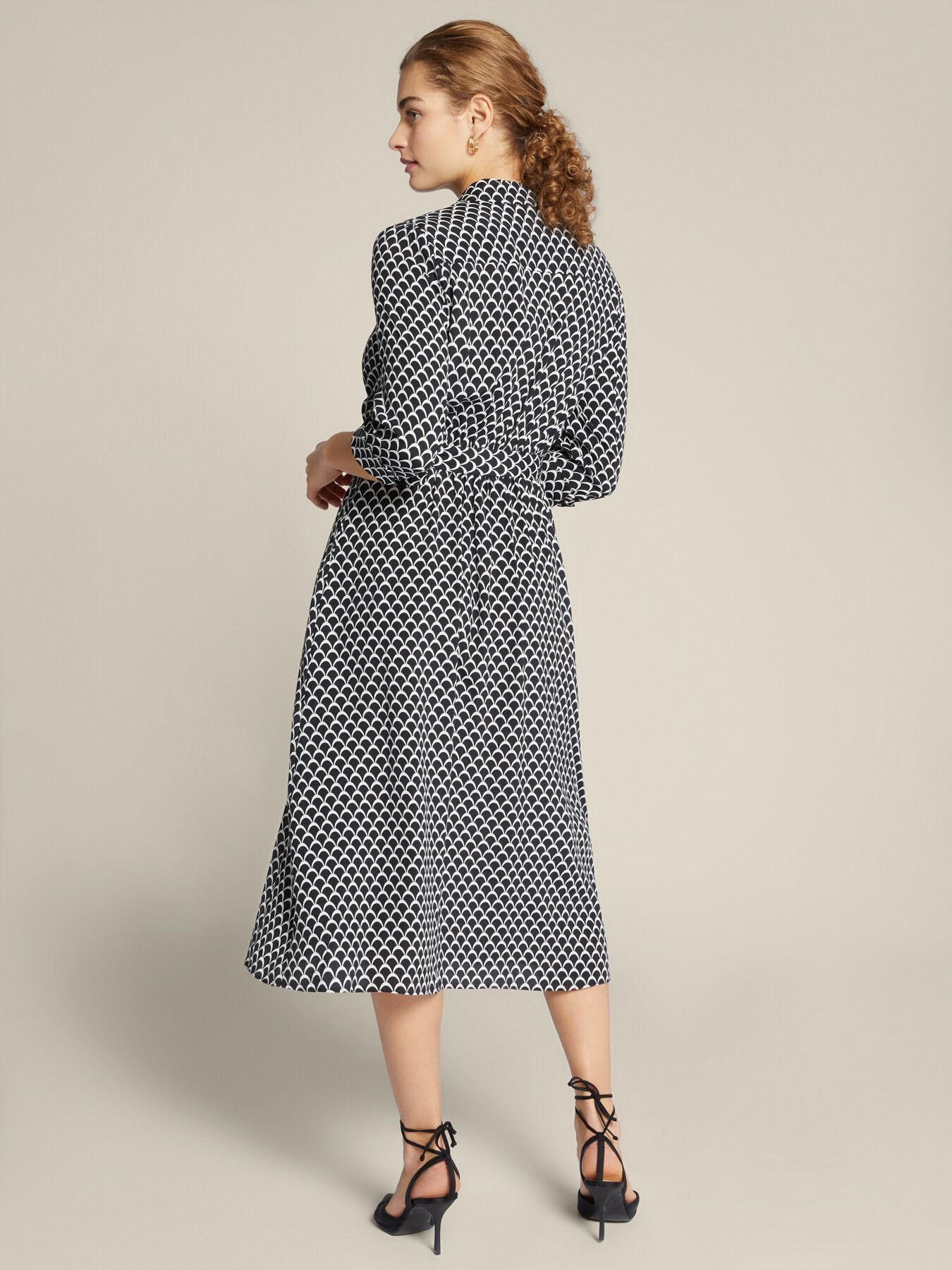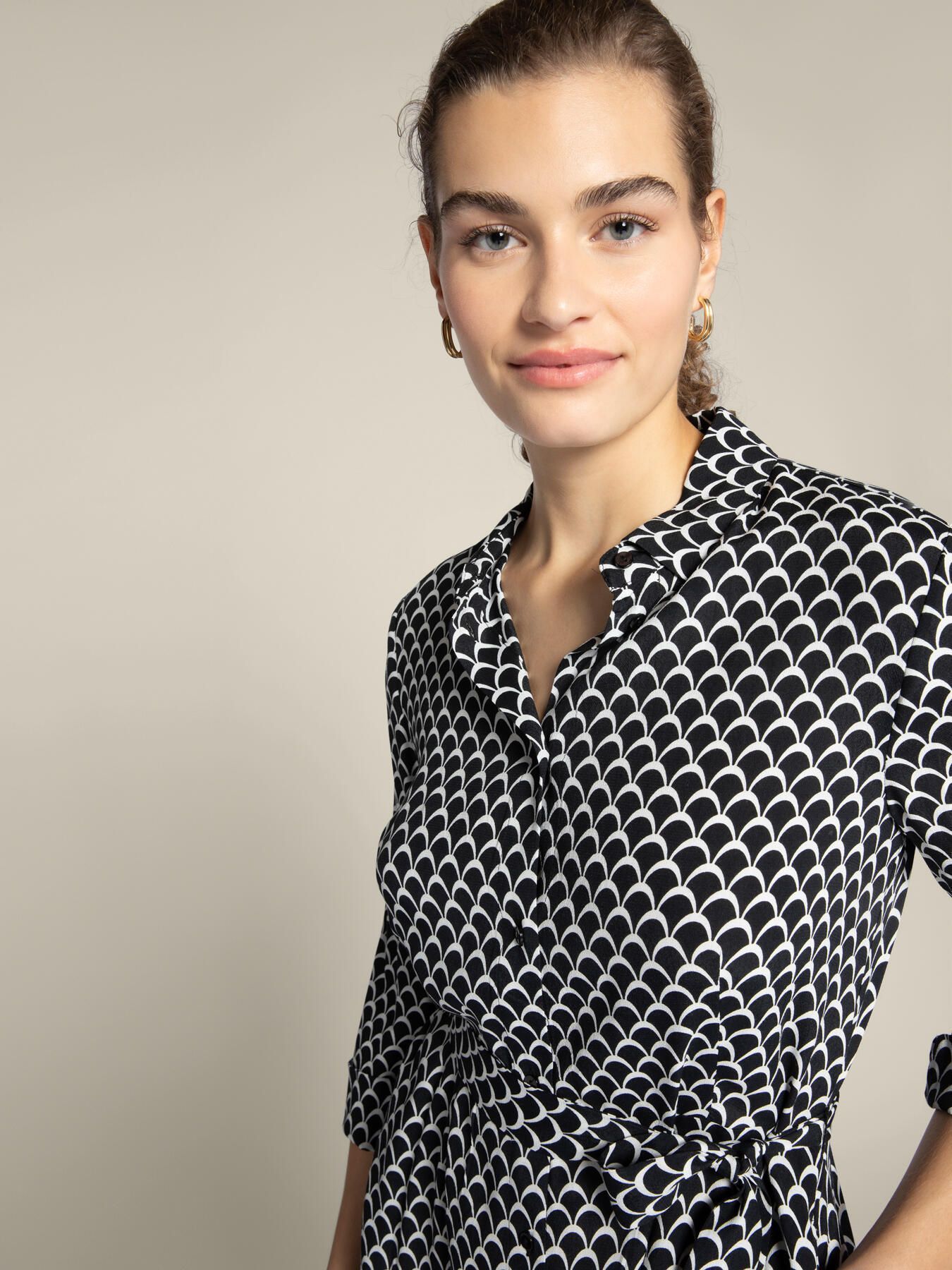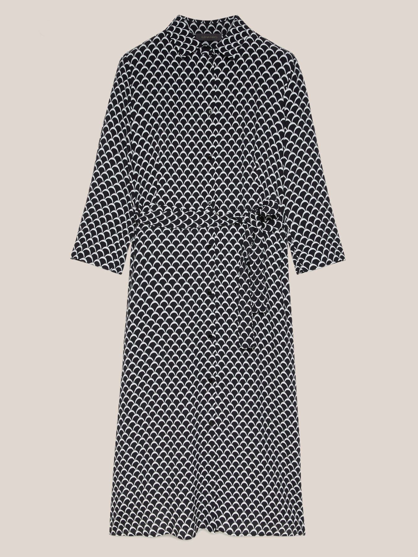 Элегантное, инклюзивное платье из эко-вискозы с геометрическим черно-белым рисунком, идеальным для придания современного оттенка классическому силуэту. Рубашечный воротник, рукава три четверти, пояс и карманы придают модели женственности и подчеркивают фигуру. Размер на модели: 46 RUS (44 IT) Параметры модели: рост 178 см, грудь 92 см, талия 66 см, бедра 101 см.