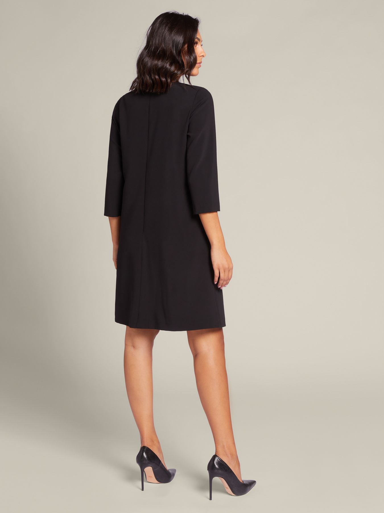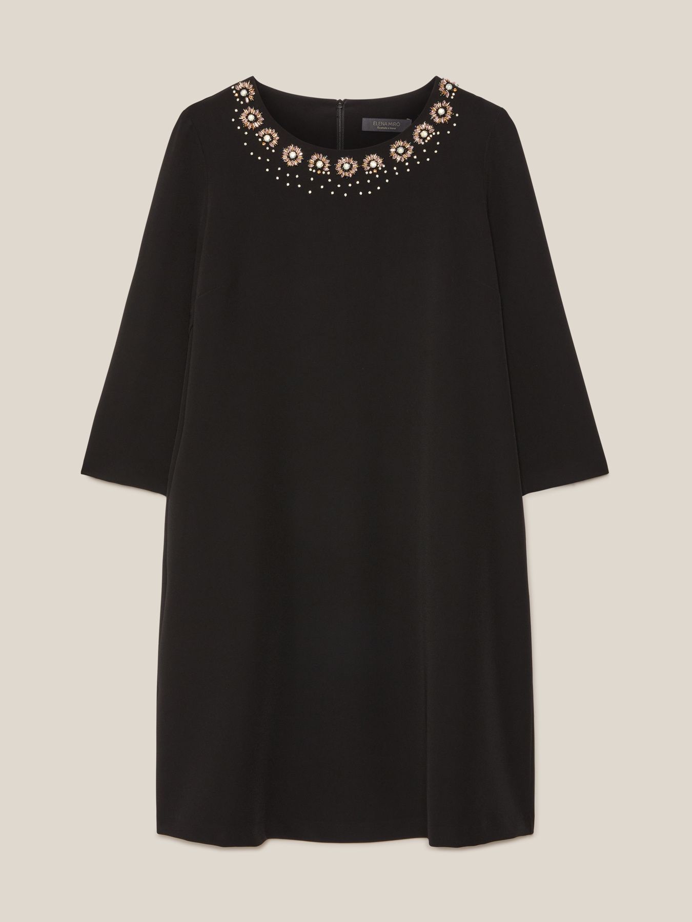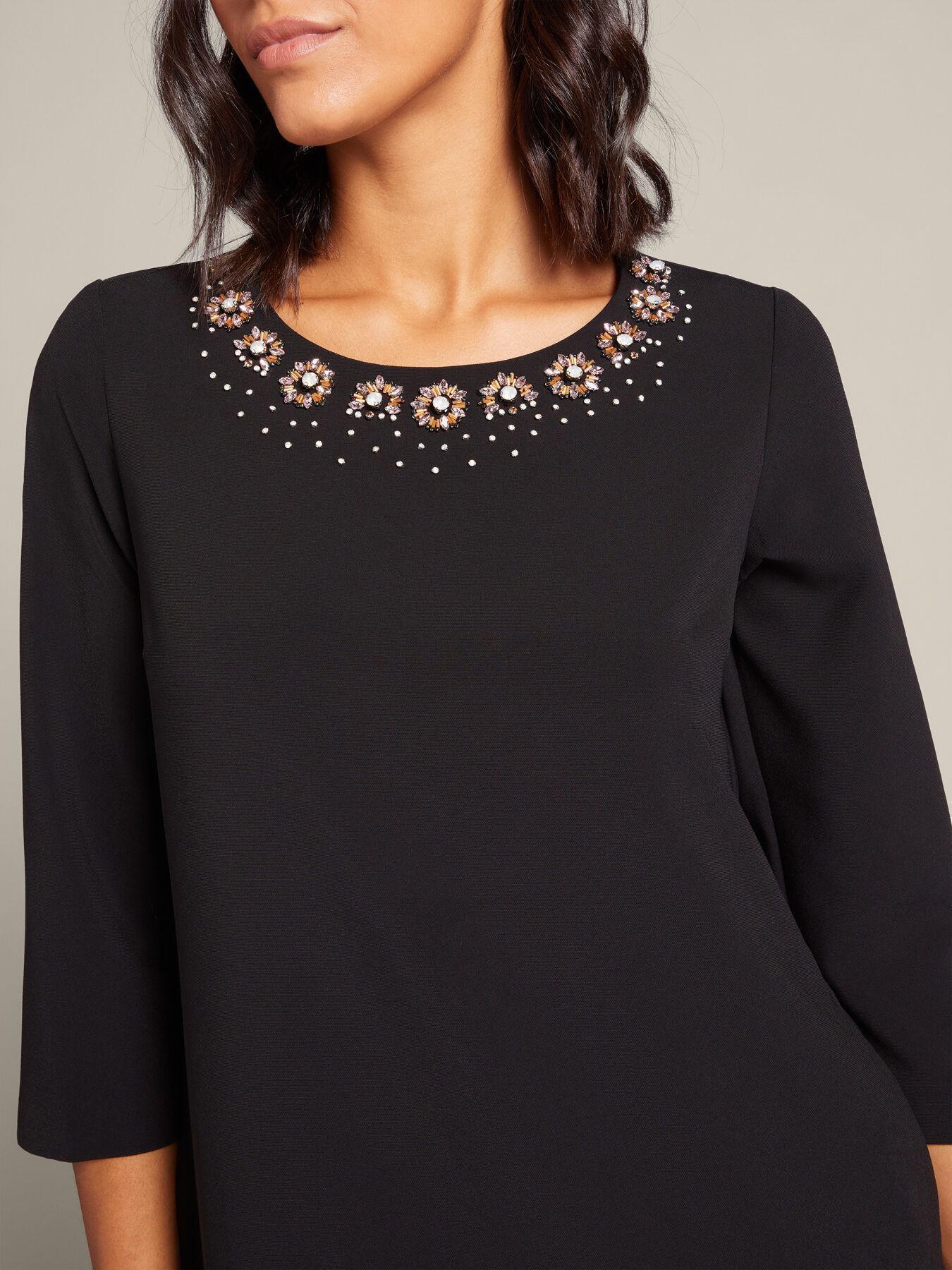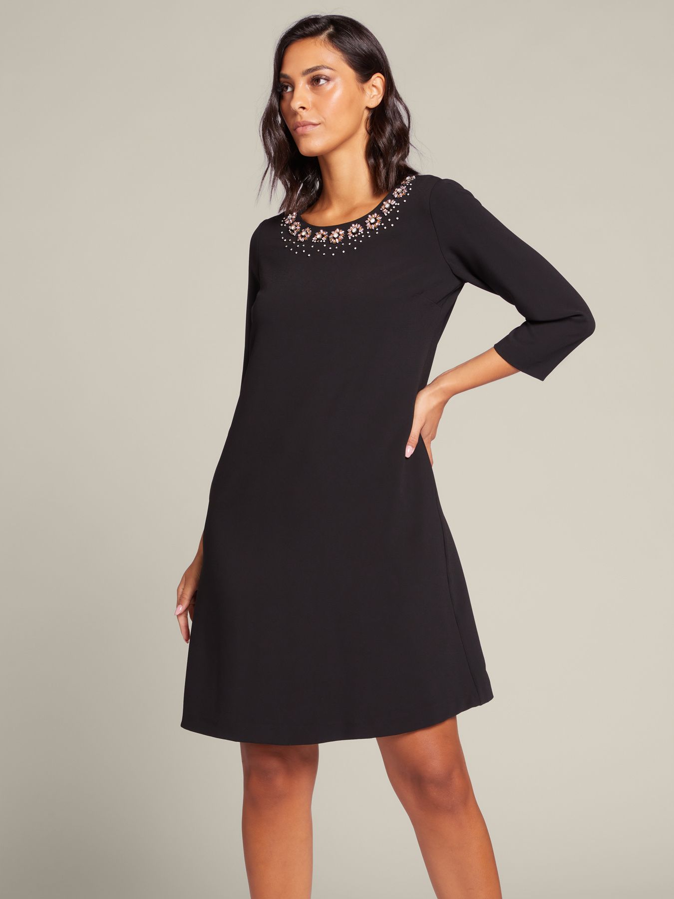 Элегантное мини-платье прямого кроя с богатым декором из камней и стекляруса по линии горловины. Модель с рукавами длиной три четверти, вшивными карманами, застегивается на молнию по центру спины, на подкладе.