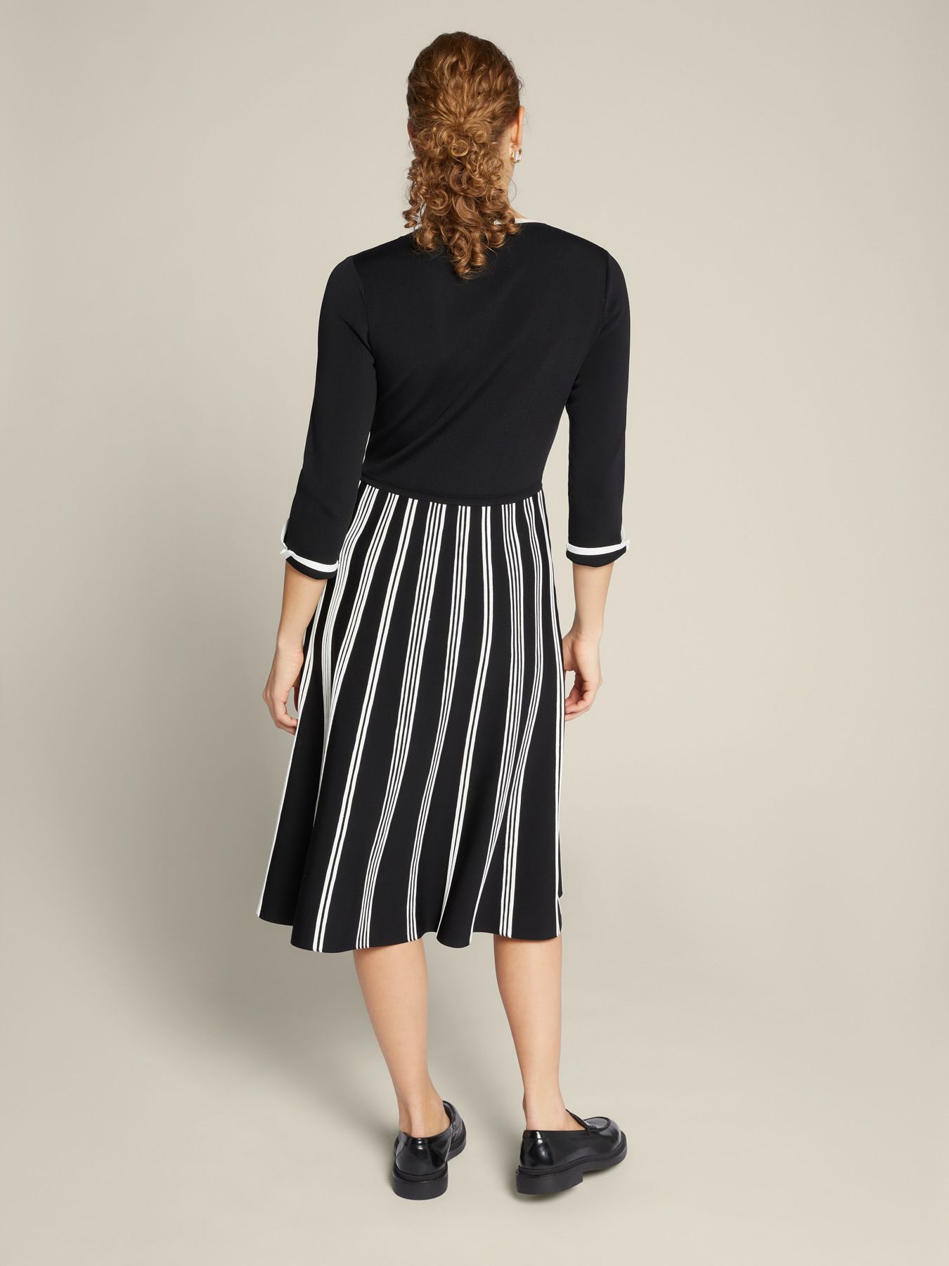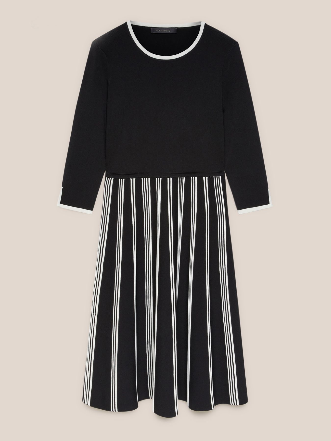 Двухцветное трикотажное платье из мягкого эко вискозного крепа. Приталенный силуэт, расклешенная юбка с рельефной имитацией складок, аккуратная неглубокая линия ворота, оптимальная комфортная длина до колена, рукава три четверти с деликатными разрезами и контрастной отделкой, классическое черно-белое исполнение. Размер на модели: 46 RUS (44 IT) Параметры модели: рост 178 см, грудь 92 см, талия 66 см, бедра 101 см.