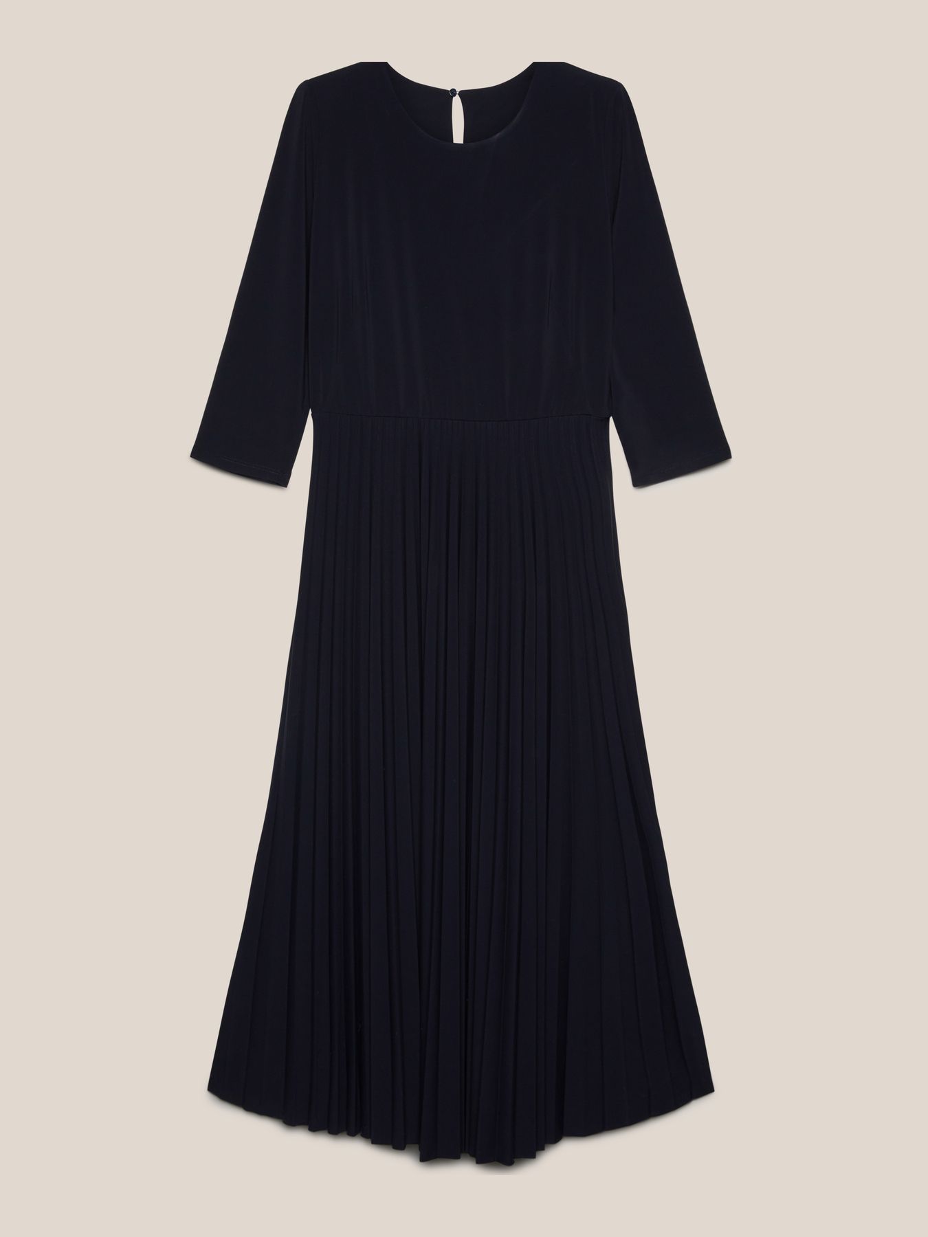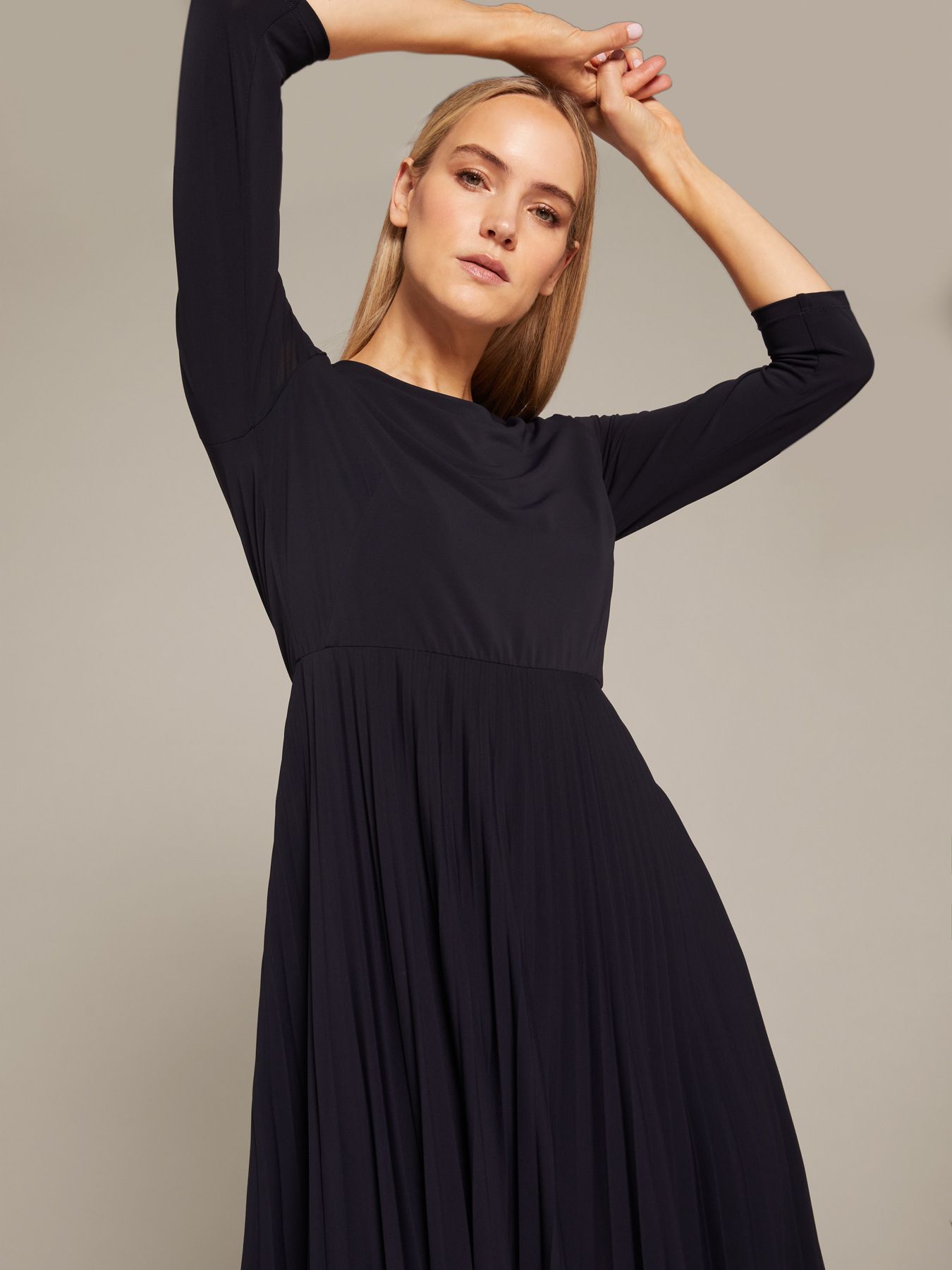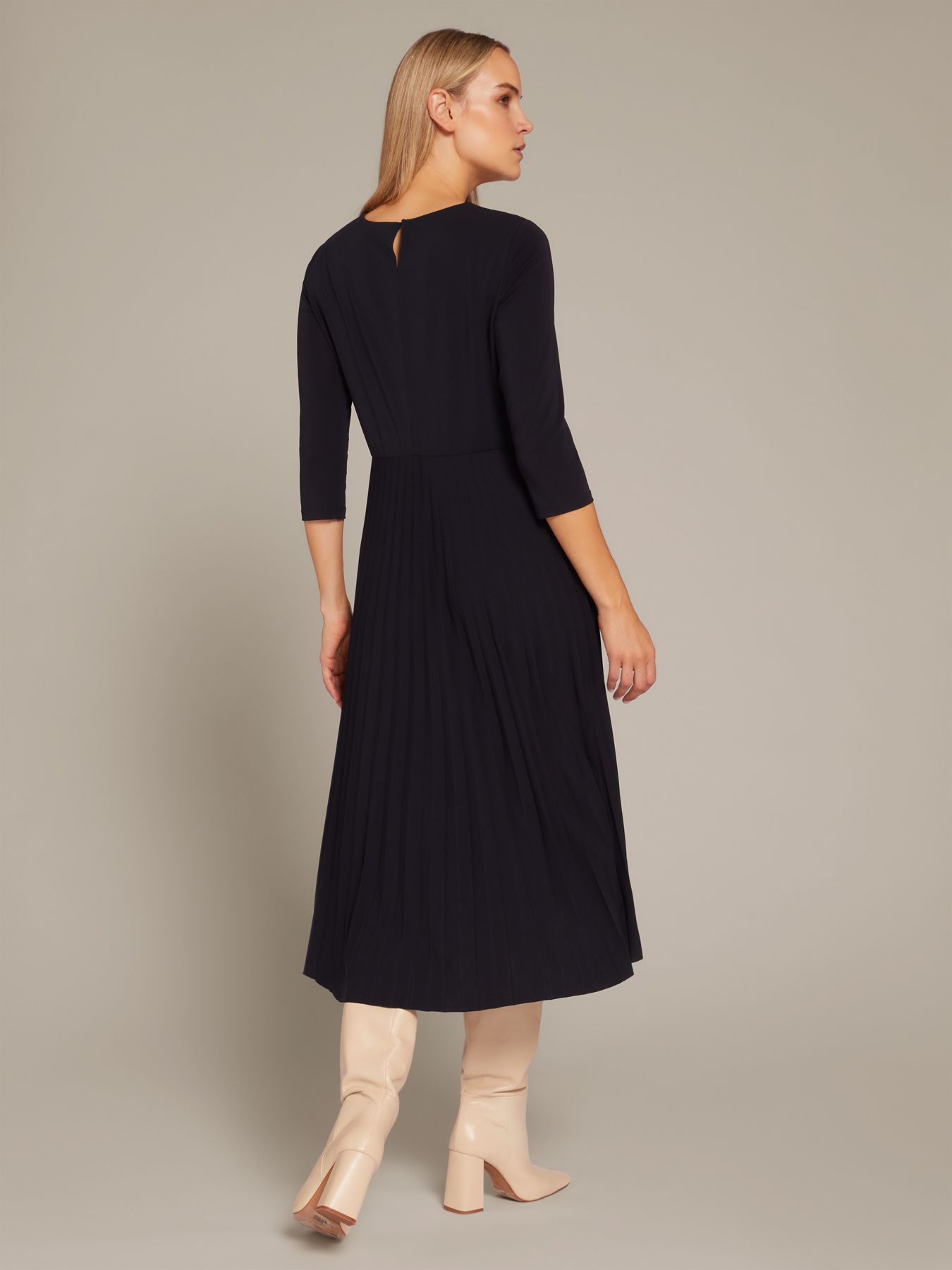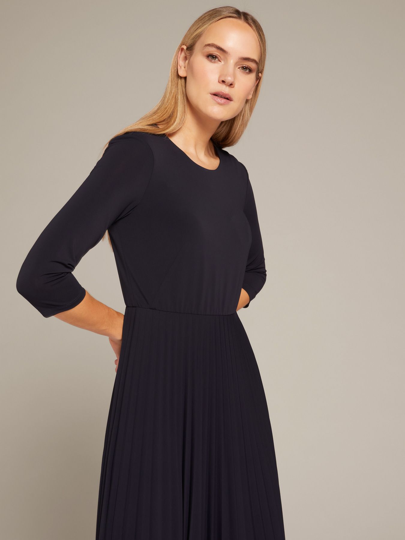 Элегантное платье из джерси с плиссированной юбкой. Круглый вырез, рукава длиной три четверти. Комфортная ткань гарантирует отличную посадку и делает платье универсальным и подходящим на каждый момент дня. Все, что остается, - это выбрать между каблуками и сапогами.