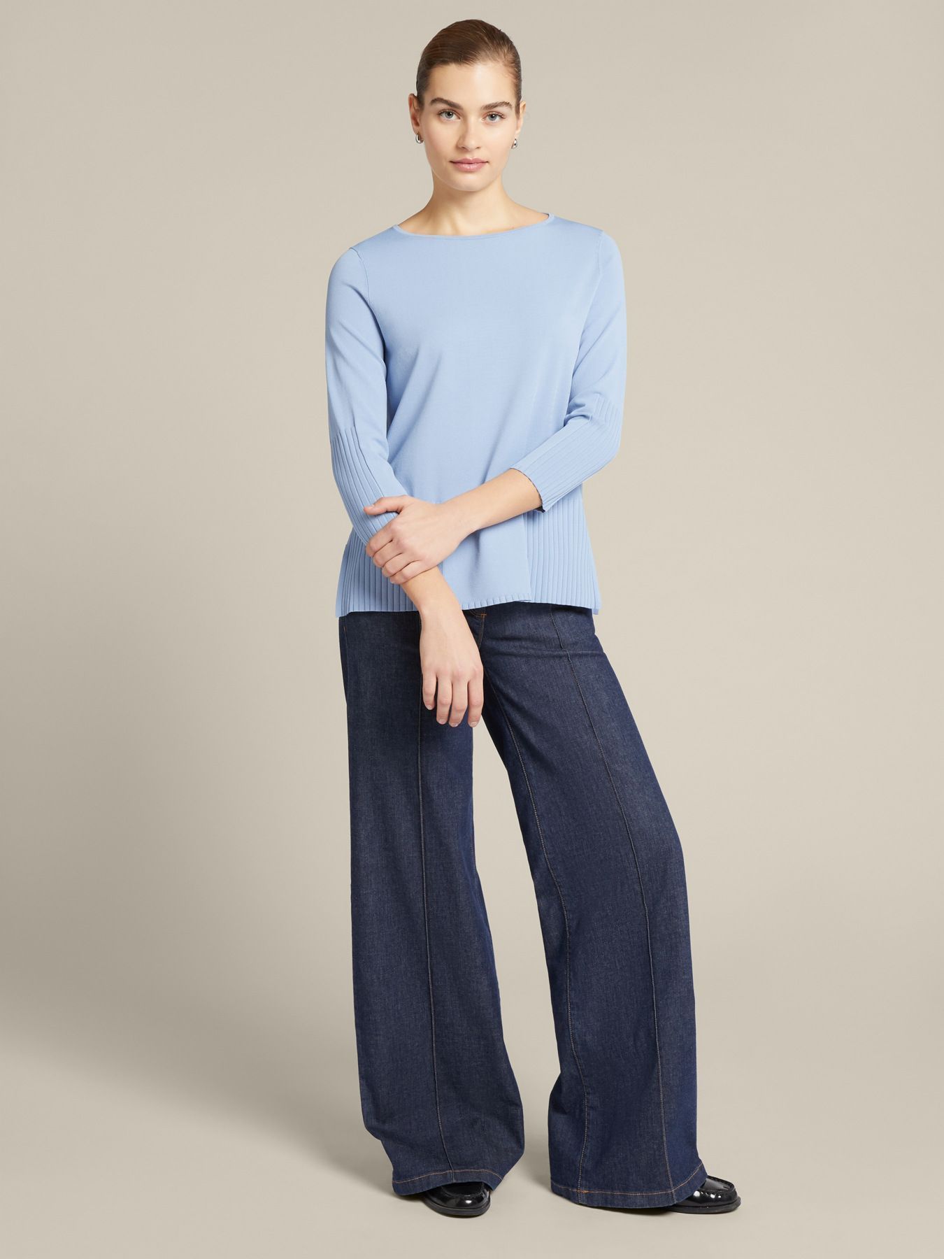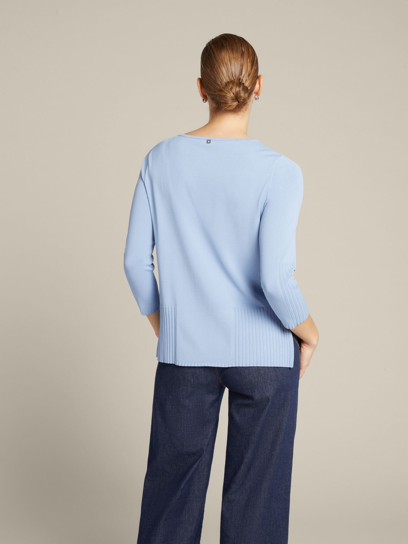 Джемпер гладкой трикотажной вязки с вырезом «лодочка», свободного кроя. Изготовлен из мягкой на ощупь вискозы. Декорирован широкой резинкой по низу и на рукавах, что совместно с лаконичным дизайном придает изысканности этой, на первый взгляд, базовой модели. Размер на модели: 46 RUS (44 IT) Параметры модели: рост 178 см, грудь 92 см, талия 66 см, бедра 101 см.
