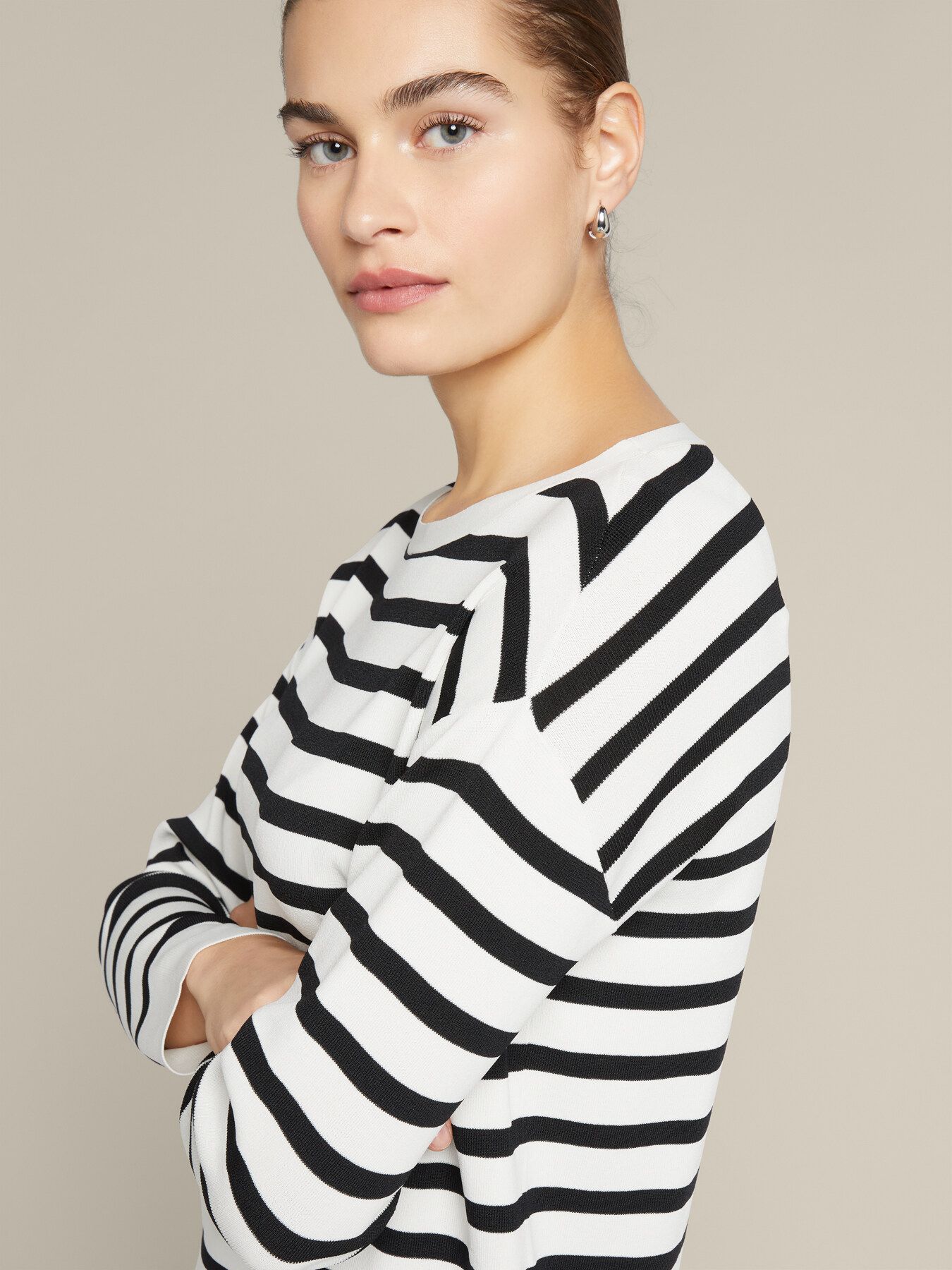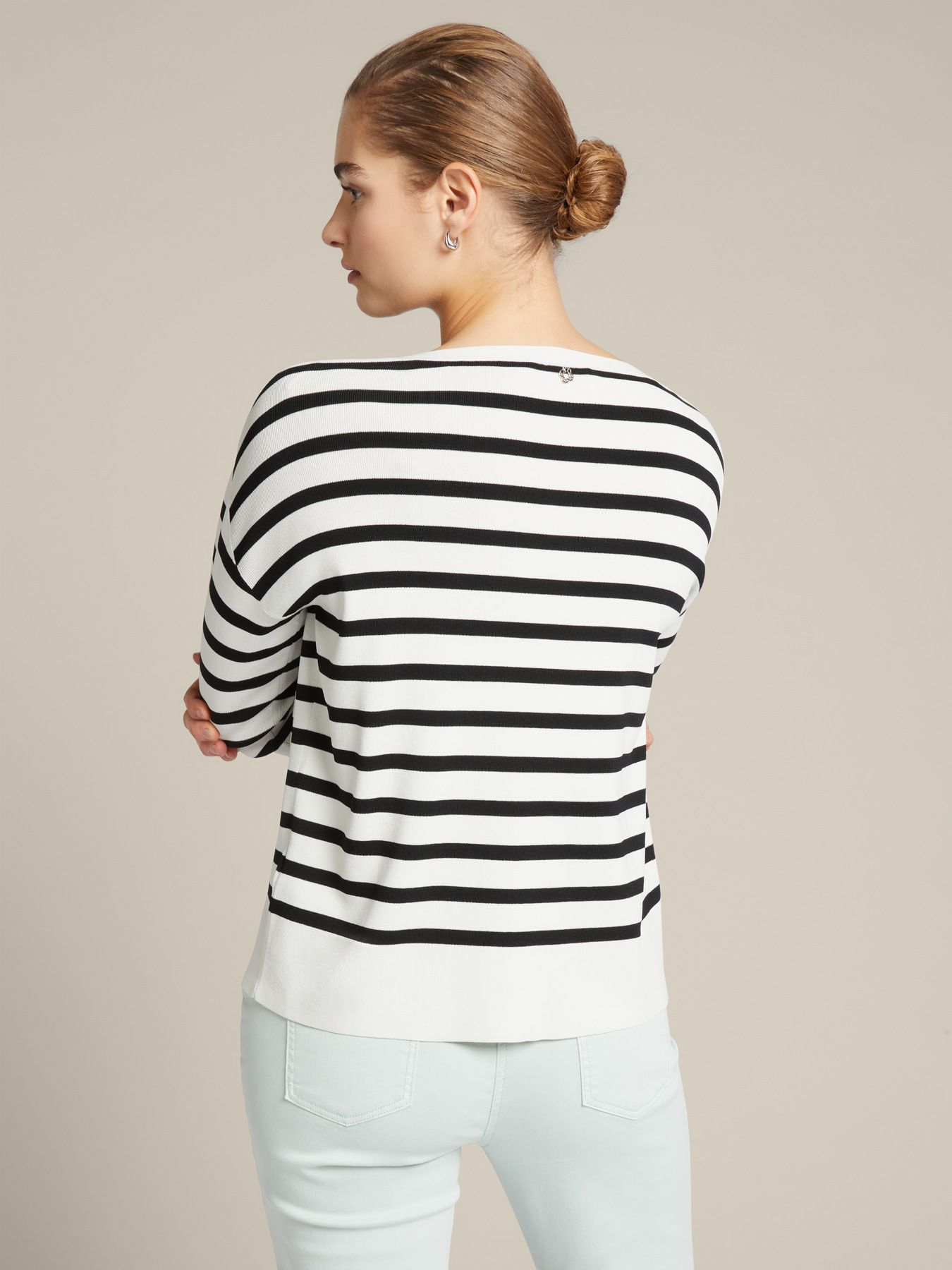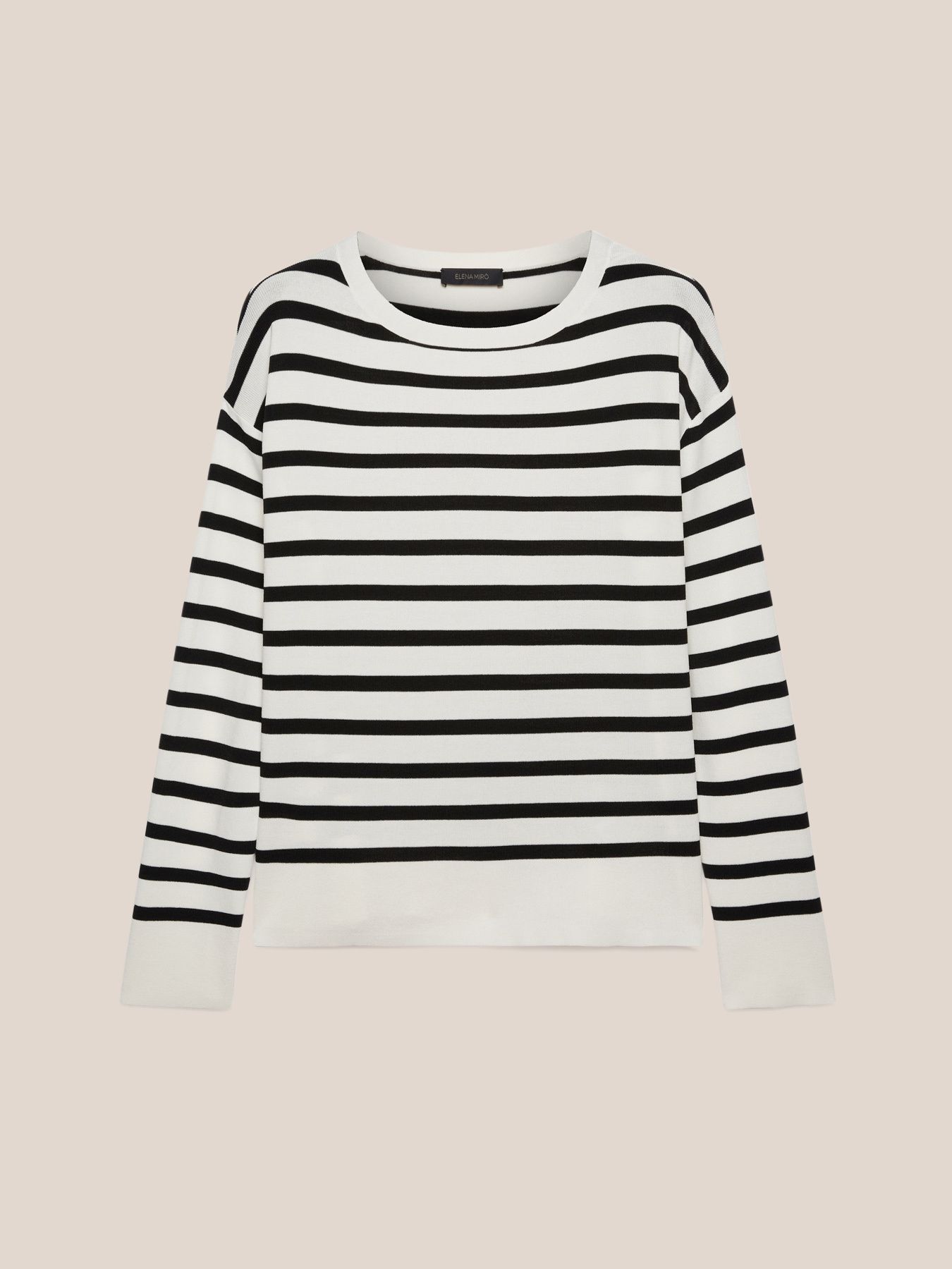 Женственный джемпер с круглым вырезом “лодочка”. Приспущенный рукав, черно-белый принт в полоску, мягкая креповая вискоза плотной вязки. Классический вариант на каждый день. Размер на модели: 46 RUS (44 IT) Параметры модели: рост 178 см, грудь 92 см, талия 66 см, бедра 101 см.