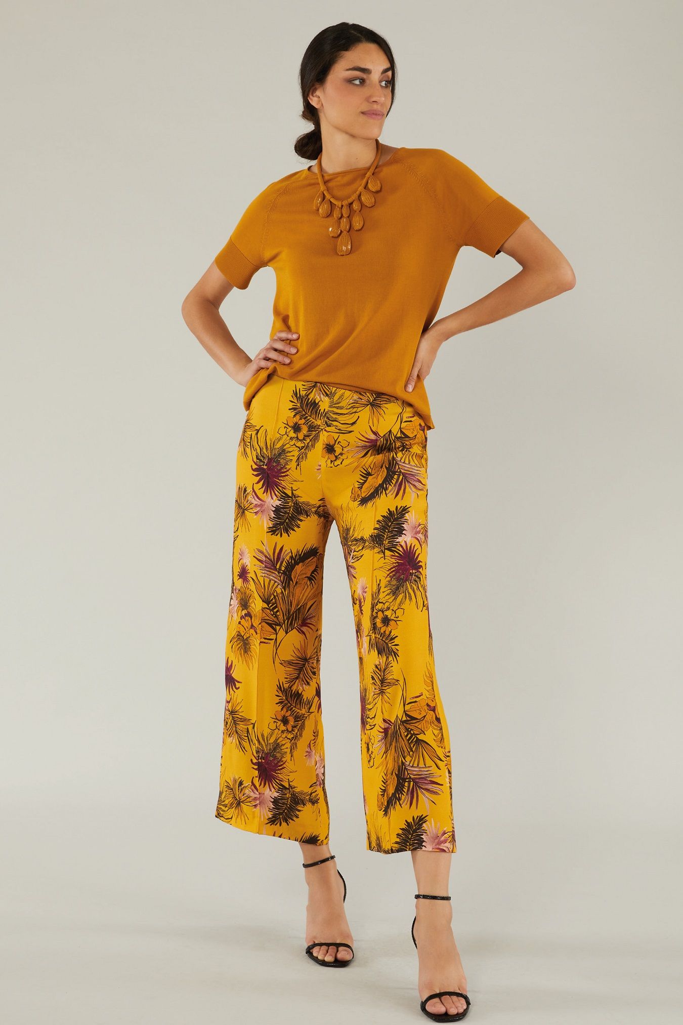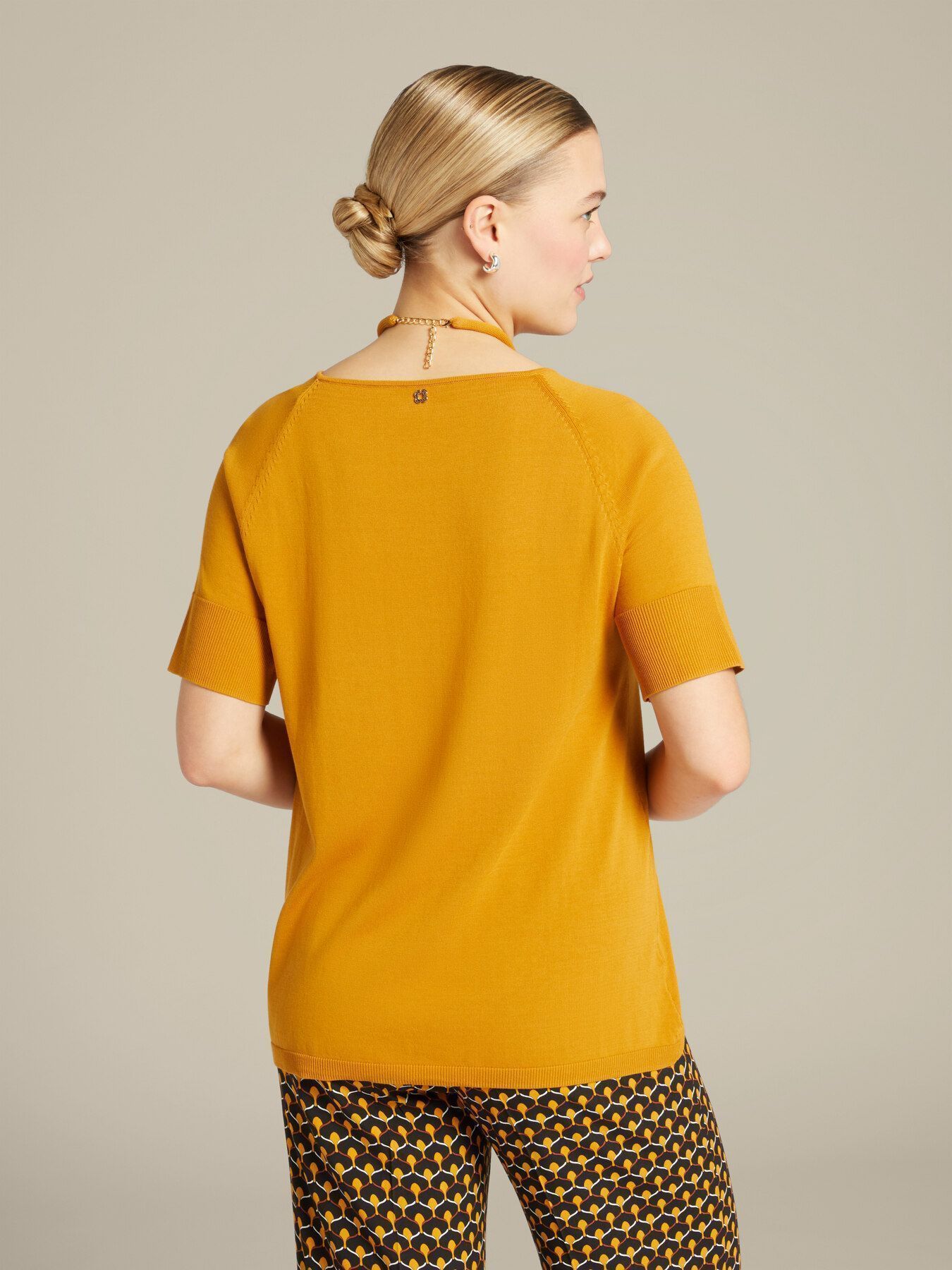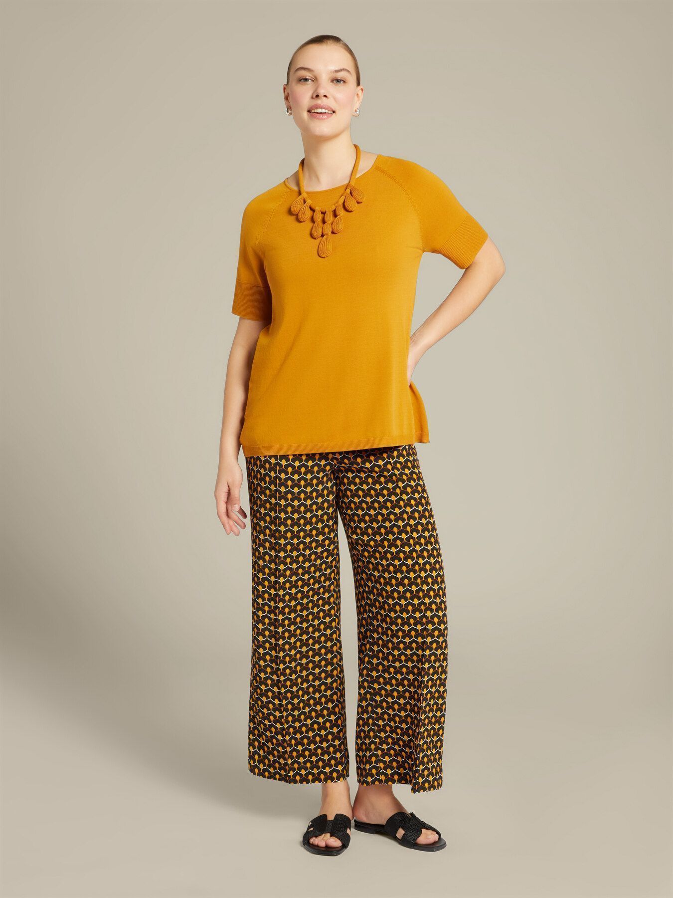 Свободный трикотажный джемпер с круглым вырезом, коротким рукавом реглан. Ярким акцентом станет оригинальное колье, выполненное из той же пряжи. Отличный вариант как на работу, так и на неформальную встречу.