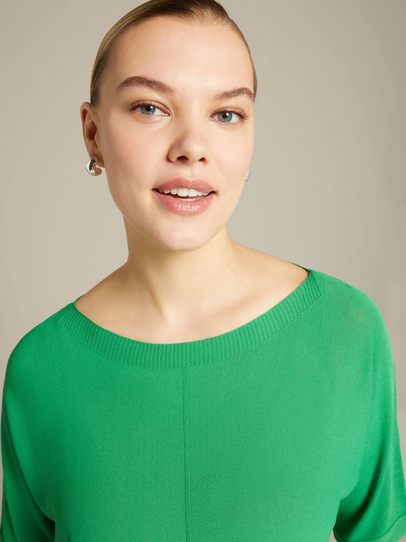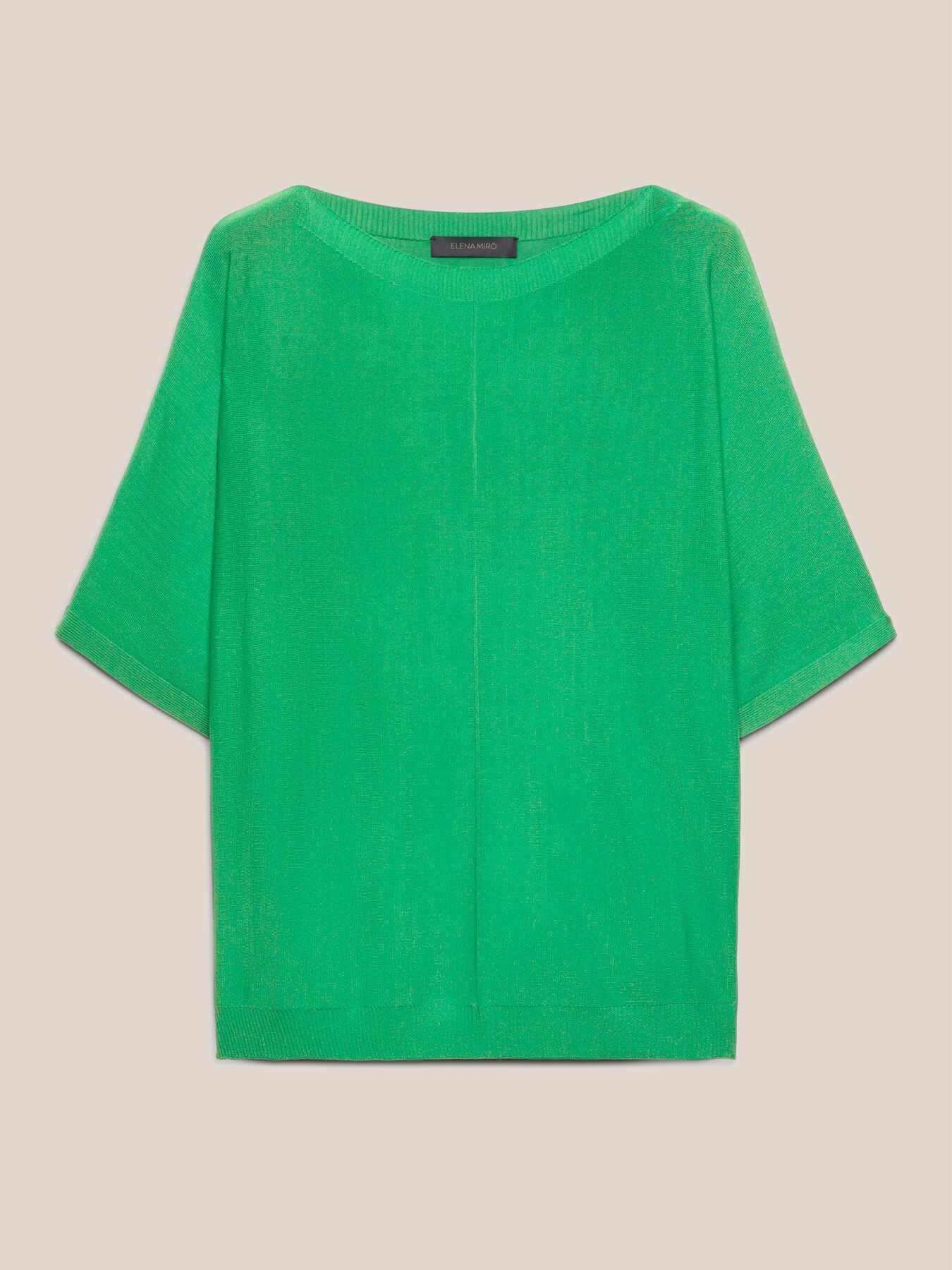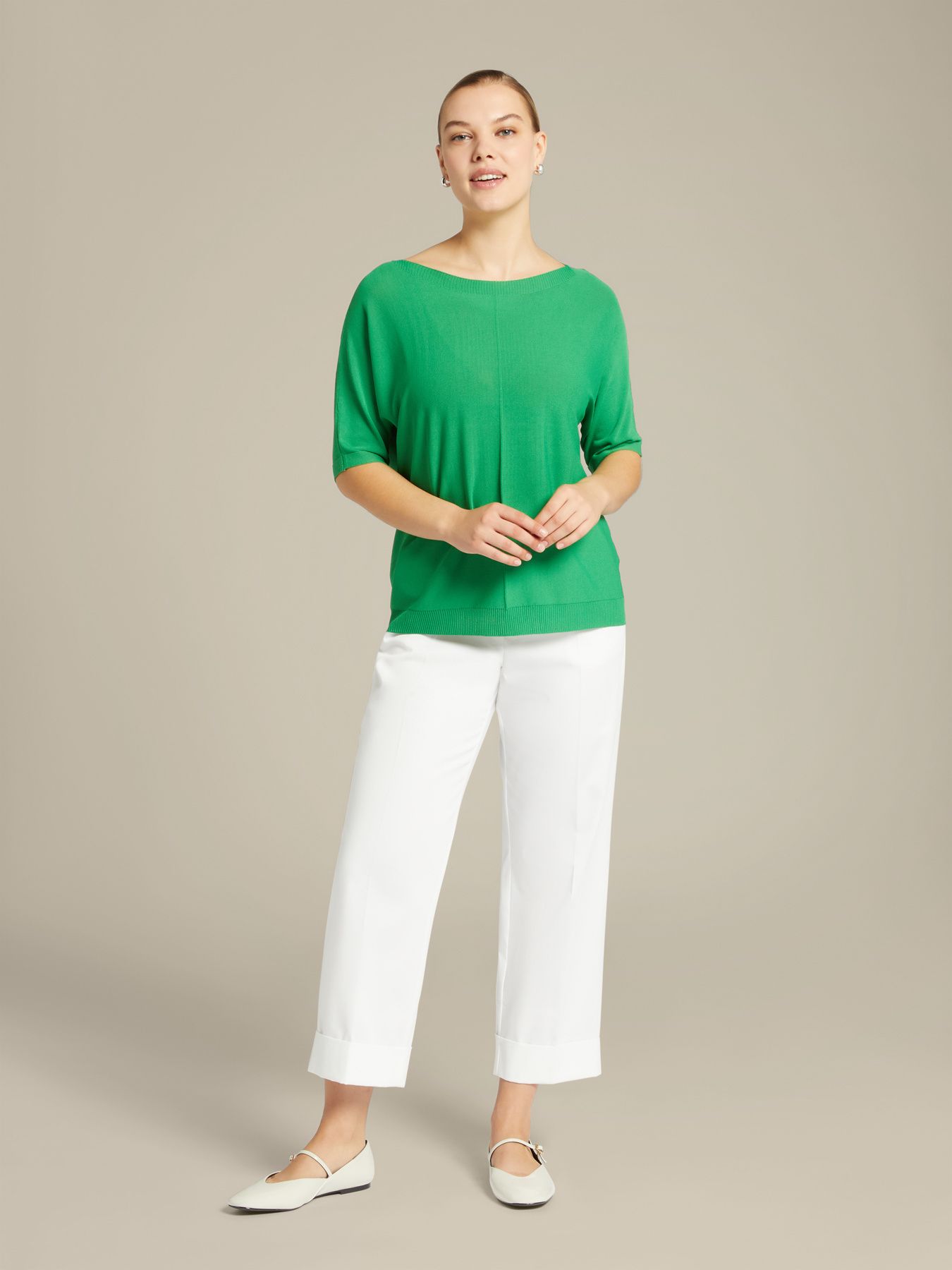 Изящный джемпер с коротким рукавом из легкого вискозного крепа. Вырез "лодочка", декорирован резинкой по низу и рукаву. Модель, изысканная в своей простоте, станет отличным дополнением к джинсам или облегающим брюкам.