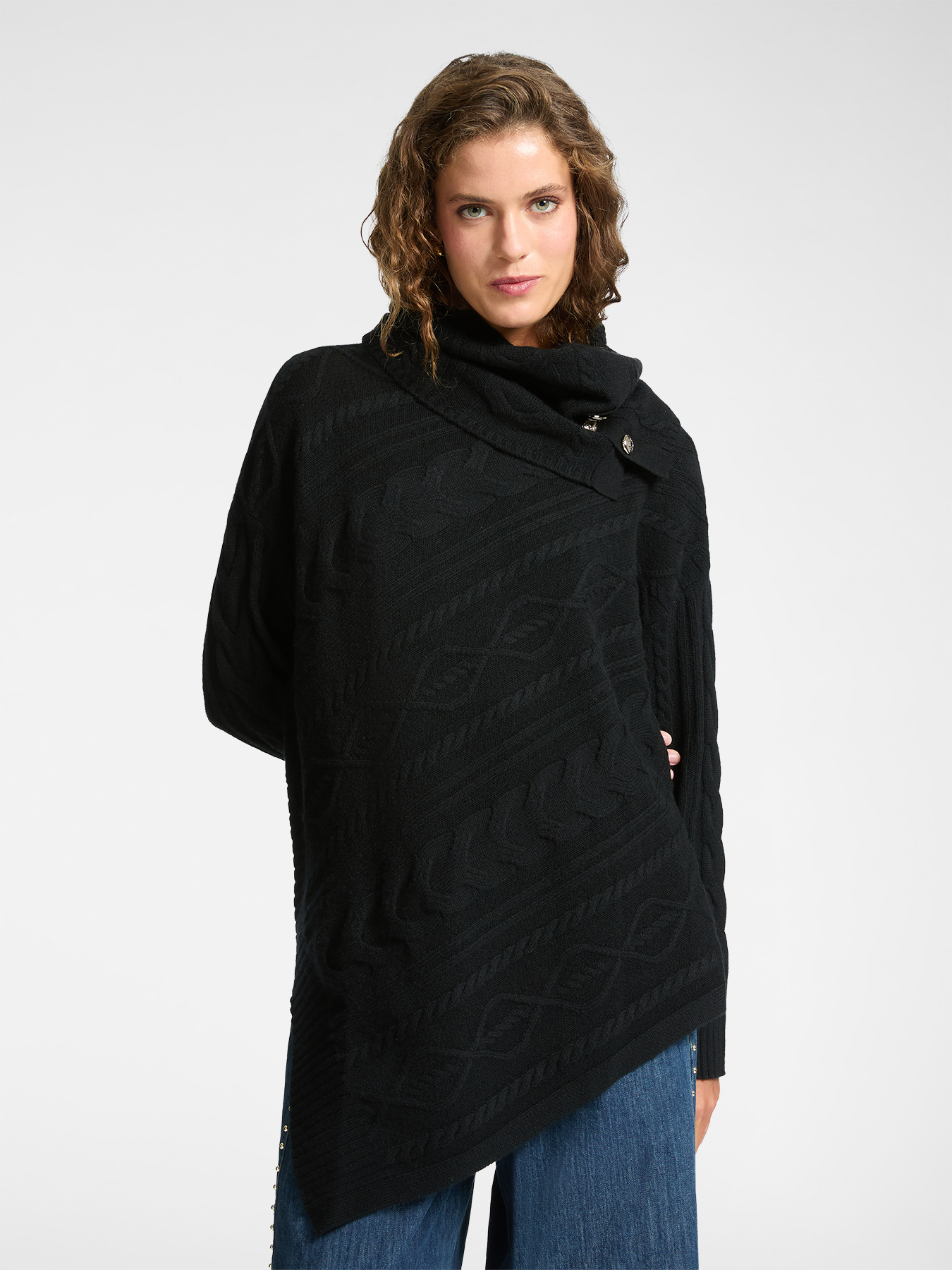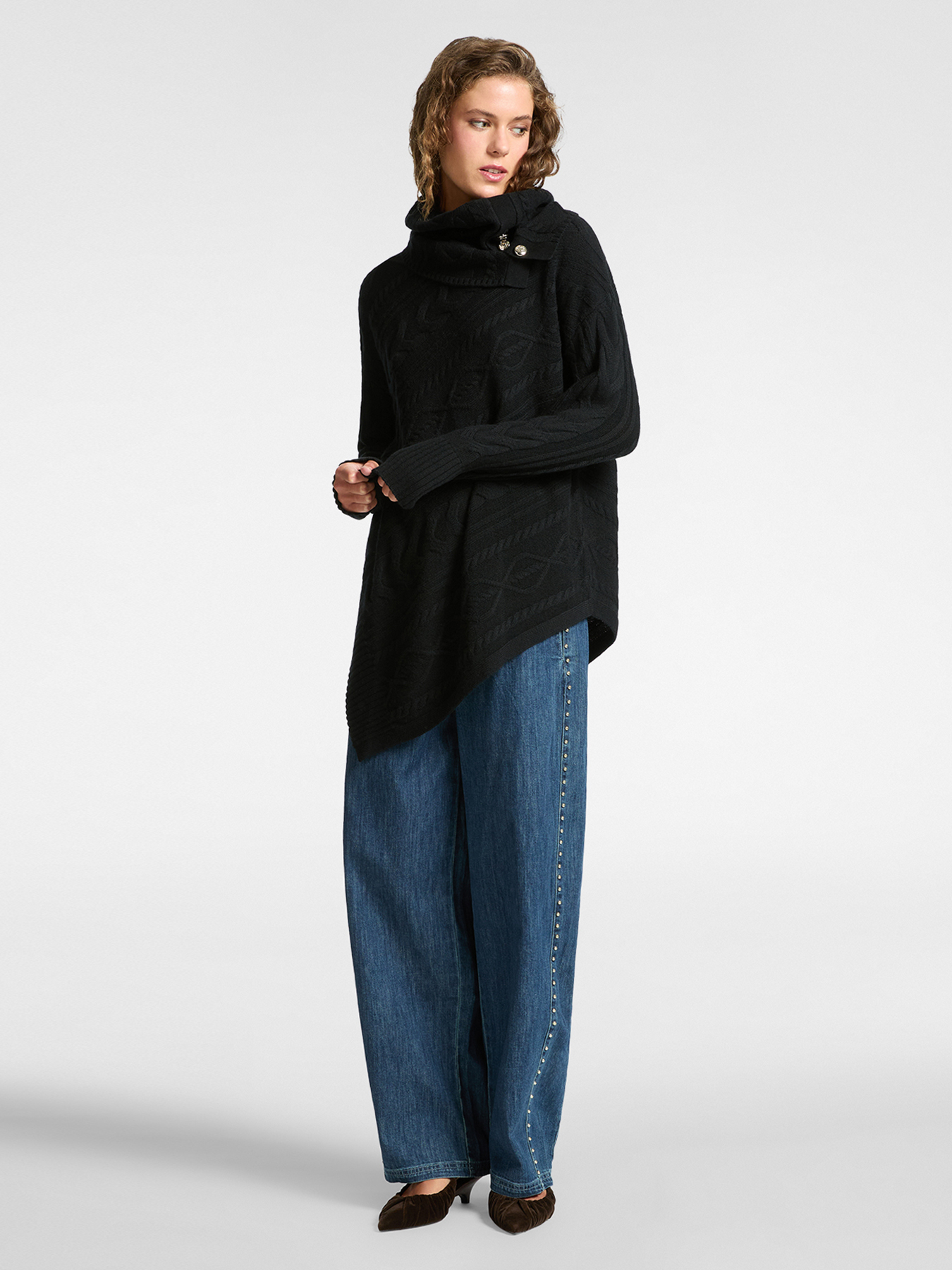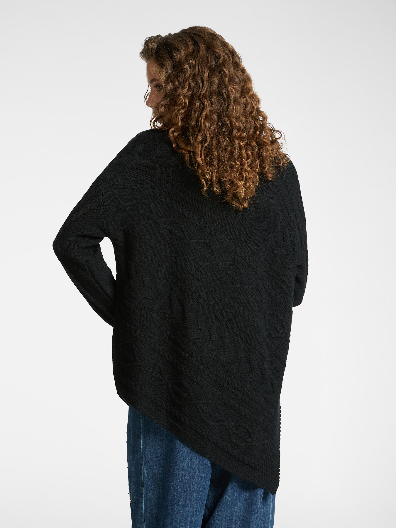 Асимметричный свитер из мягкой 100% шерсти с широким мягким воротником и небольшими пуговицами с монограммой бренда. Переплетенные стежки и диагонально расположенная вязка в виде кос. Теплое и удобное изделие, напоминающее ирландские свитер «ARAN». Идеально подходящее изделие для холодного зимнего сезона
