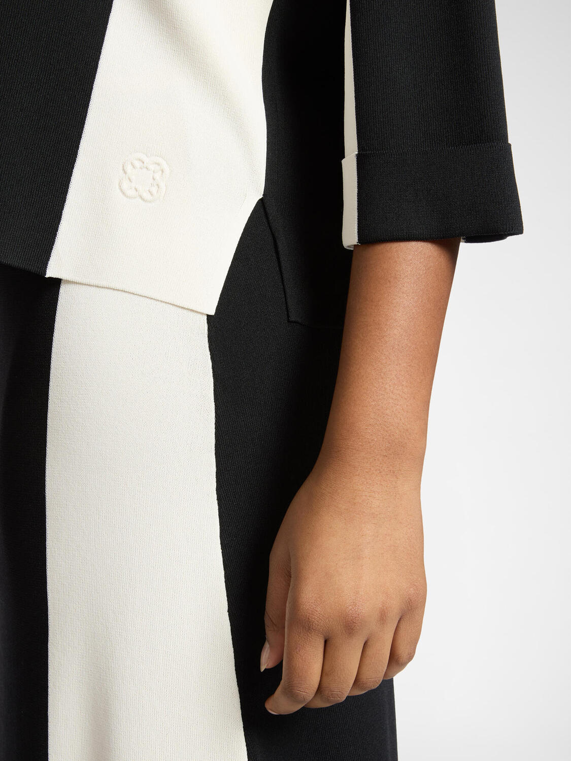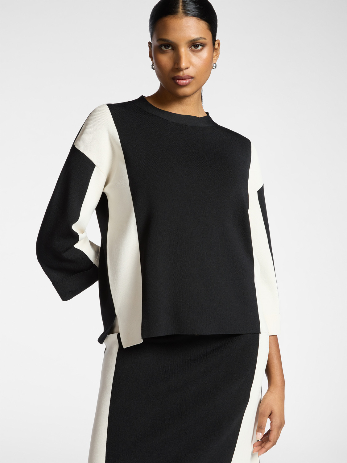 Джемпер из смесовой вискозной пряжи. Спущенная линия плеч, длинный рукав, свободный крой и вырез лодочка. Интересный колорблок, выполненный в черно-белых оттенках. Небольшая тисненная монограмма. Изделие входят в капсулу «ATHLEISURE», объединяющую комфорт и удобство спортивного шика и изысканный стиль базовых изделий.