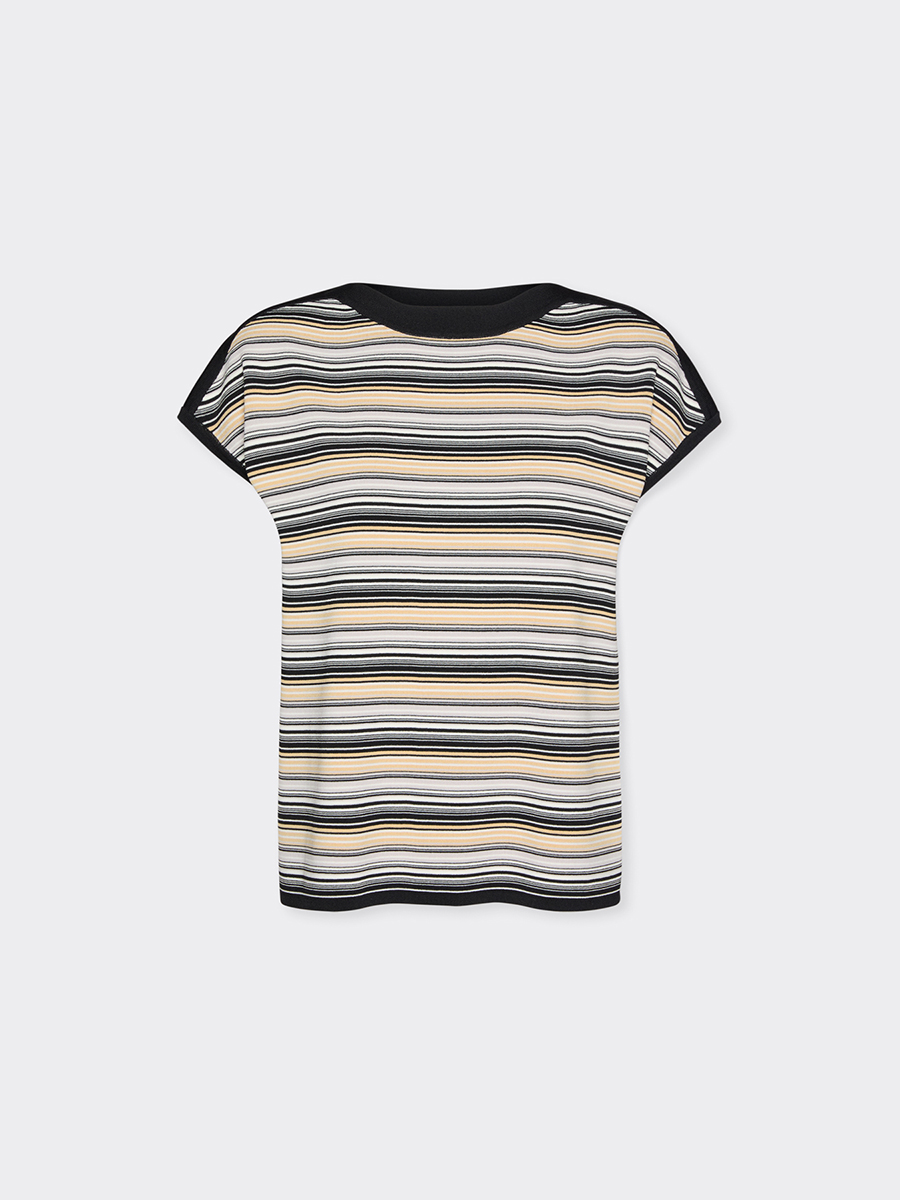 Джемпер с коротким рукавом из смесовой вискозной пряжи. Рукава, повторяющие крой кимоно, вырез лодочка, принт в тонкую полоску. Женственное, уникальное изделие, подходящее под любые повседневные образы. Изделие входят в капсулу «ATHLEISURE», объединяющую комфорт и удобство спортивного шика и изысканный стиль базовых изделий.