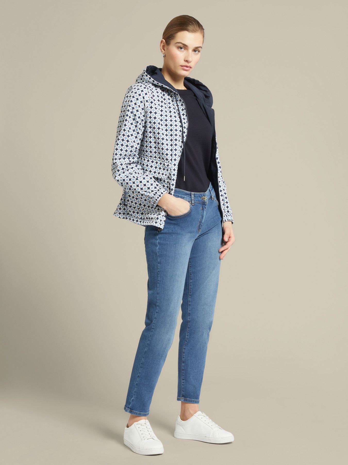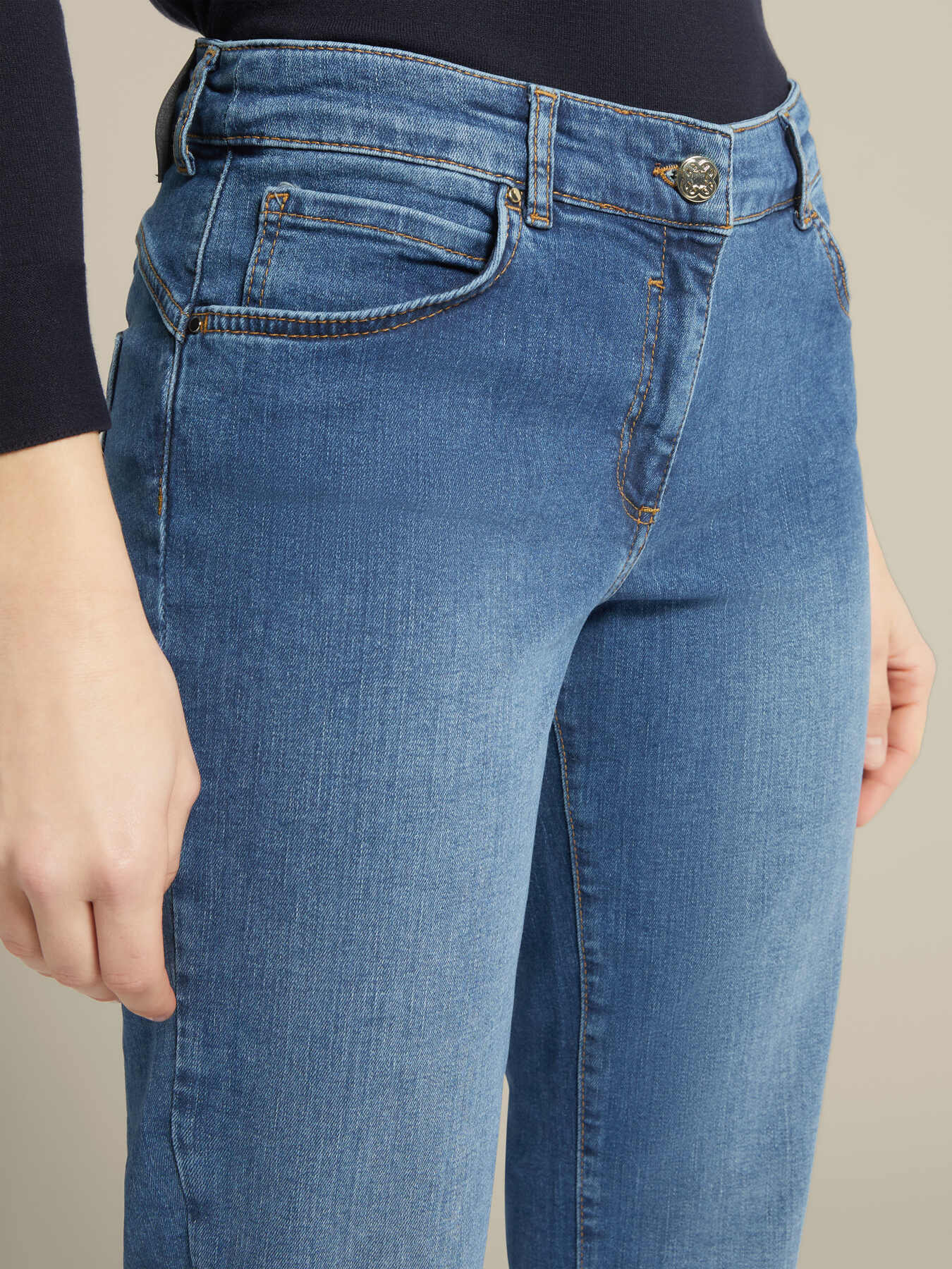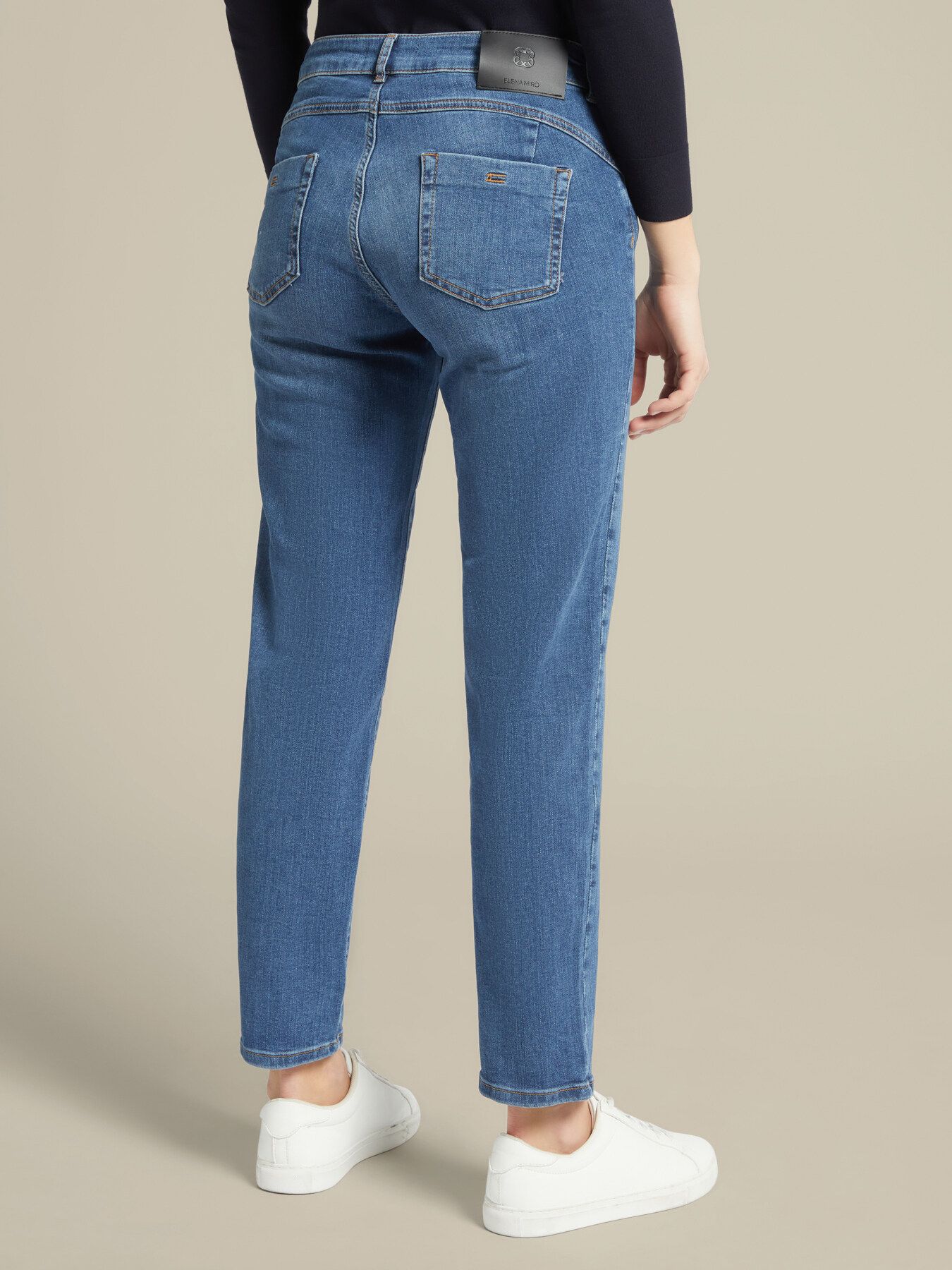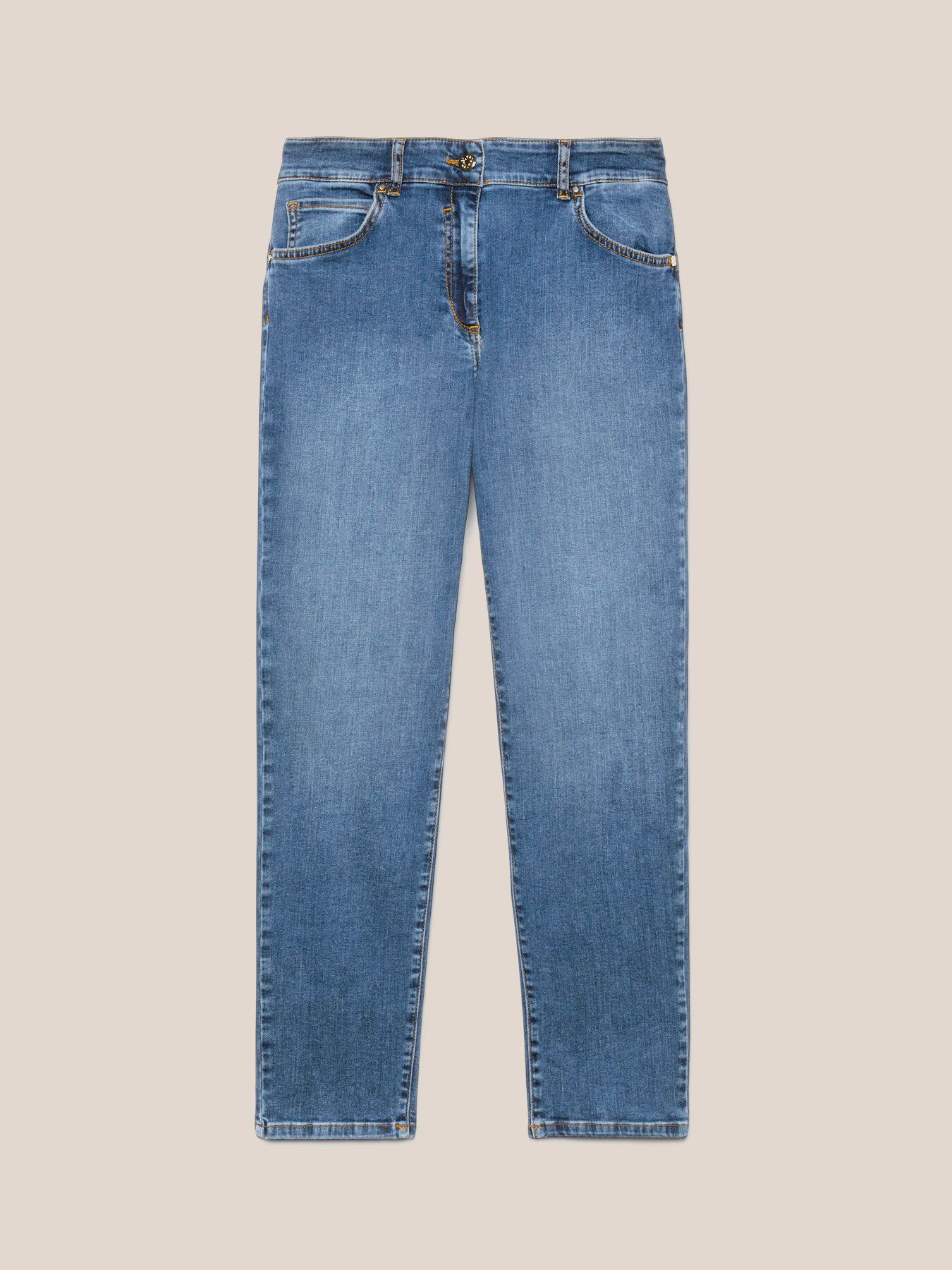 Элегантные зауженные джинсы из эластичного хлопка. Полная длина, стандартная линия талии, кокетка сзади с эффектом пуш-ап, застегиваются на пуговицу и молнию. Идеально подходит для неформального современного образа. Размер на модели: 46 RUS (44 IT) Параметры модели: рост 178 см, грудь 92 см, талия 66 см, бедра 101 см.