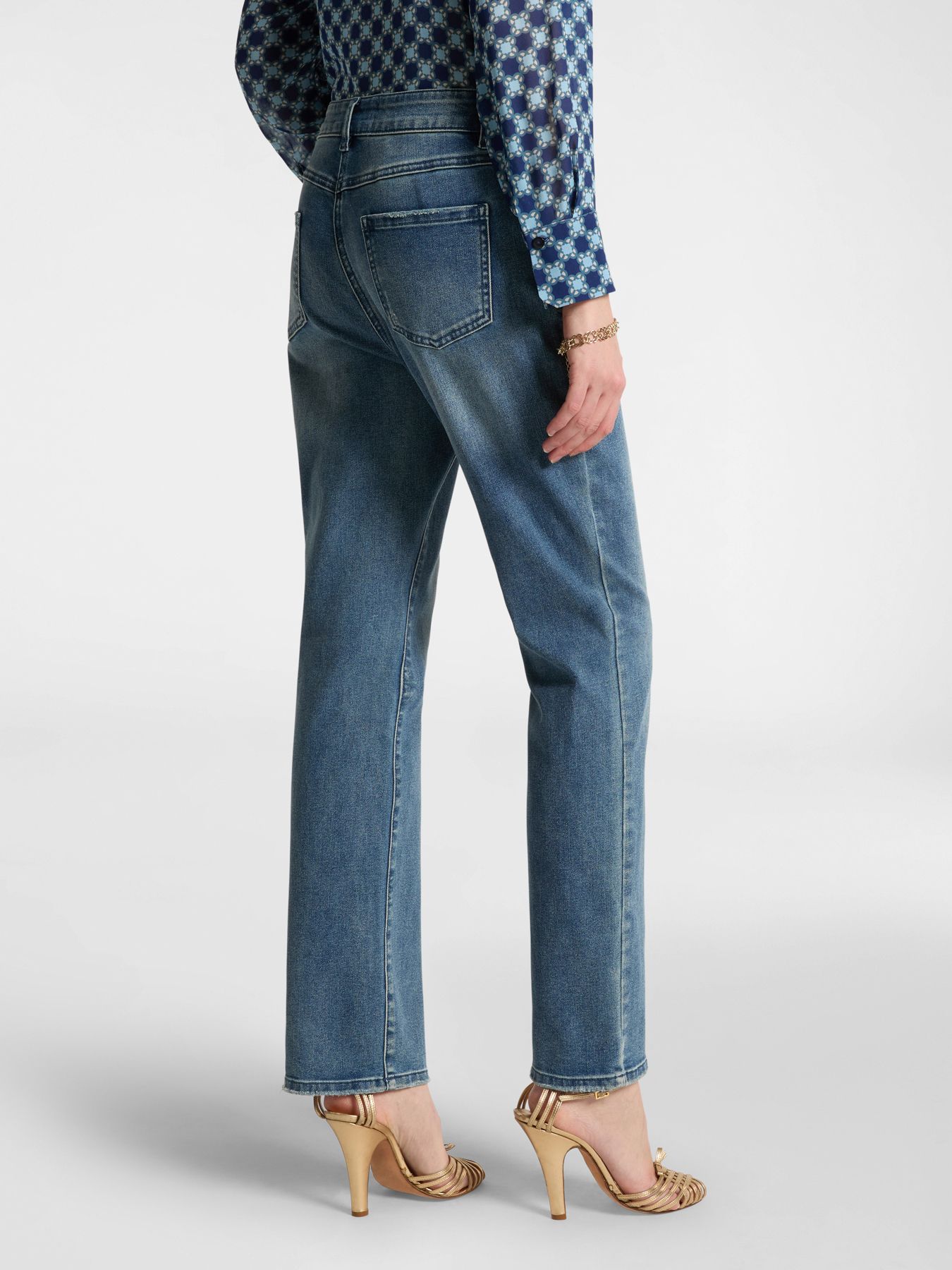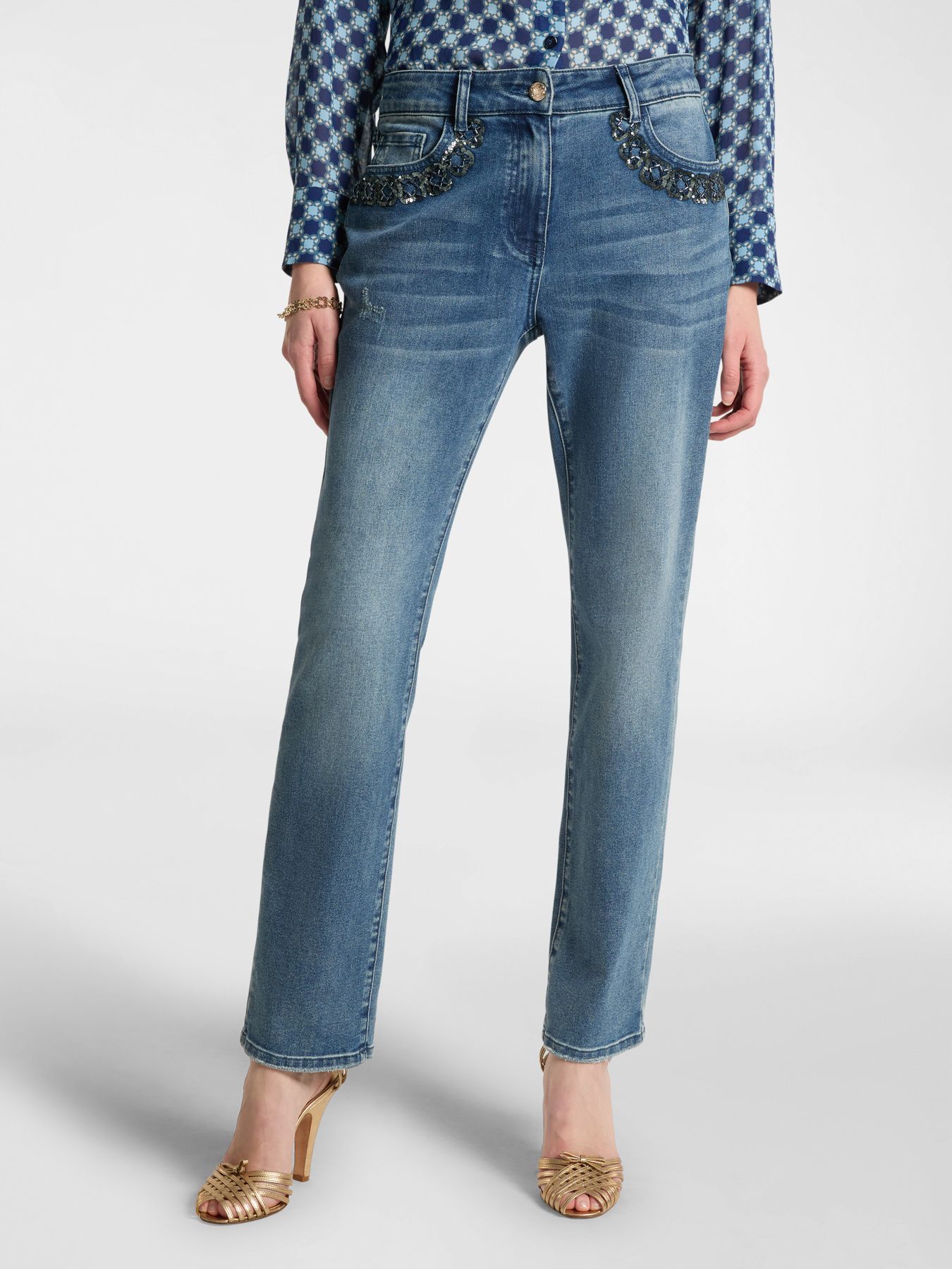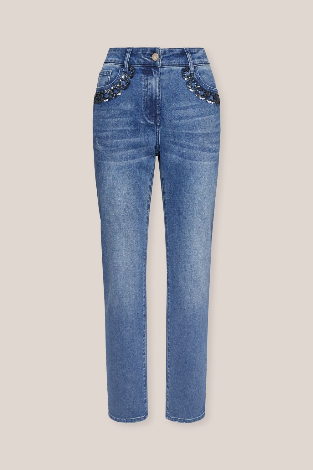 Прямые джинсы с пятью карманами. Уникальный цвет джинс получится в результате стирки с камнями. Карманы декорированы монограммами из пайеток и бусин. Идеально подходит для повседневных или элегантных образов