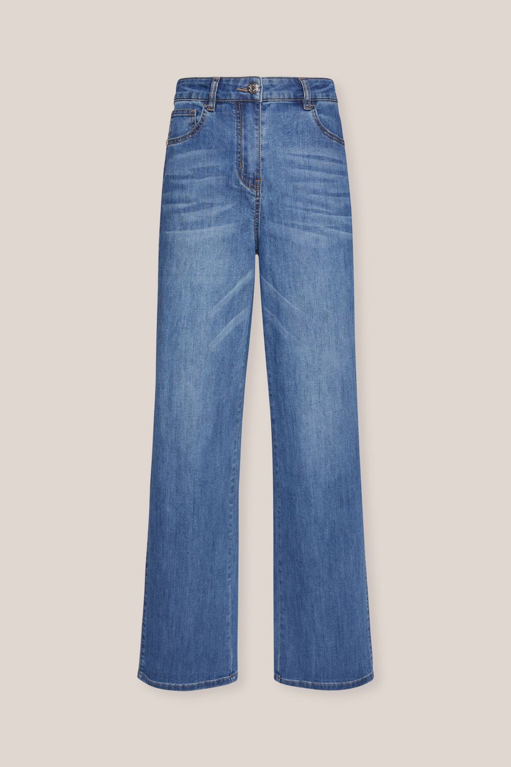 Джинсы с 5 карманами и широкими брючинами. Средний синий тон достигается легкой стиркой с энзимами и ручной обработкой Украшены небольшой вышивкой монограммы на заднем кармане.