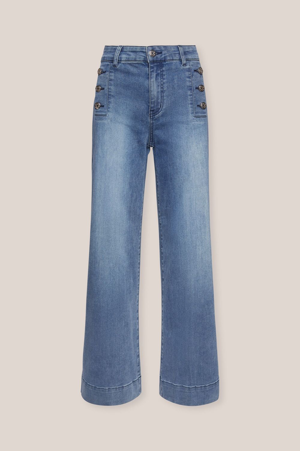 Укороченные прямые джинсы с 5 карманами. Пуговицы спереди повторяют морской стиль капсулы. Джинсовая ткань выполнена в средне-синих тонах. Эта классическая неподвластная времени модель, вытягивает силуэт и идеально подходит для стильных современных образов.