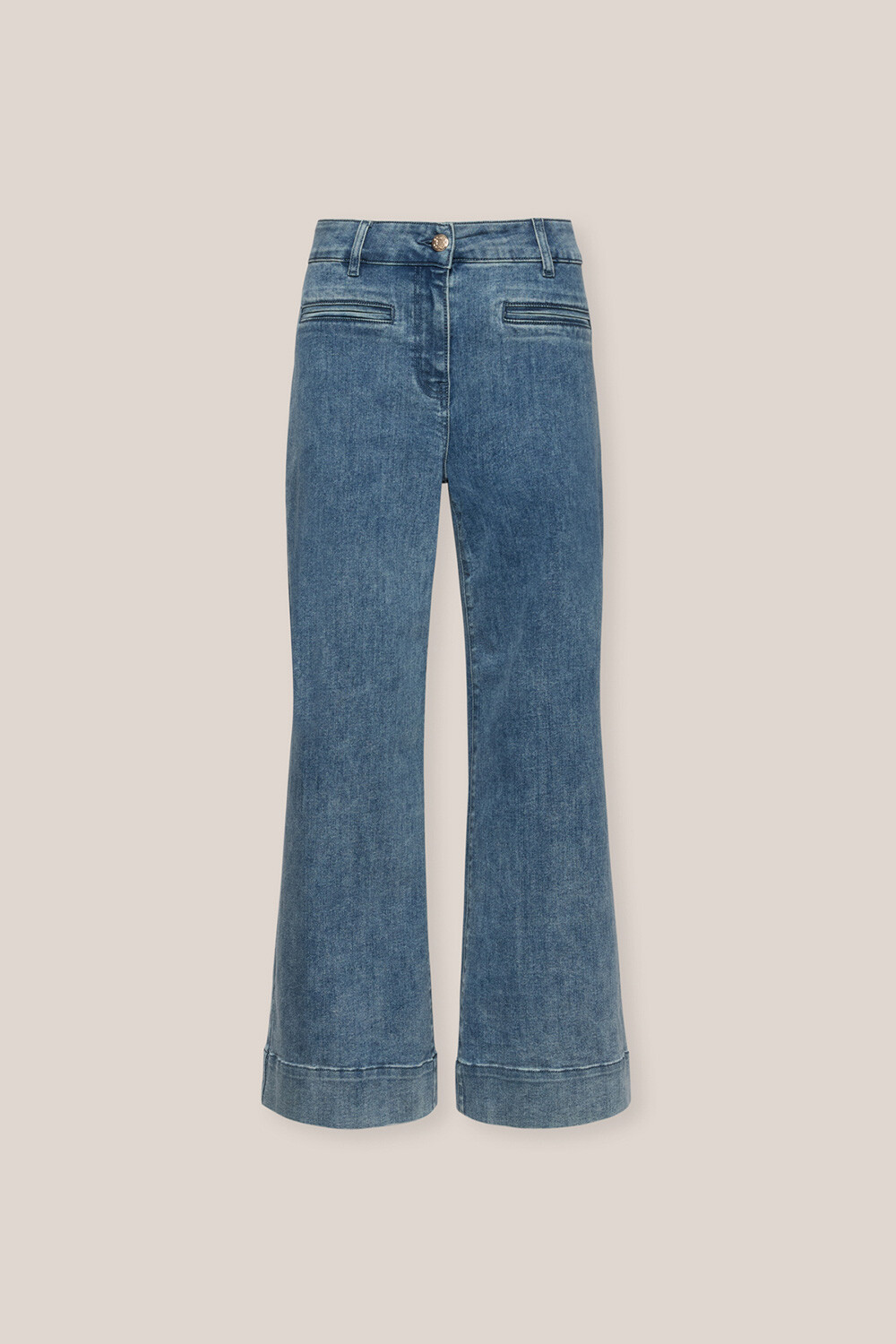 Широкие джинсы Мэри. Светло-голубой выстиранный тон, прорезные карманы спереди, вышитая монограмма на заднем кармане. Особенное, но базовое изделие, подходящее и под повседневные и под вечерние образы.