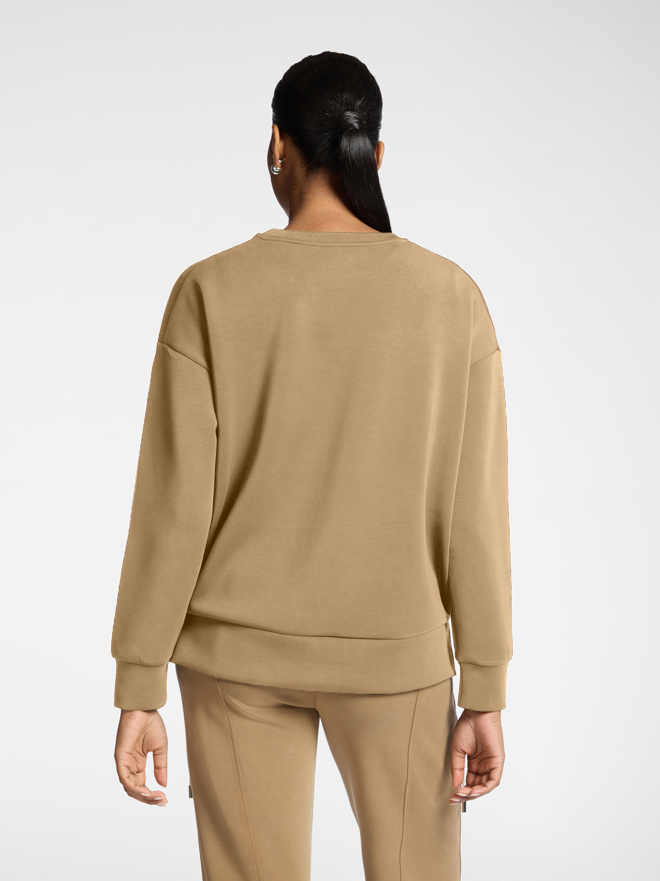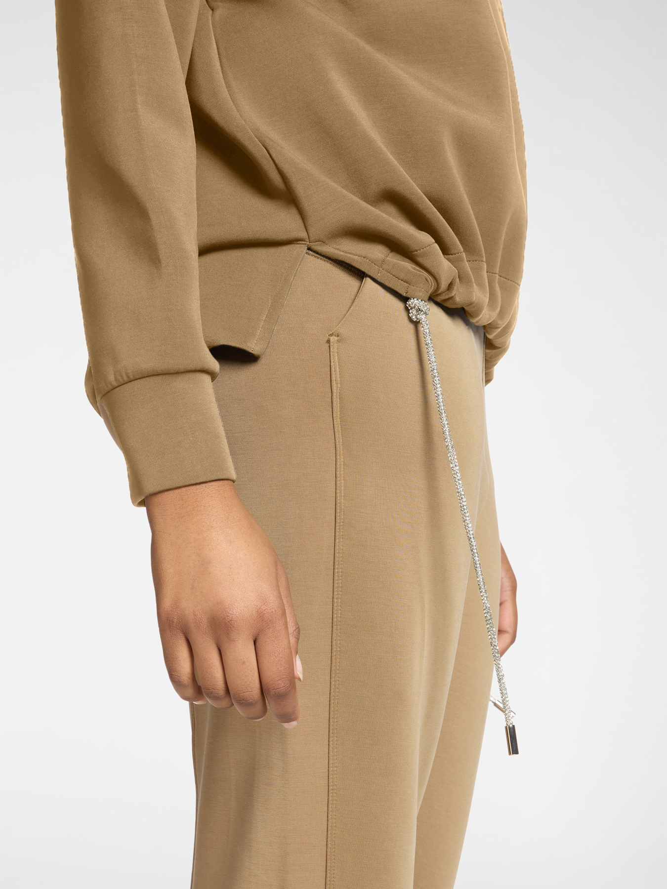 Свитшот из скубы с круглым вырезом. Разрезы по бокам, кулиска, украшенная стразами. Спущенная линия плеч, длинный рукав. Эмбоссированная монограмма бренда в центре изделия. Джемпер входит в капсулу «ATHLEISURE», объединяющую комфорт, удобство спортивного шика и изысканный стиль базовых изделий. Прекрасно сочетается с брюками в комплекте.