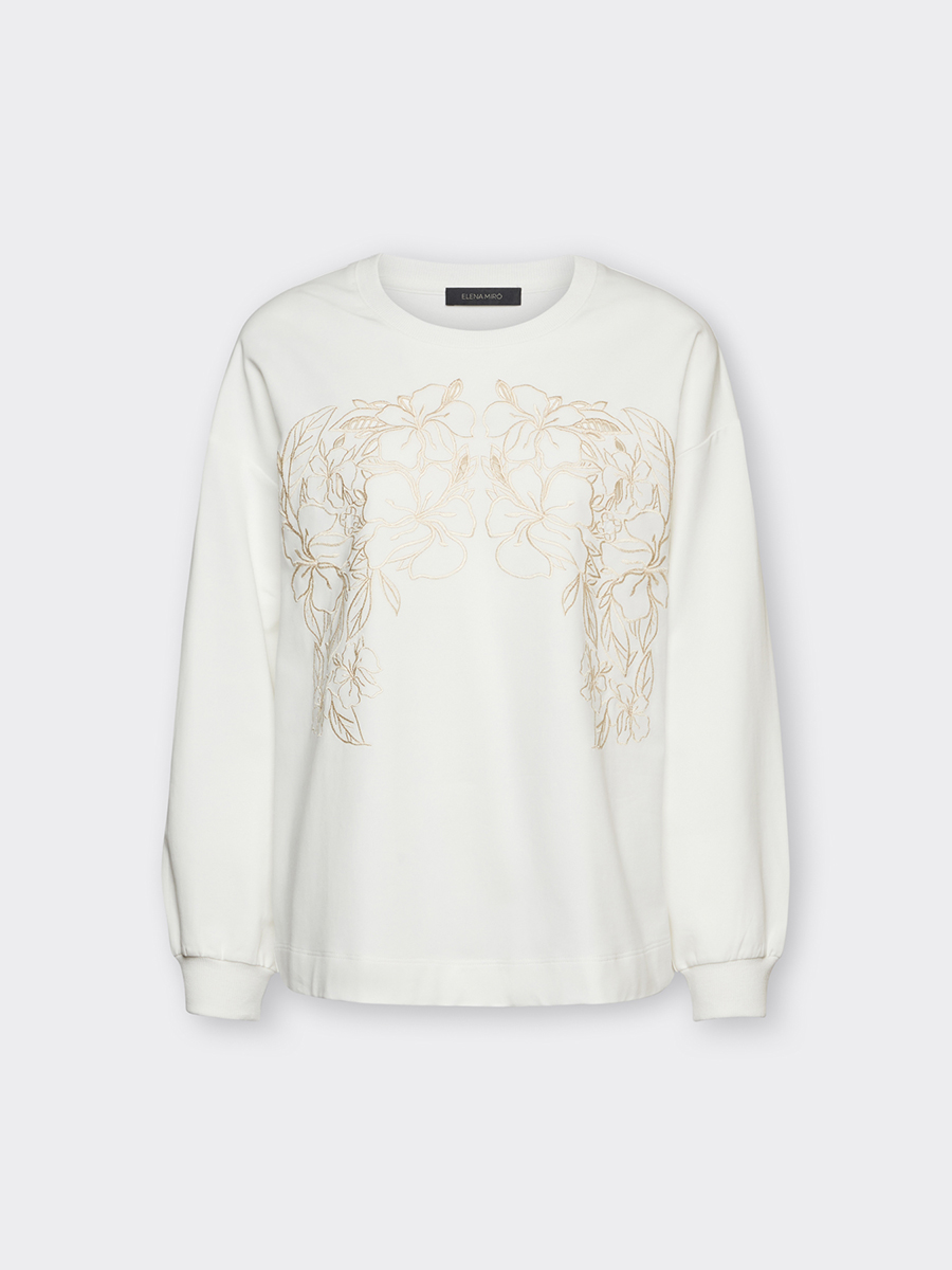 Свитшот из эластичного хлопка. Спущенная линия плеч, длинный рукав, круглый вырез. Изделие украшено ажурной цветочной вышивкой. Женственное, уникальное изделие, подходящее под любые повседневные образы.