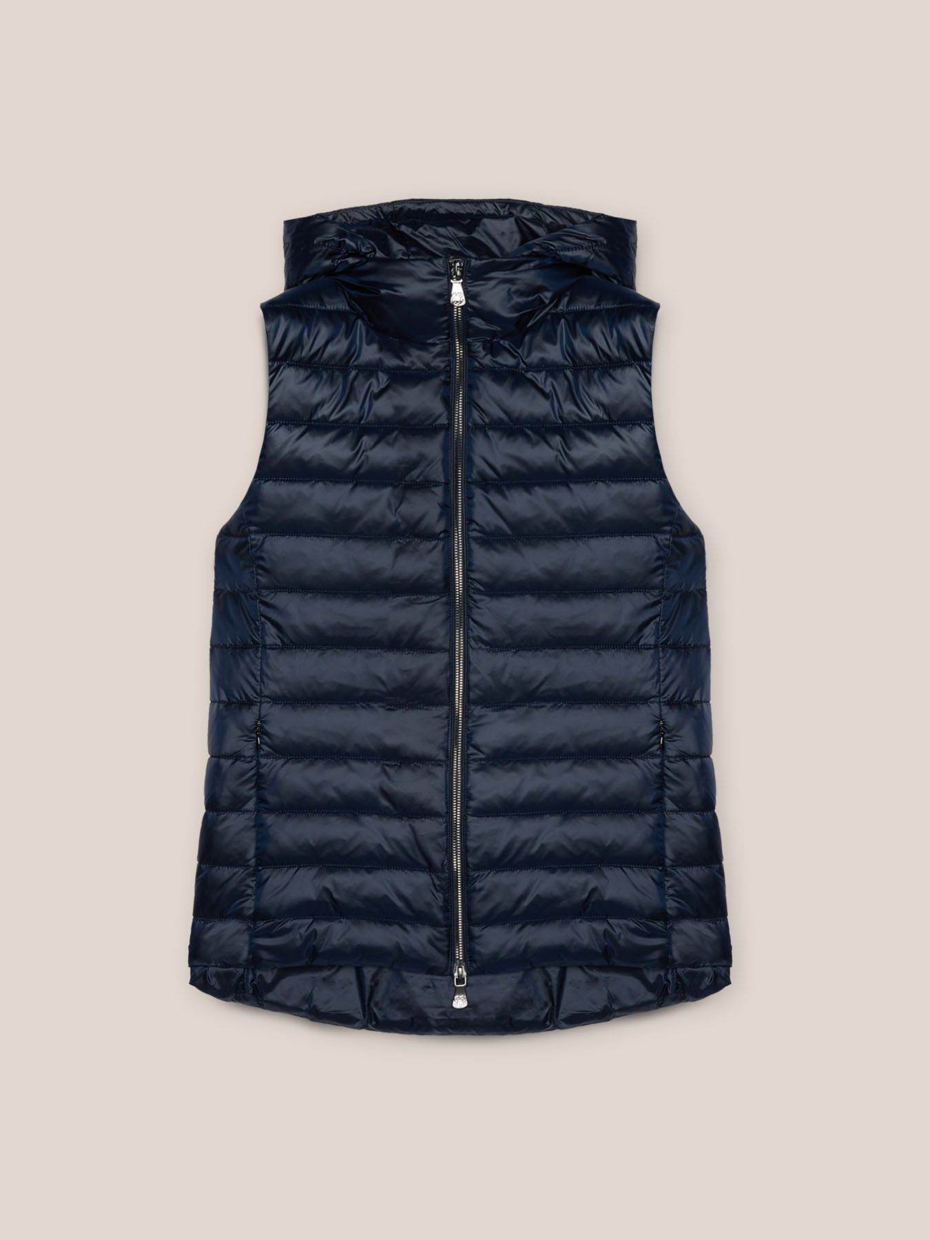 Стеганый жилет из 100% переработанного нейлона. Регулируемая кулиска, закругленный низ, съемный капюшон, застегивается на молнию. Модель изготовлена из ветрозащитного, непромокаемого материала. Размер на модели: 46 RUS (44 IT) Параметры модели: рост 178 см, грудь 92 см, талия 66 см, бедра 101 см.
