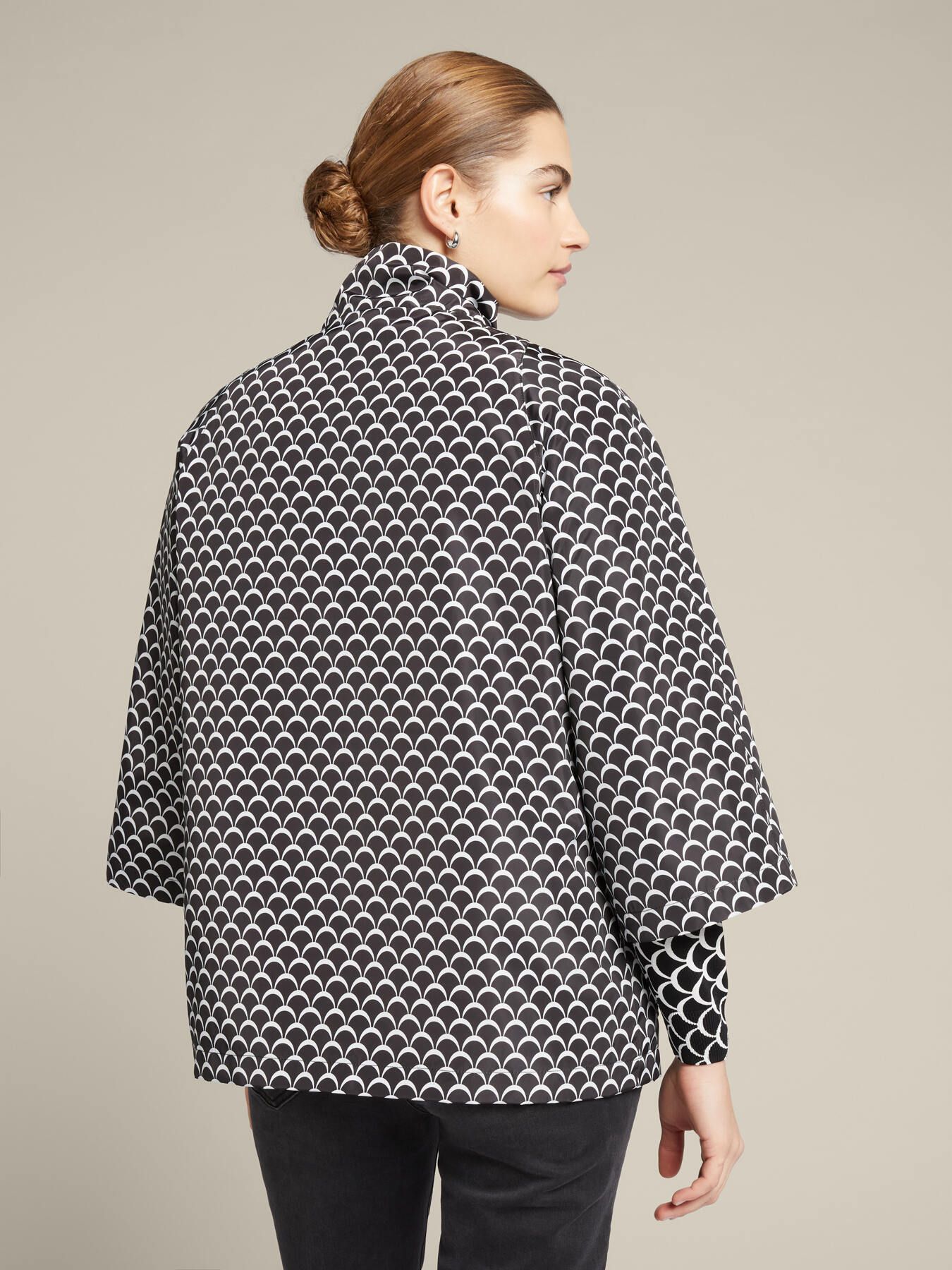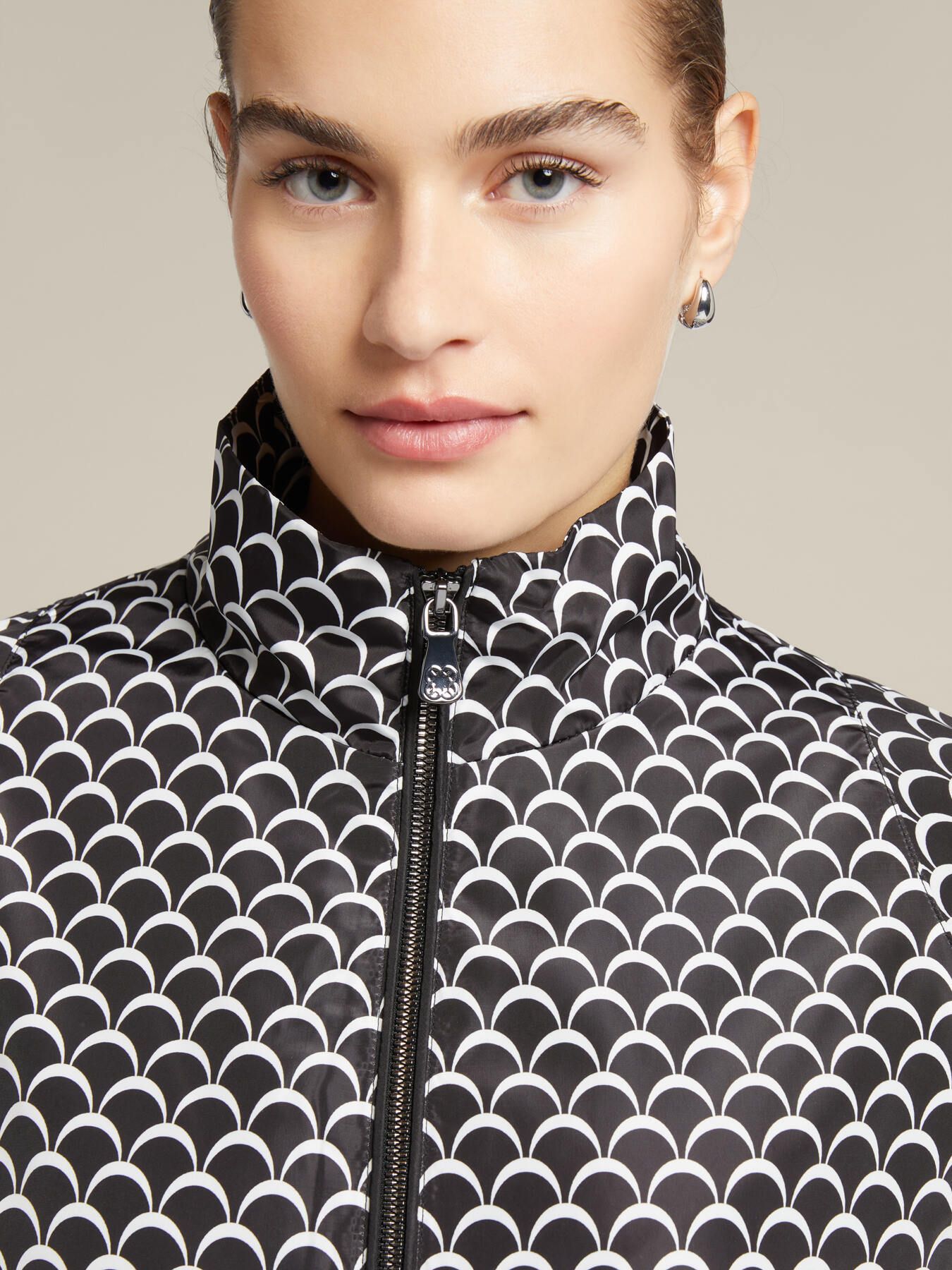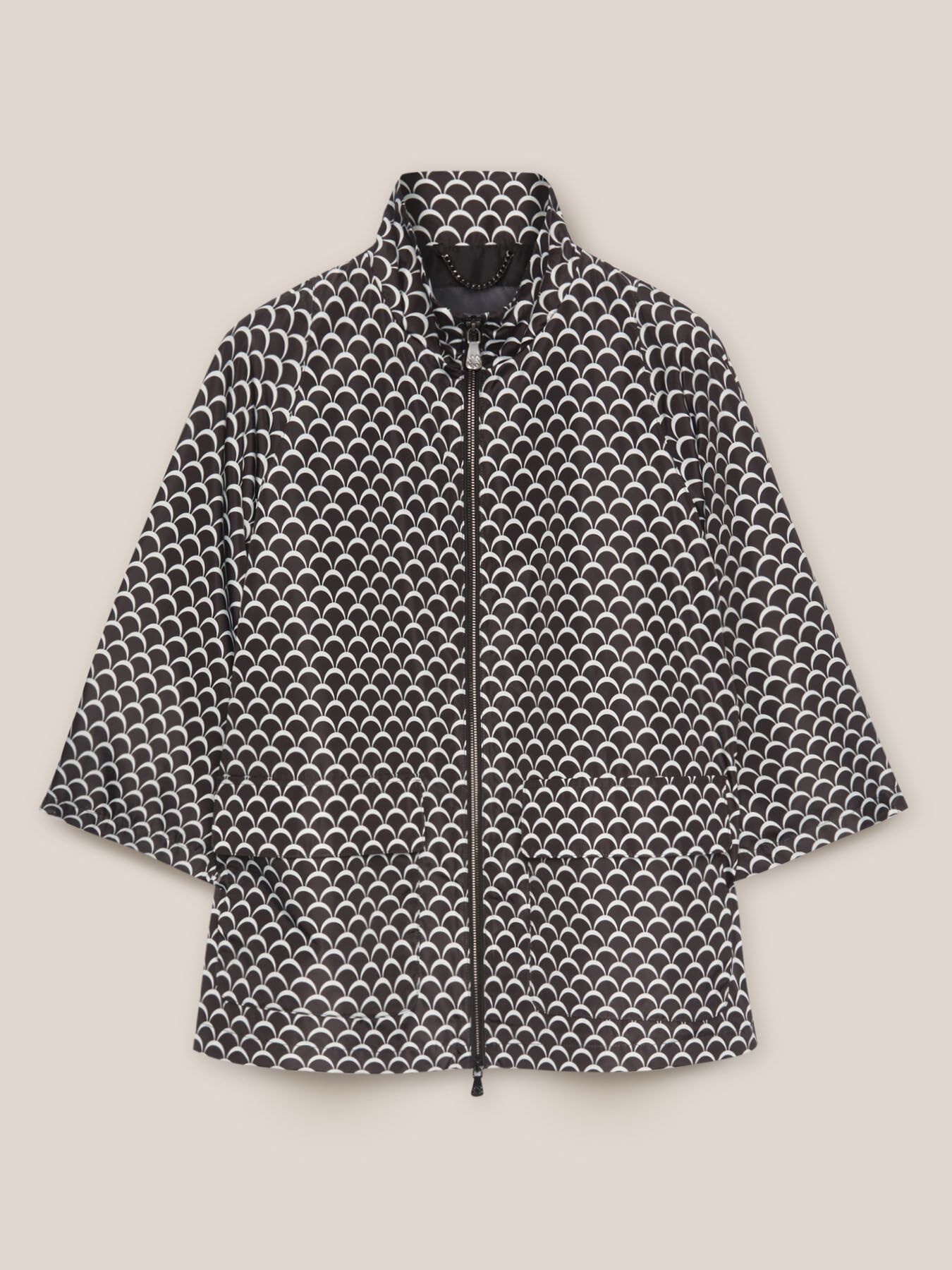 Куртка-ветровка с оригинальным геометрическим принтом. Воротник-стойка, накладные карманы, мягкий пояс, расклешенные рукава три четверти, застегивается на молнию. Модель идеальна на каждый день и незаменима в течение всего весенне-летнего сезона. Размер на модели: 46 RUS (44 IT) Параметры модели: рост 178 см, грудь 92 см, талия 66 см, бедра 101 см.