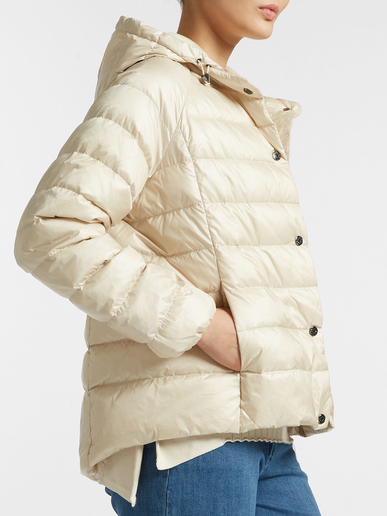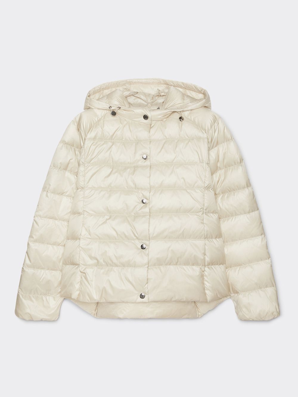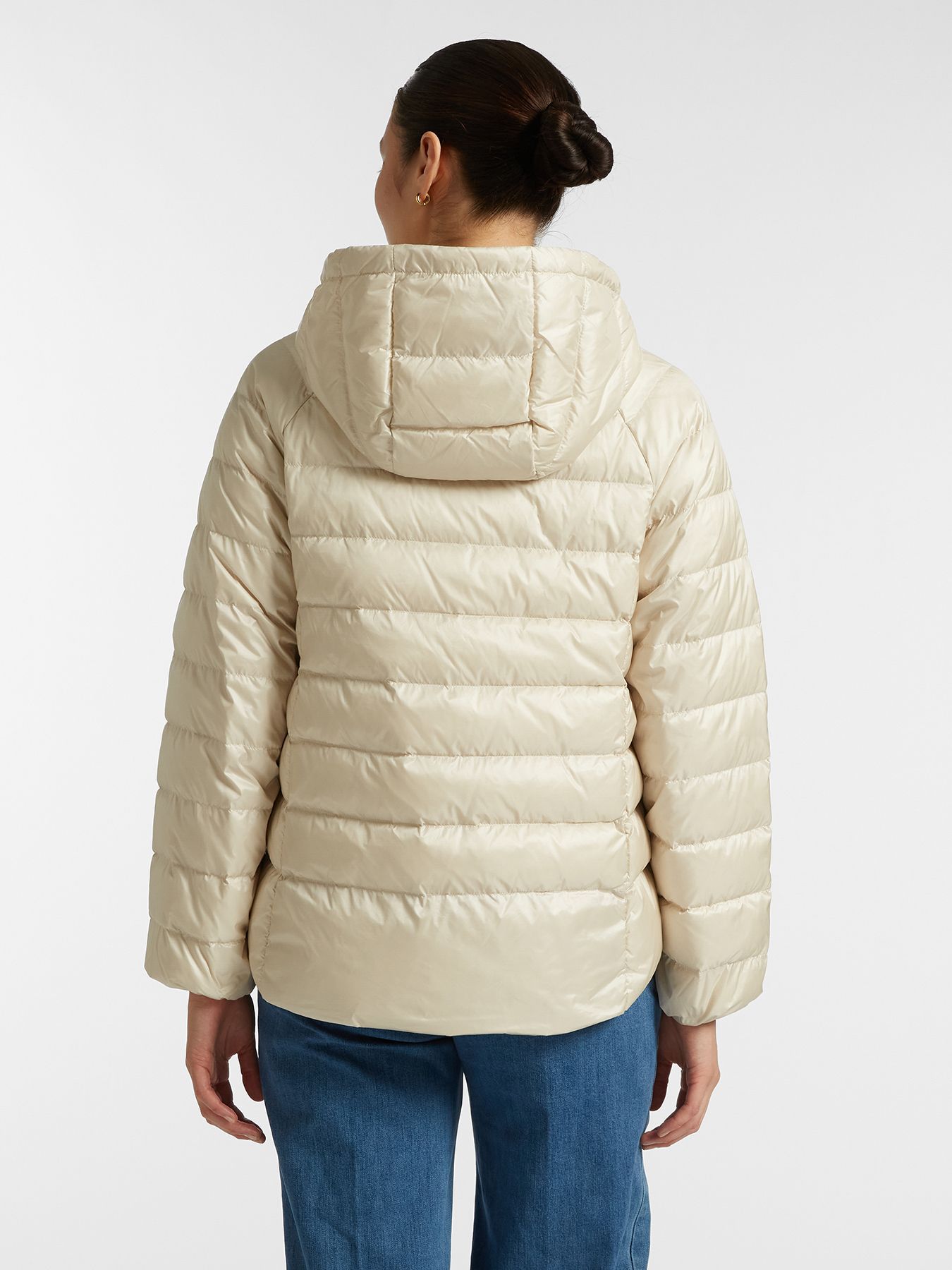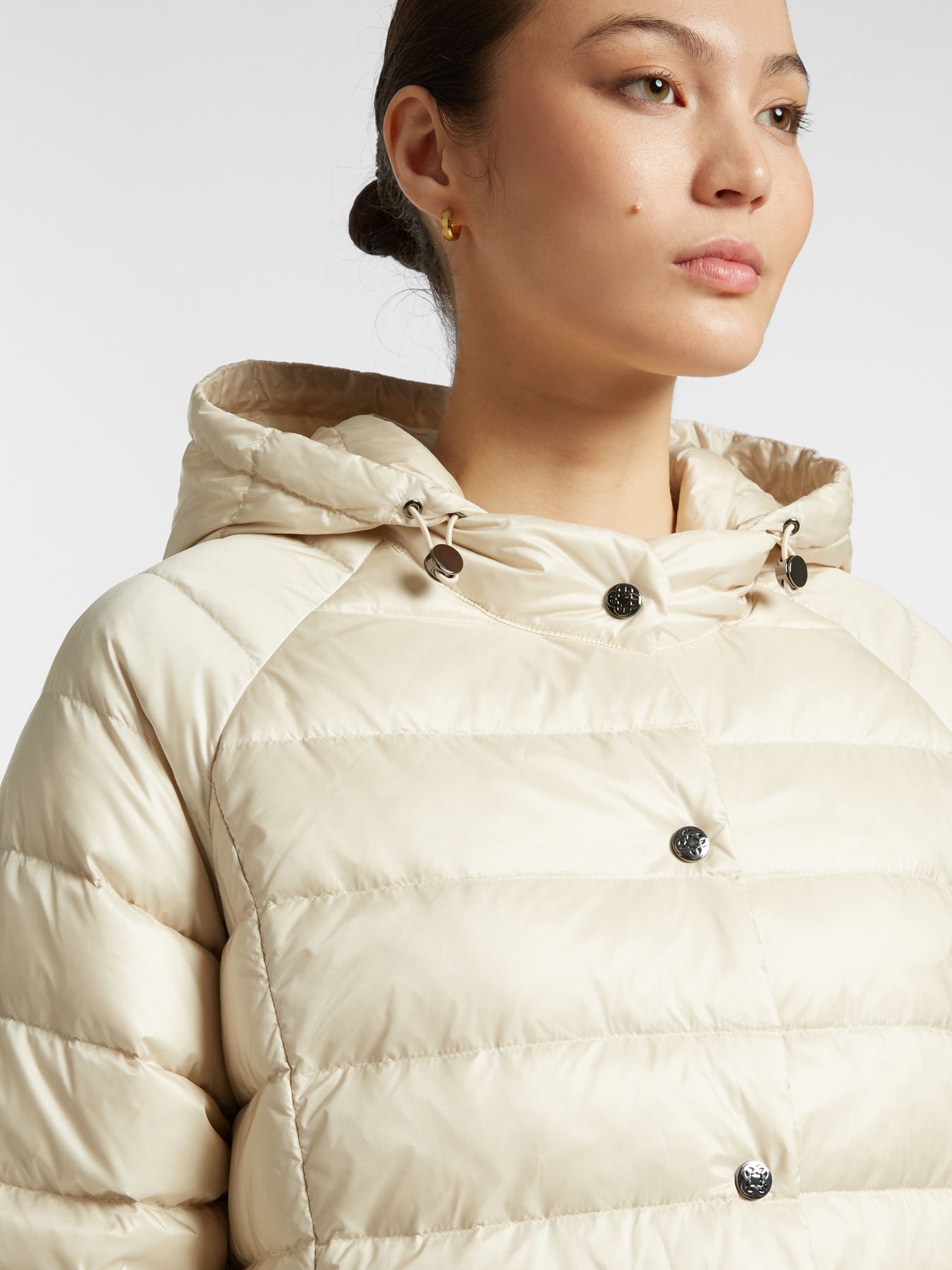 Элегантная куртка из водонепроницаемого нейлона с пуховым наполнением. Горизонтальная стежка визуально дополняет дизайн изделия.