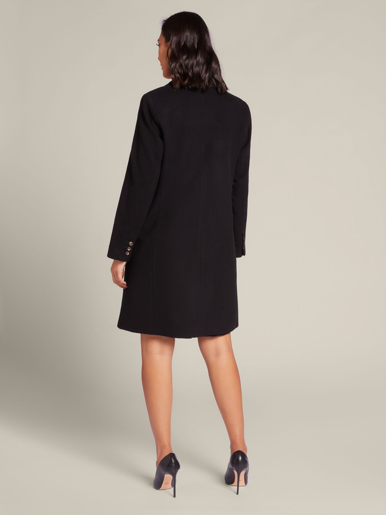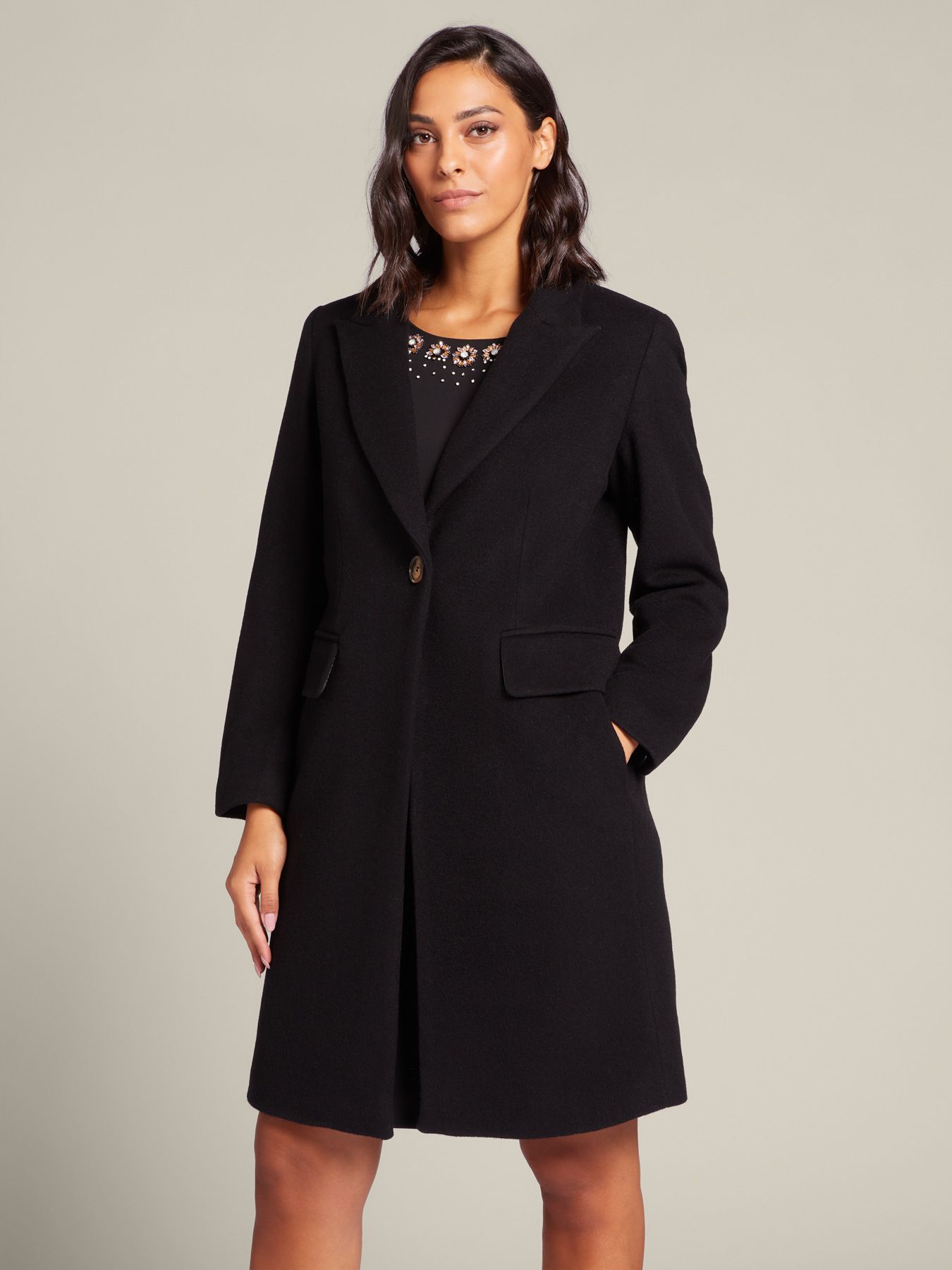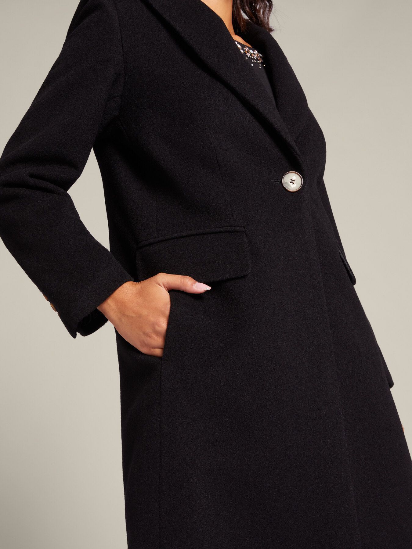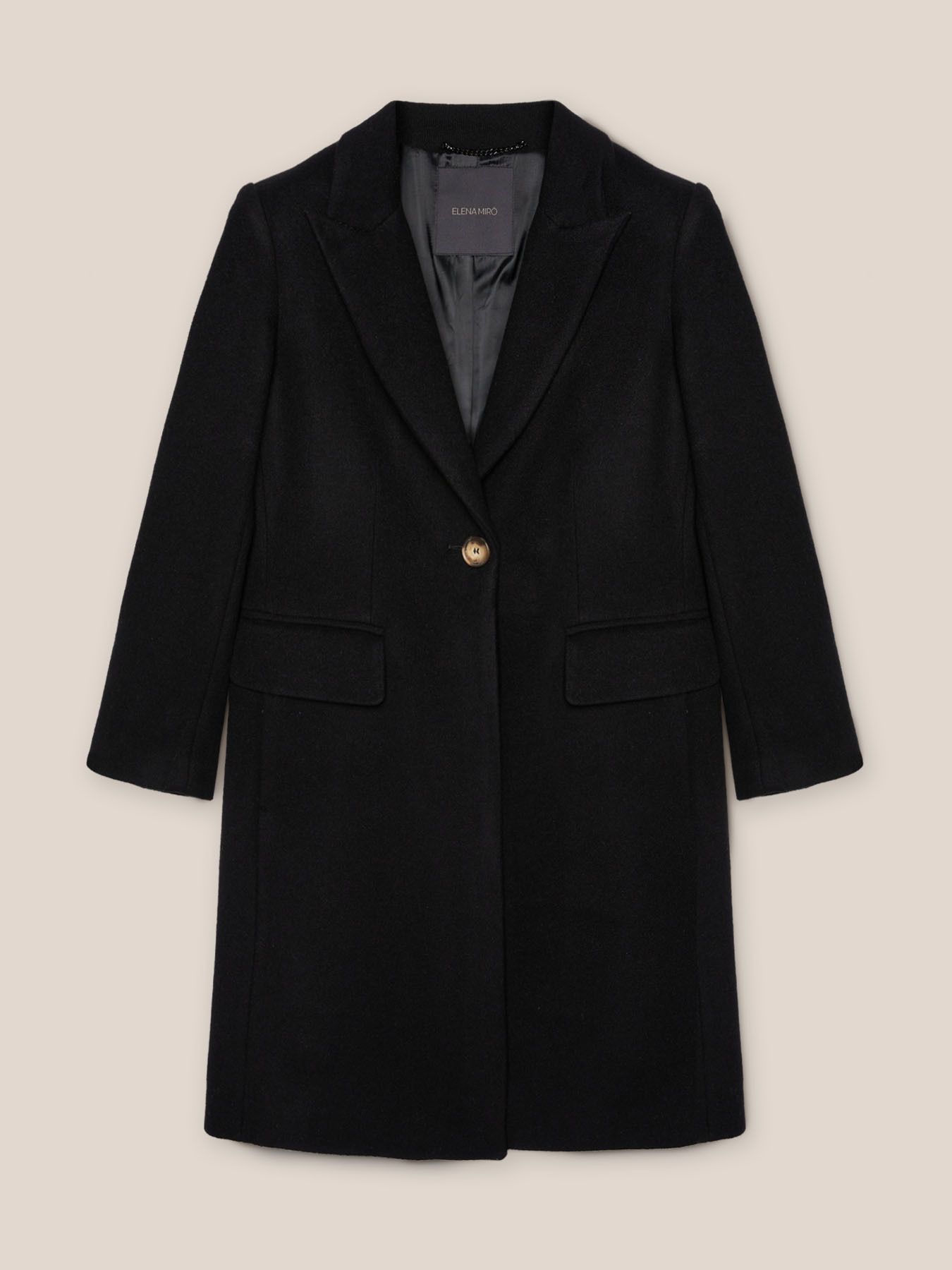 Классическое однобортное пальто слегка приталенного кроя. Английский воротник с лацканами, прорезные карманы с клапанами, с подкладом из переливающейся саржи.