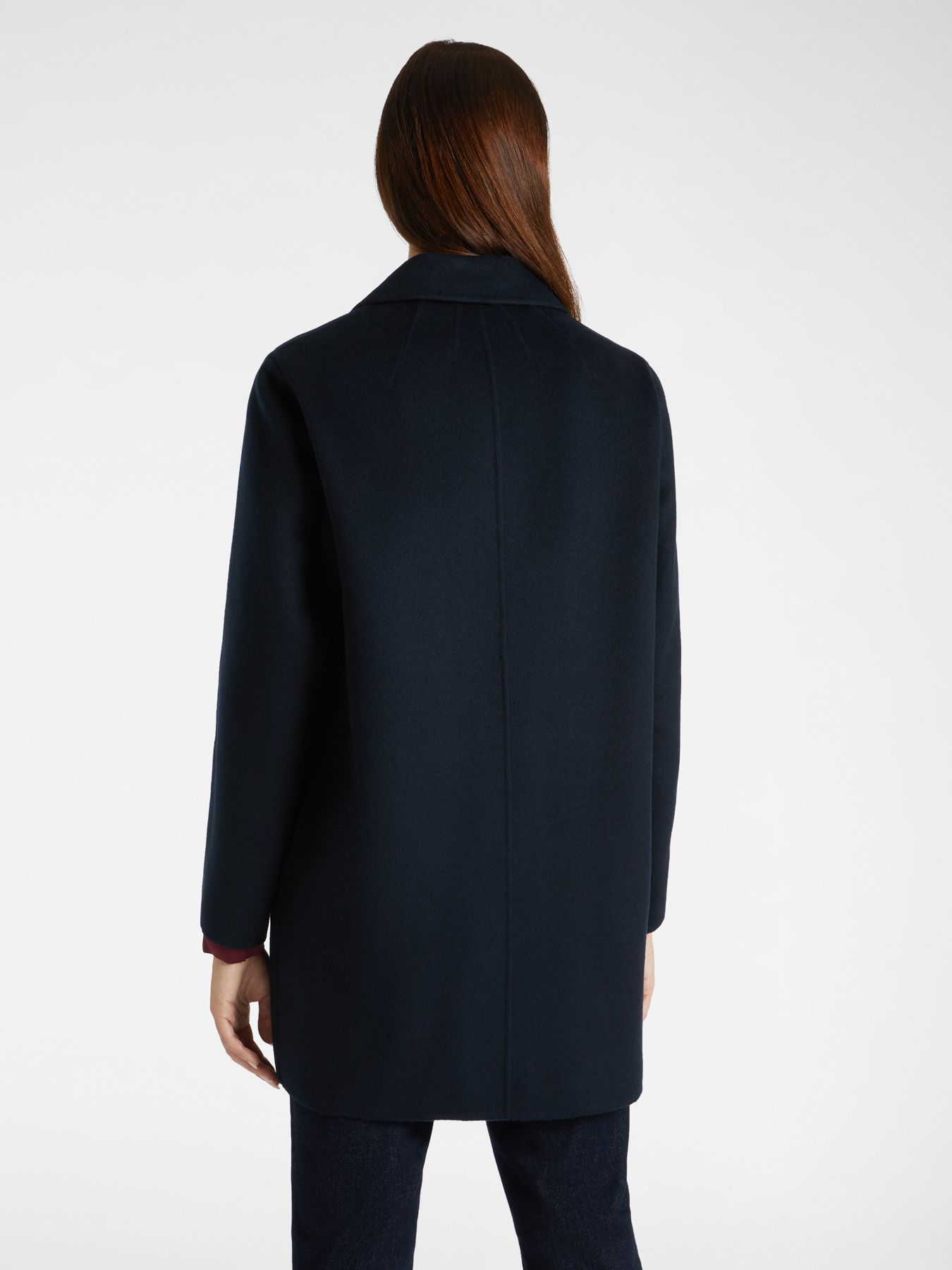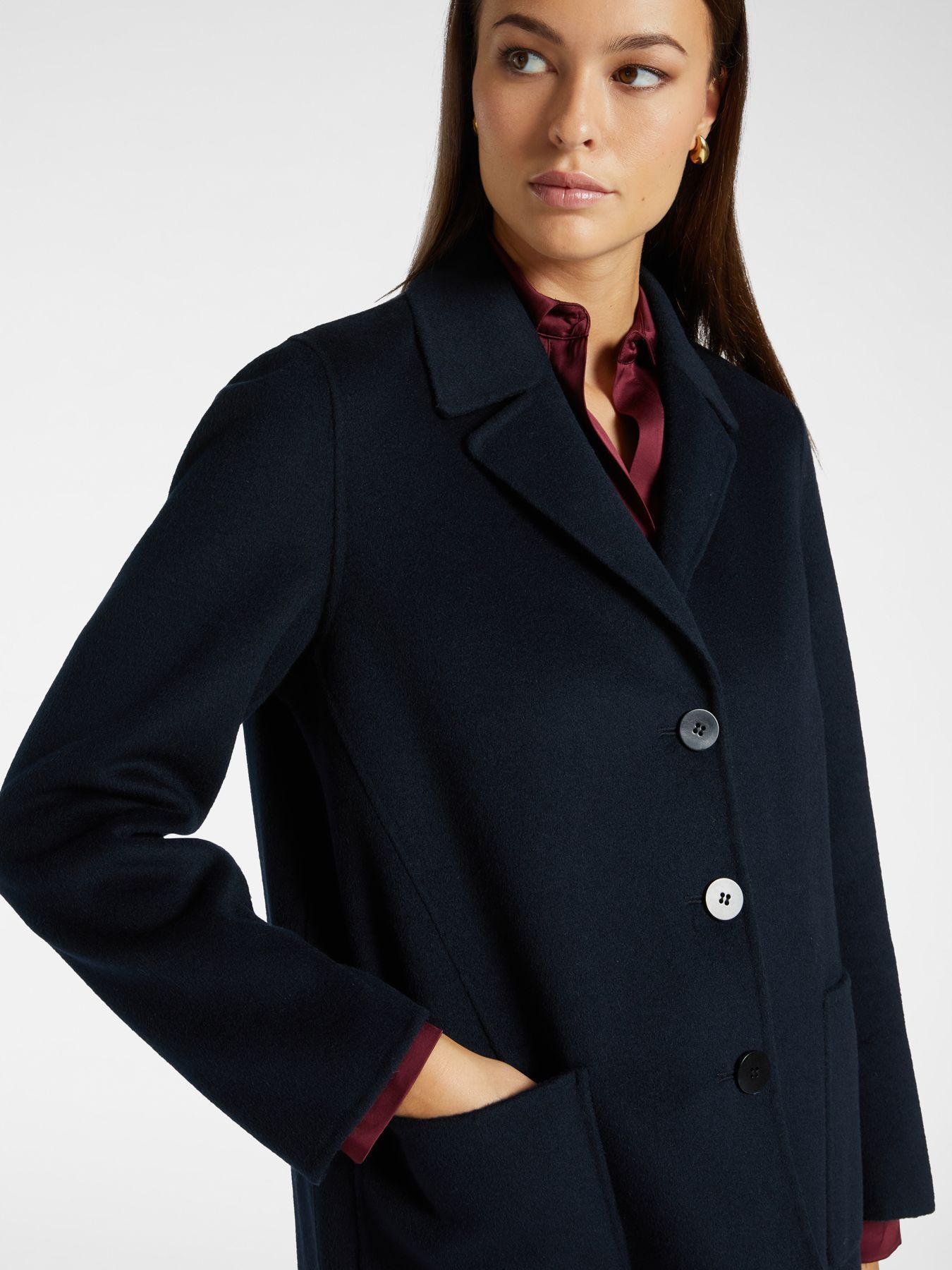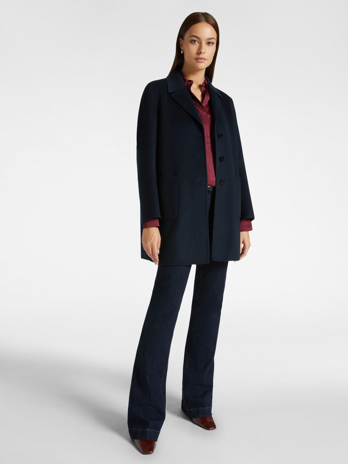 Элегантное пальто из шерсти. Прямой крой, английский воротник с лацканами, накладные карманы.