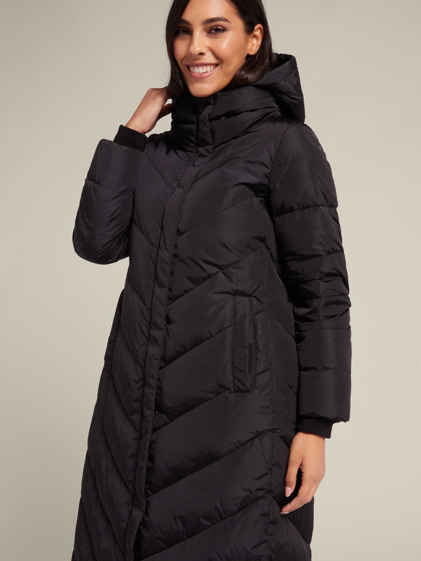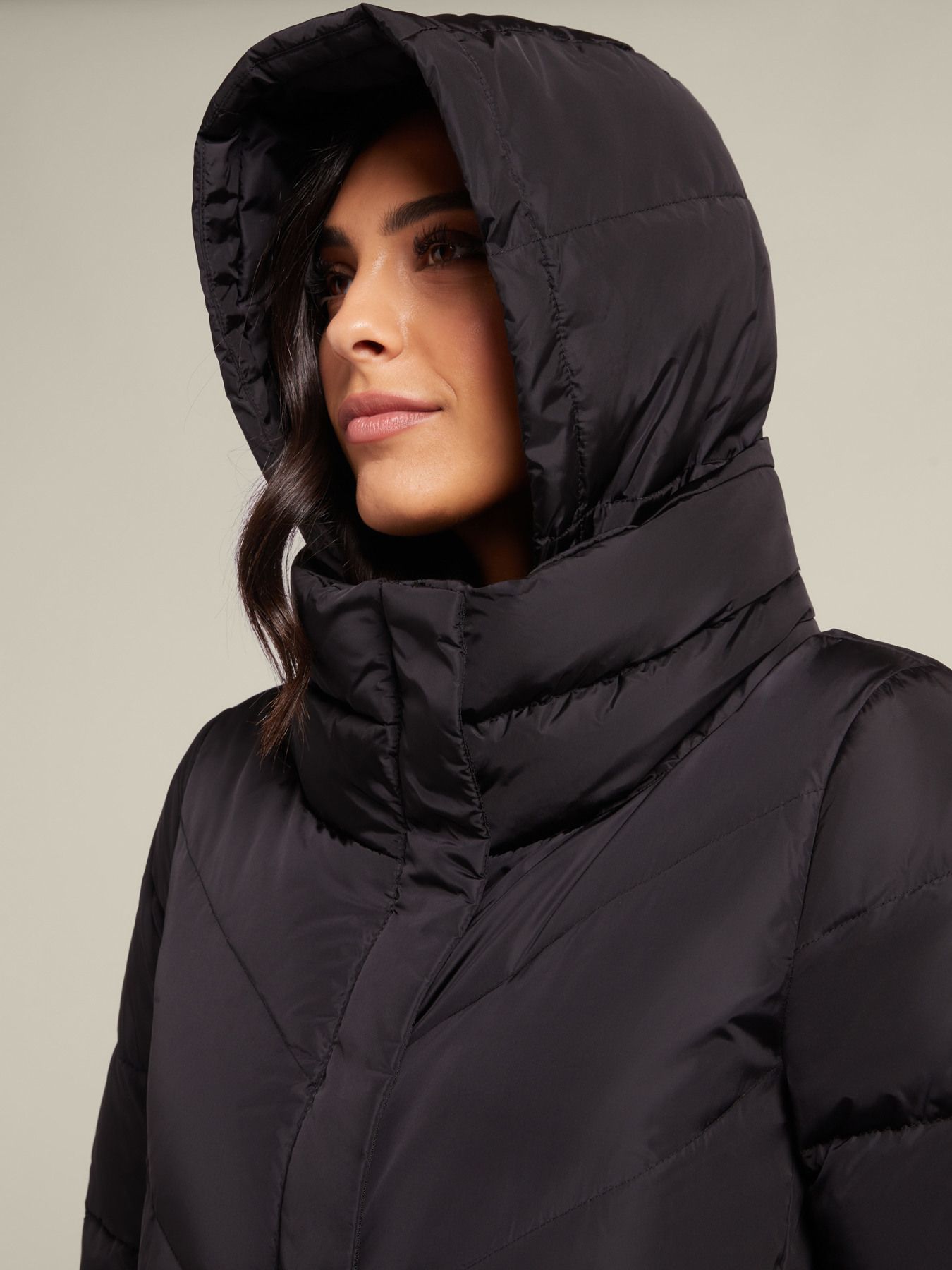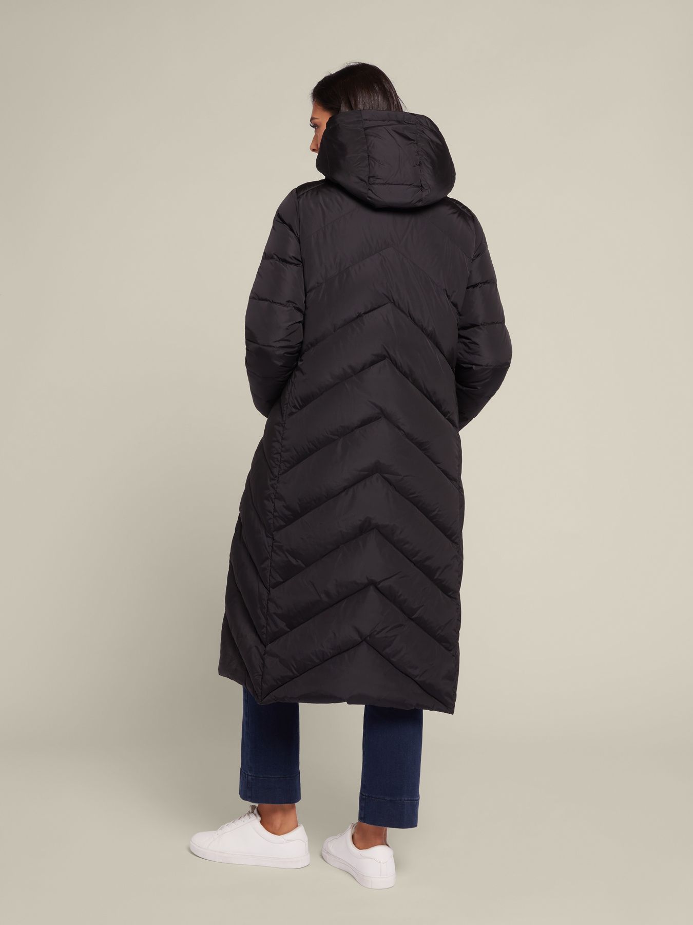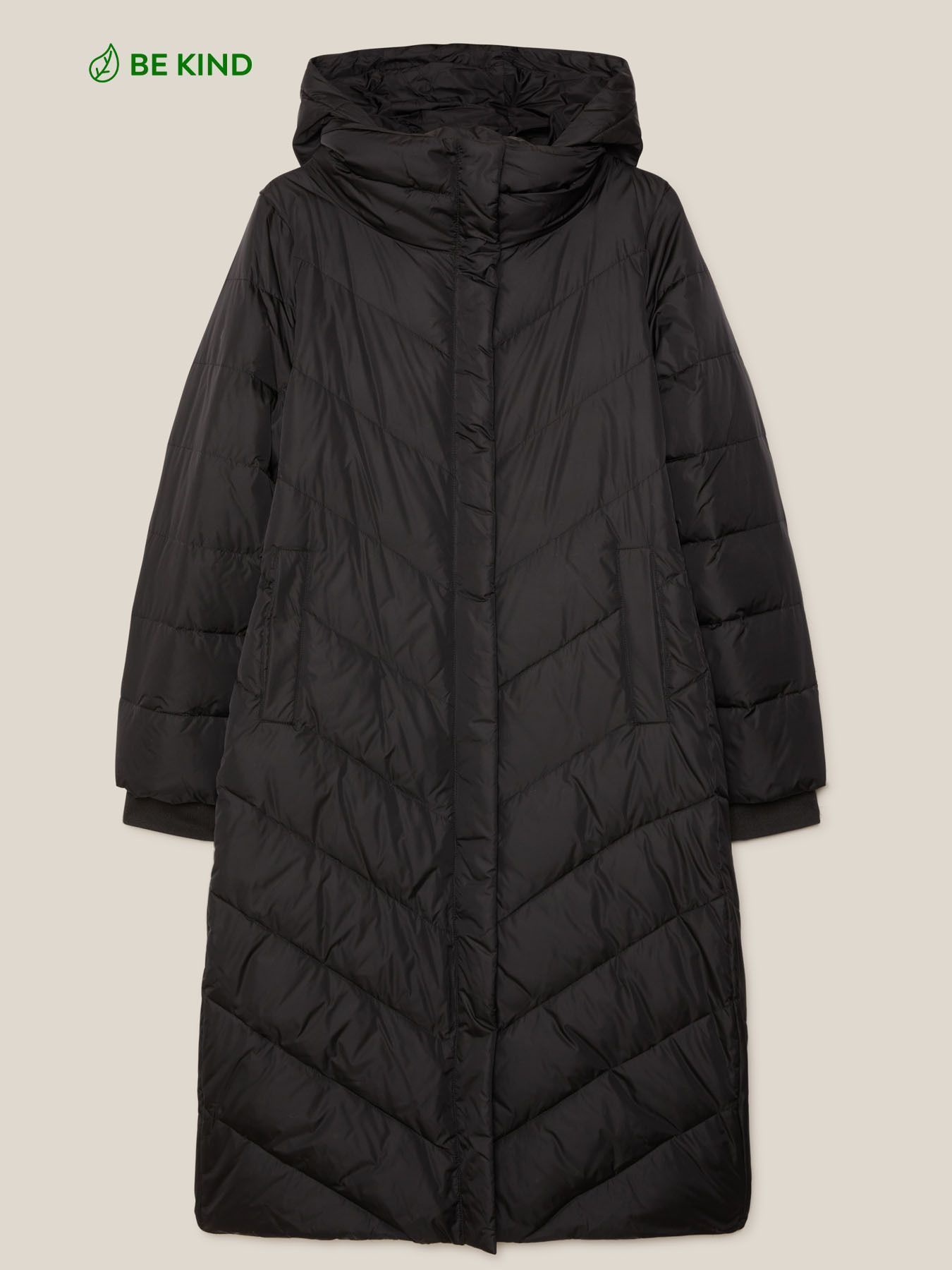 Длинное стеганое пуховое пальто из нейлона, расклешенного силуэта, с капюшоном. Мягкое, теплое, очень уютное, идеально подходящее даже для самых холодных температур. Карманы с клапанами на теплой подкладке; застежка на молнию и кнопки, высокий воротник, съемный капюшон на молнии.
