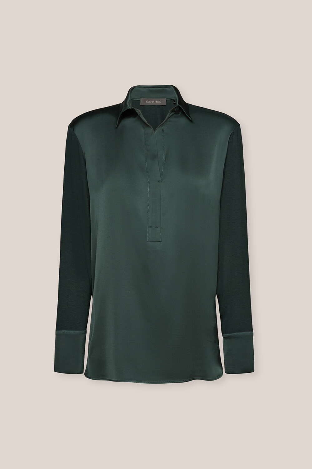 Базовая рубашка-поло с длинным рукавом из двух видов ткани – эластичного атласа и приятного трикотажа. Изделие украшено небольшими пуговицами с монограммой. Удобная и универсальная вещь, подходящая для повседневного гардероба.
