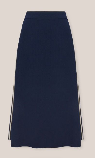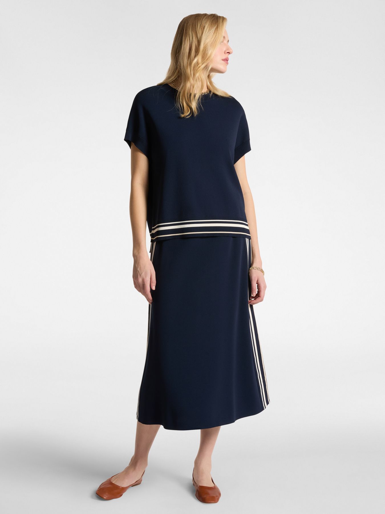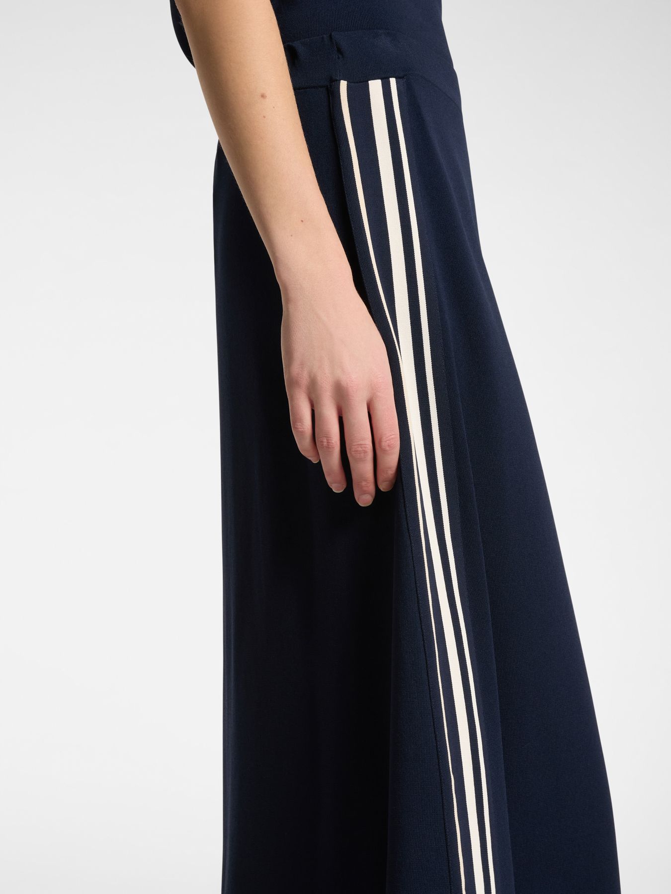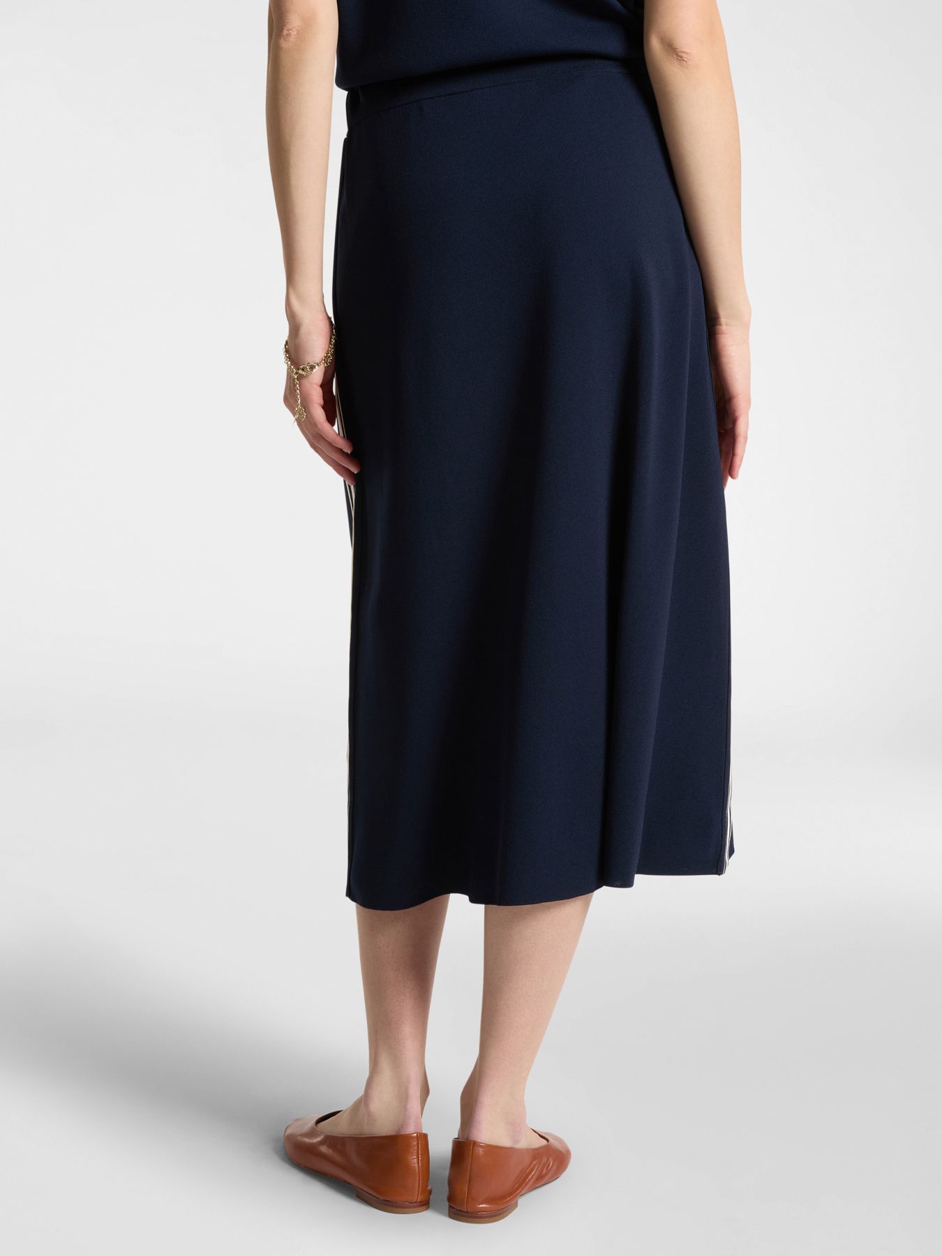 Трикотажная юбка миди А-силуэта из вискозного крепа в стиле спорт шик. Резинка на талии обеспечивает комфортную посадку. Изделие украшено контрастными полосками по бокам.