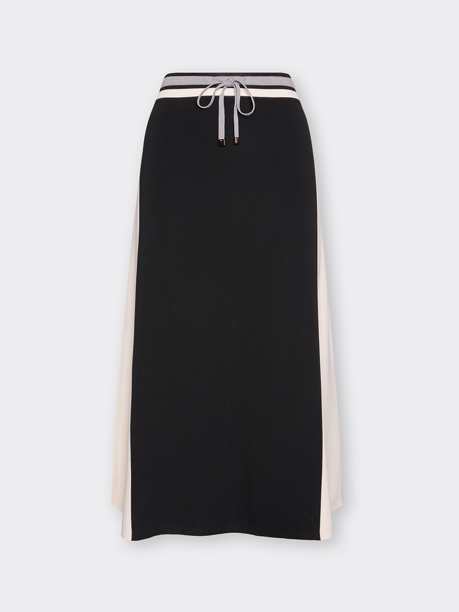 Расклешенная юбка-миди из смесовой вискозной пряжи в спортивном стиле. Контрастные лампасы и эластичный пояс на резинке. Изделие входят в капсулу «ATHLEISURE», объединяющую комфорт и удобство спортивного шика и изысканный стиль базовых изделий. Юбка прекрасно подходит для повседневных комфортных образов.