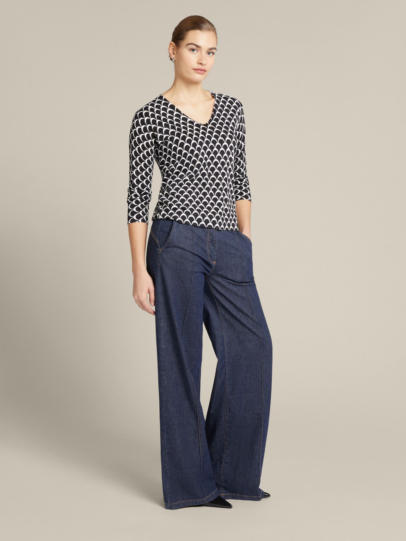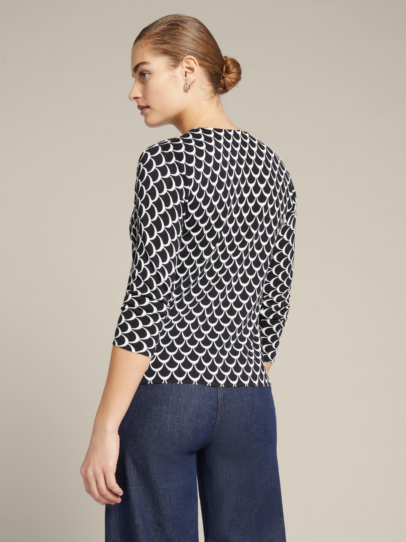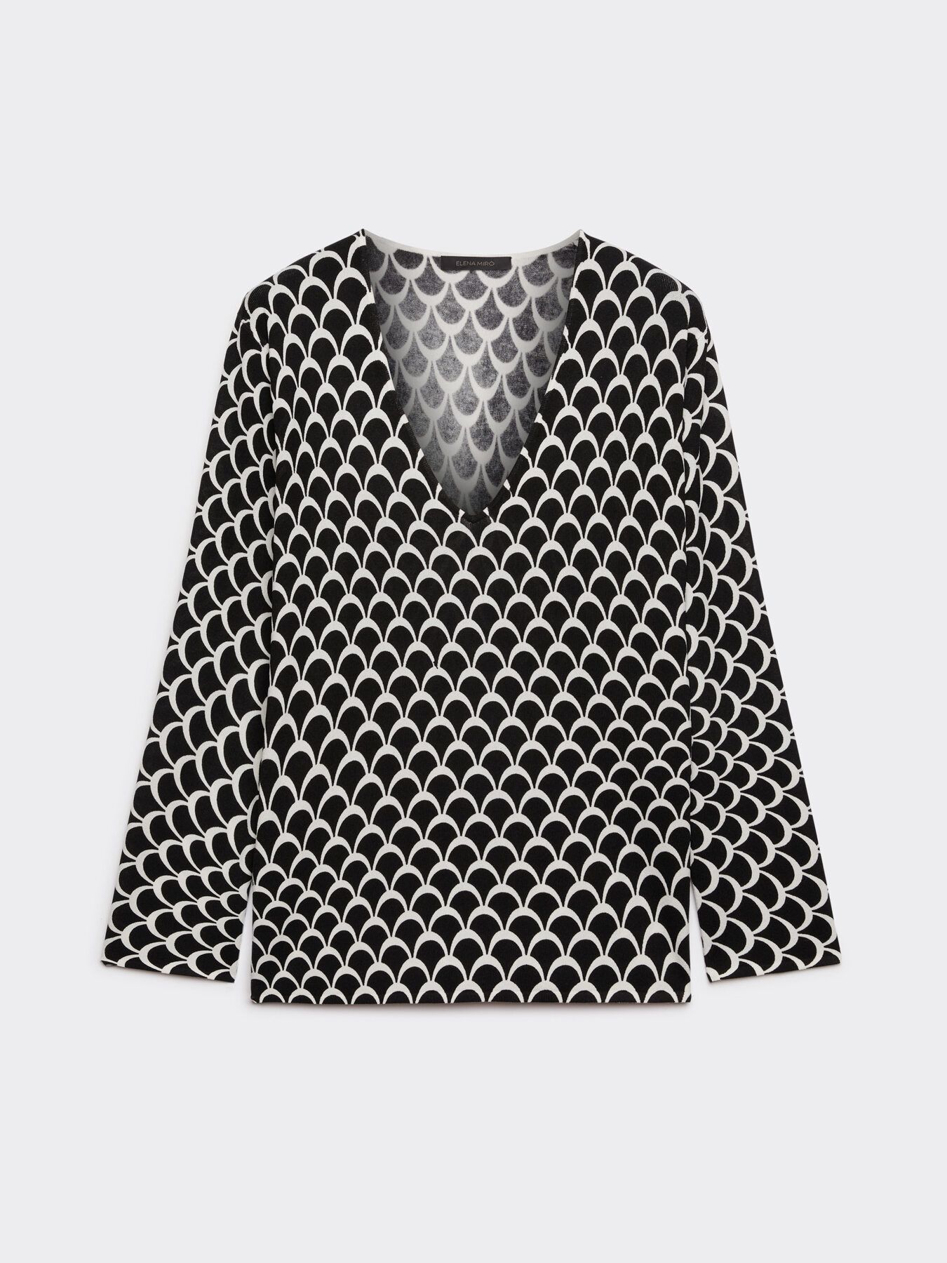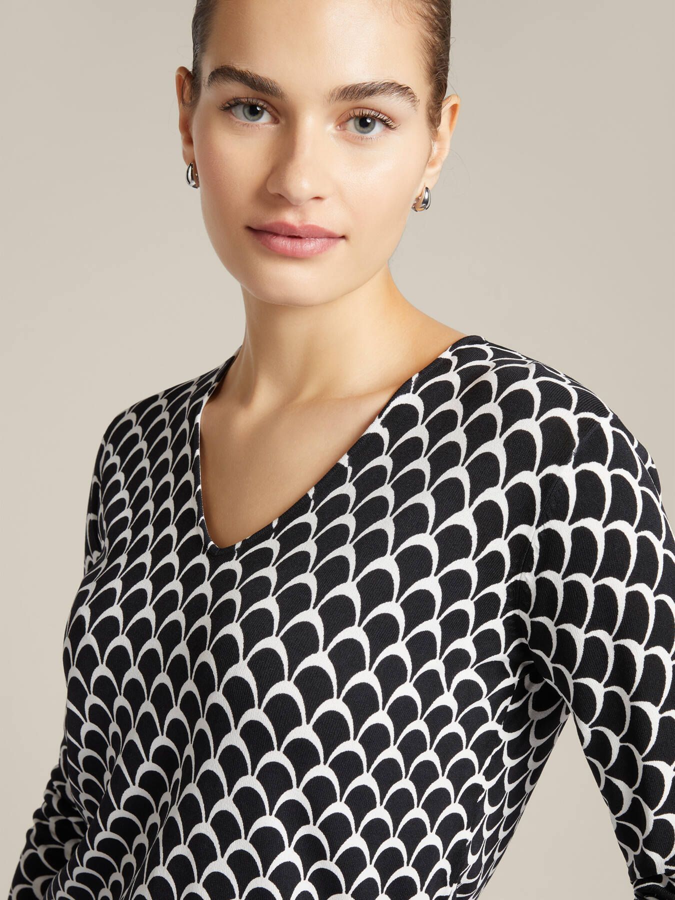 Элегантный пуловер с геометрическим принтом. V-образный вырез, длинный рукав, прямой силуэт. Размер на модели: 46 RUS (44 IT) Параметры модели: рост 178 см, грудь 92 см, талия 66 см, бедра 101 см.